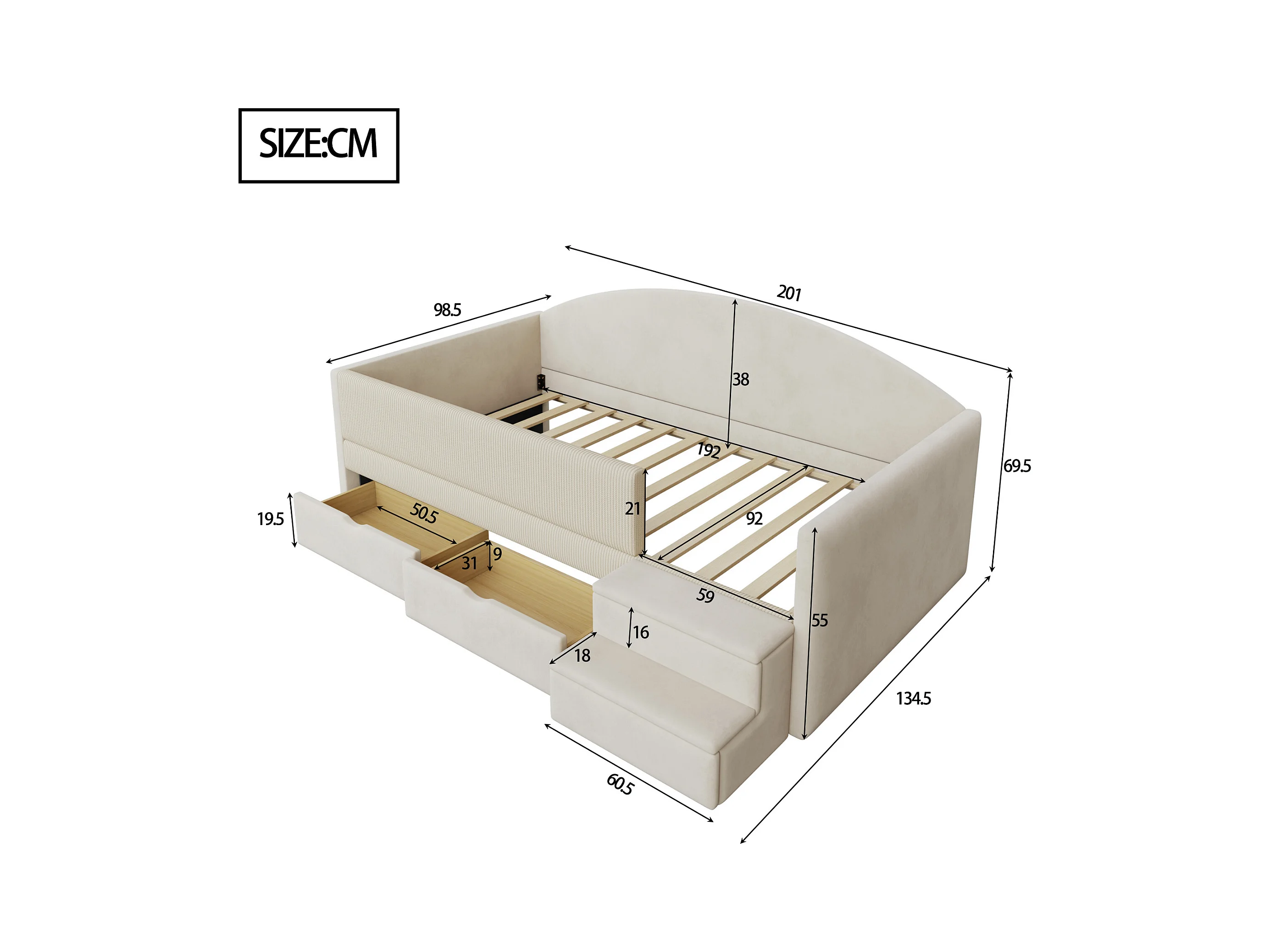 Sofa tapicerowana z funkcją spania - 90 x 190 cm - z 2 szufladami + drążkami + schodkami - welur - beż