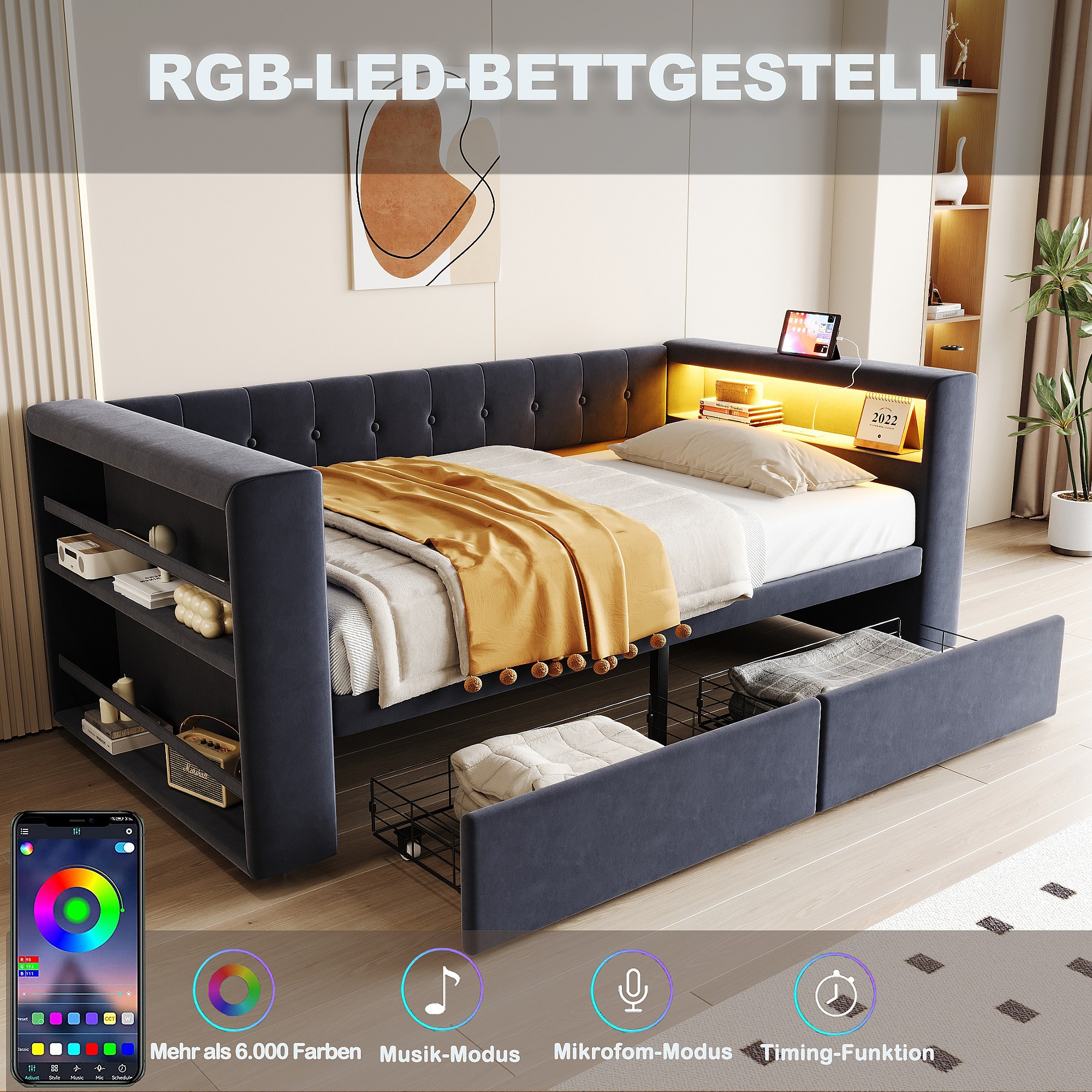 Sofa tapicerowana z funkcją spania - 90 x 190 cm - z oświetleniem LED + gniazdko + 2 szuflady + półka - Flanela - ciemnoszara