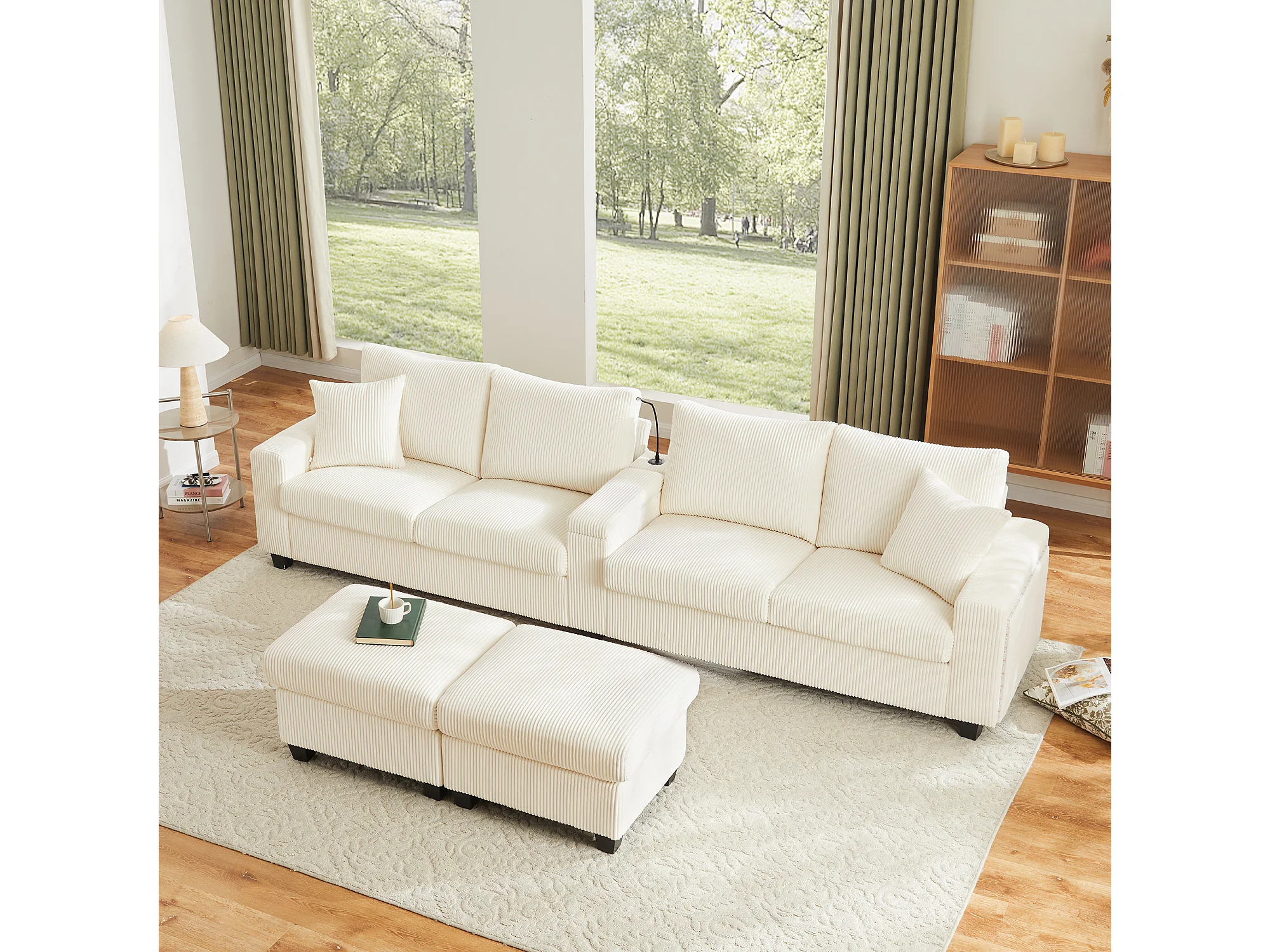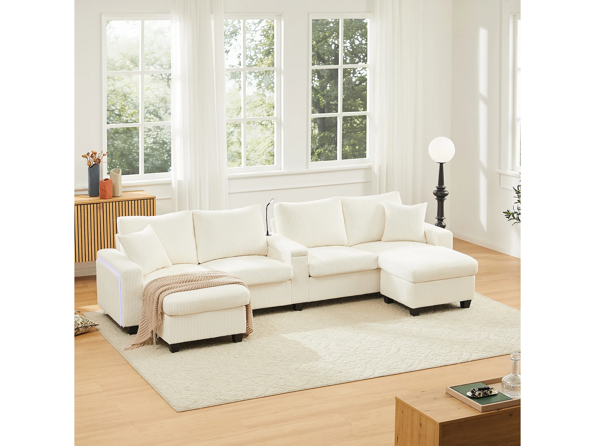 Sofa w kształcie litery U - 334 x 128,5 x 81 cm - z 2 stołkami + lampka do czytania + schowek + USB + diody LED - aksamitna - beżowa