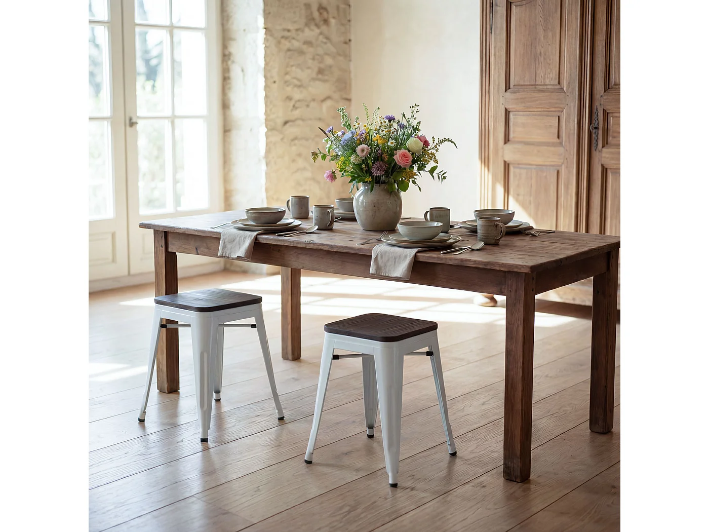 Taboret MCW-A73 (zestaw 2 szt.) Drewniane siedzisko, biały