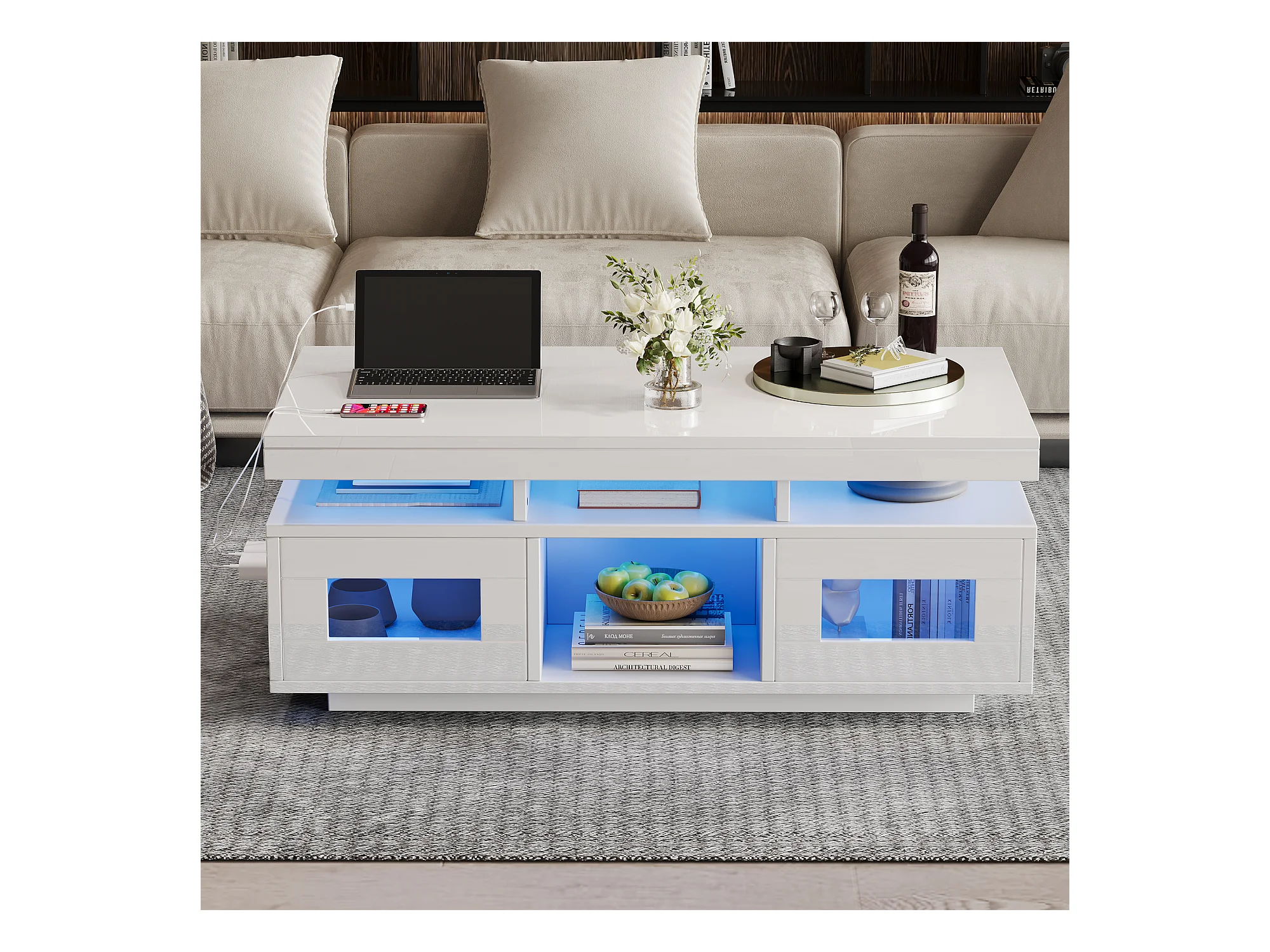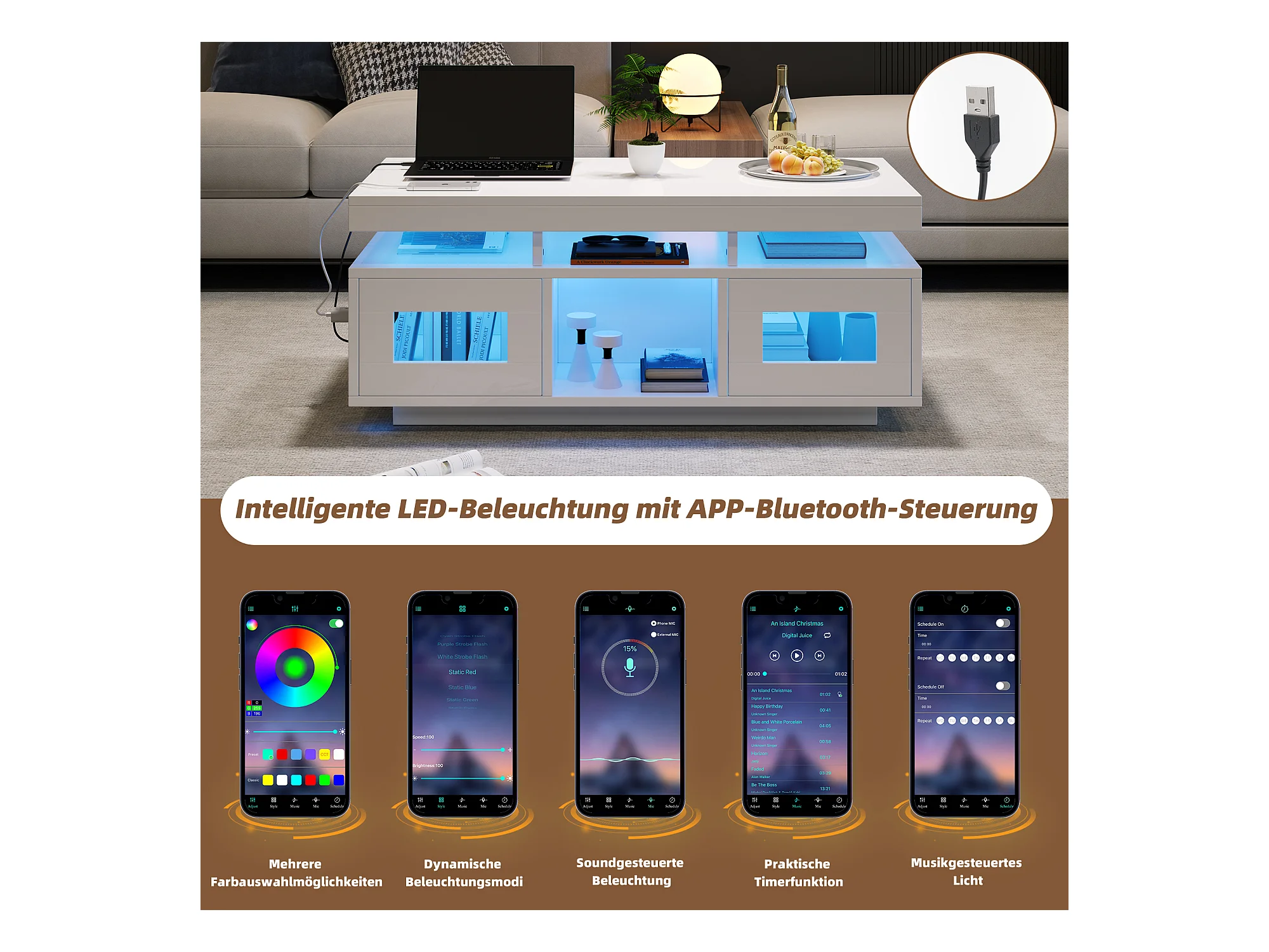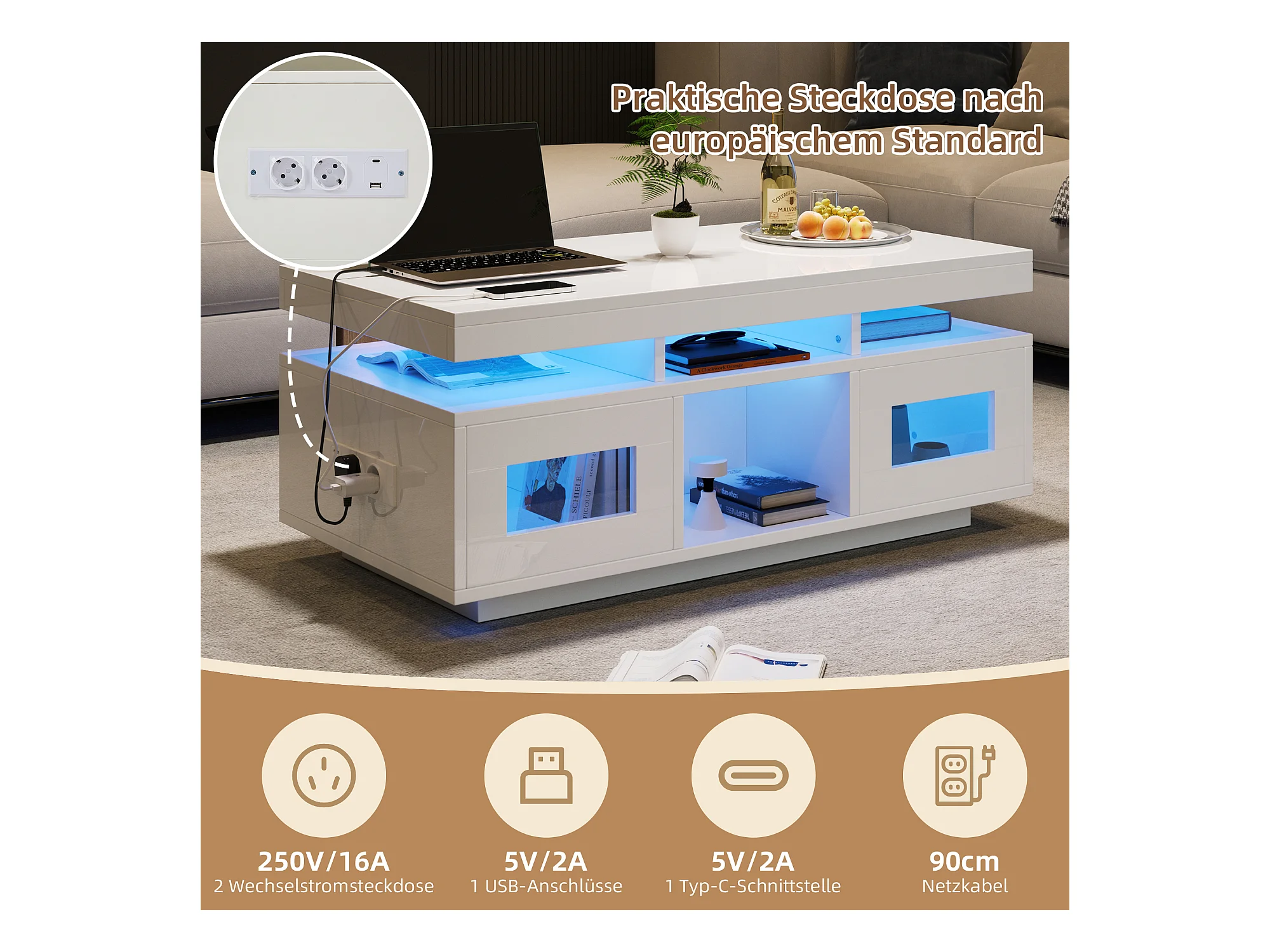 Stolik kawowy błyszczący - 100 x 50 x 43 cm - z diodami LED + 2 drzwi + port ładowania i gniazdo - płyta wiórowa - biały