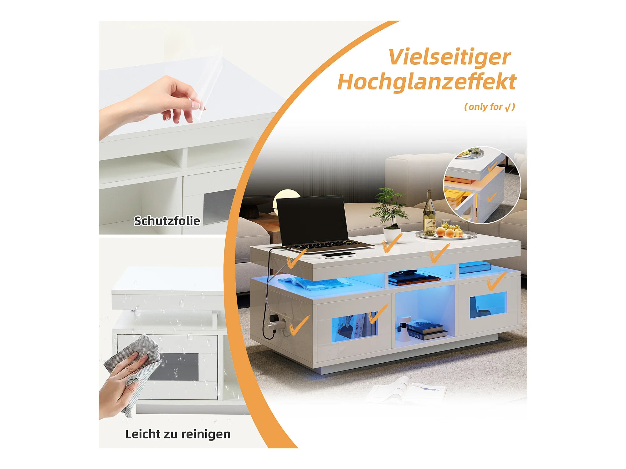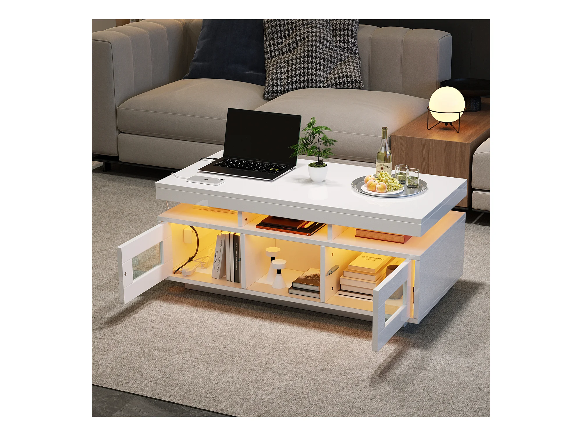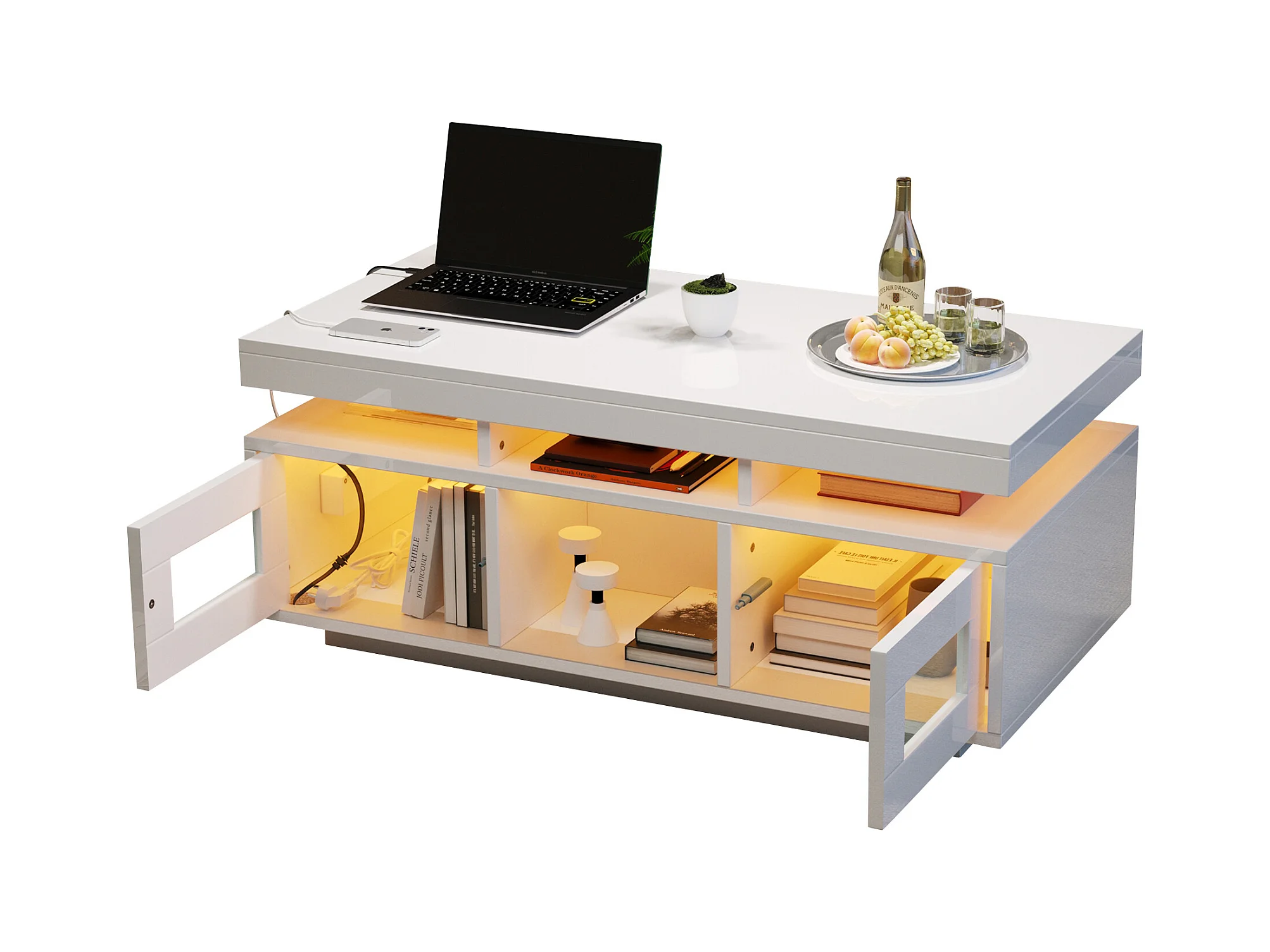 Stolik kawowy błyszczący - 100 x 50 x 43 cm - z diodami LED + 2 drzwi + port ładowania i gniazdo - płyta wiórowa - biały
