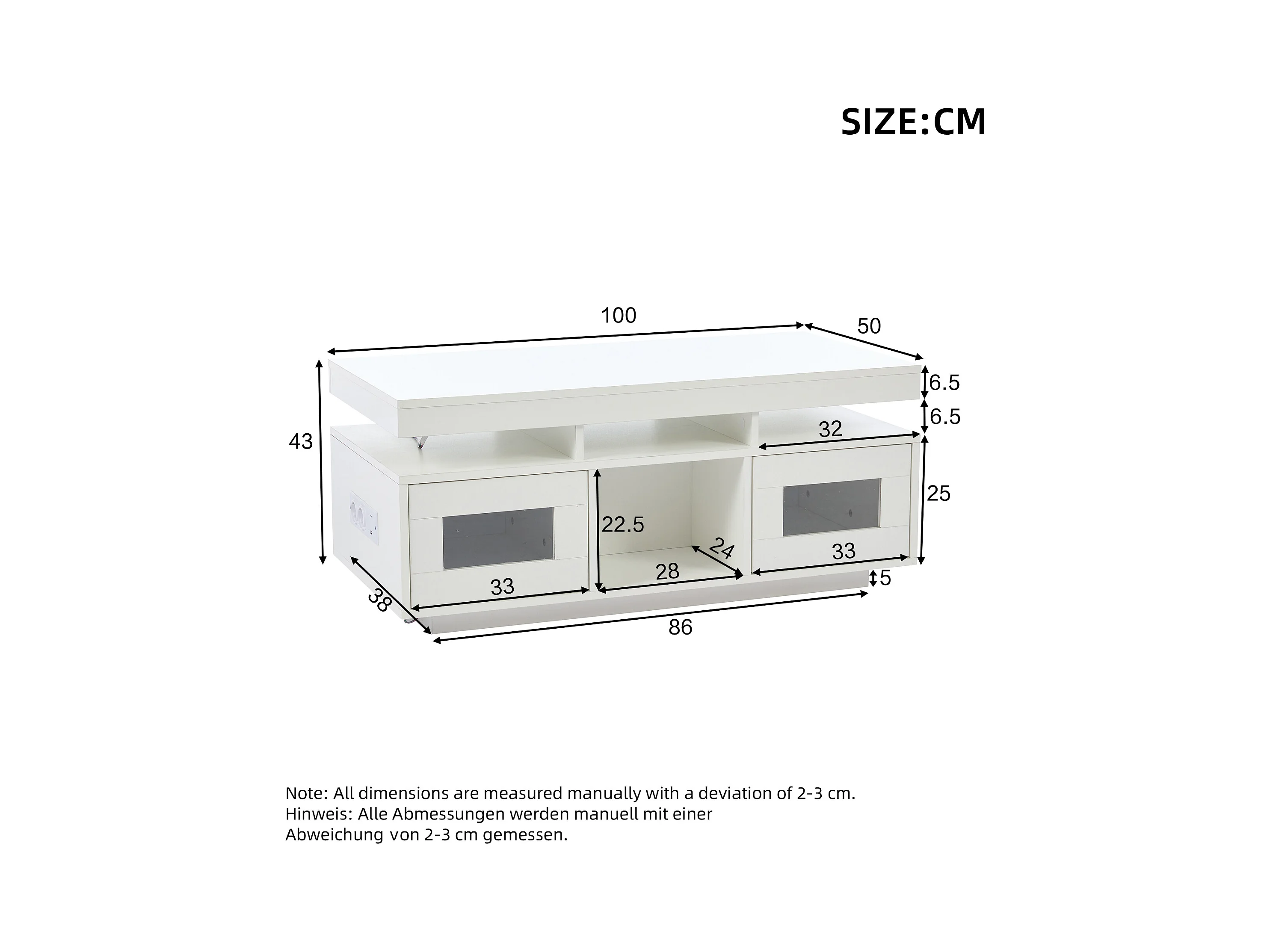 Podnoszony stolik kawowy - 120 x 50 x 46 cm - ukryte miejsce do przechowywania + diody LED + 2 szuflady - płyta MDF + szkło hartowane - biały
