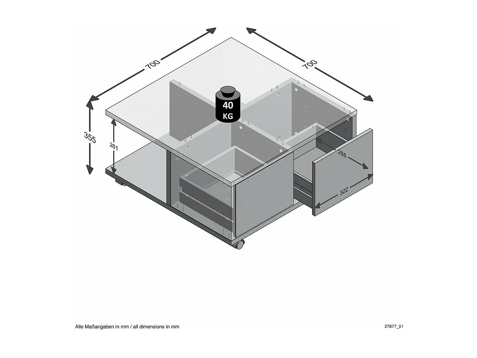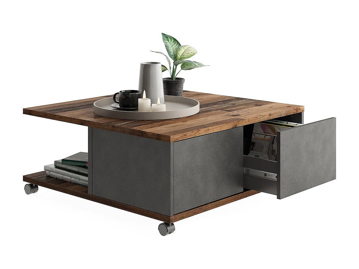 Stolik kawowy na kółkach 2 szuflady 2 wnęki L70 cm - Twin