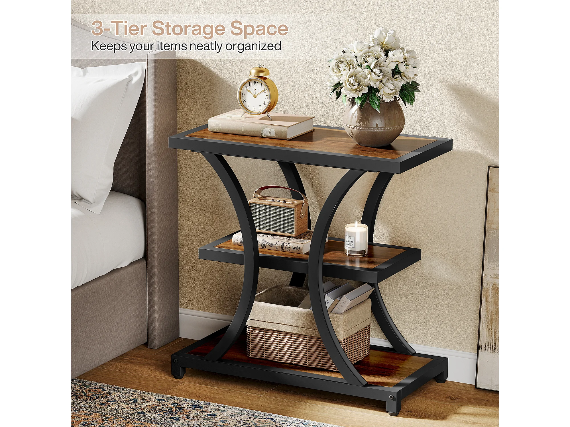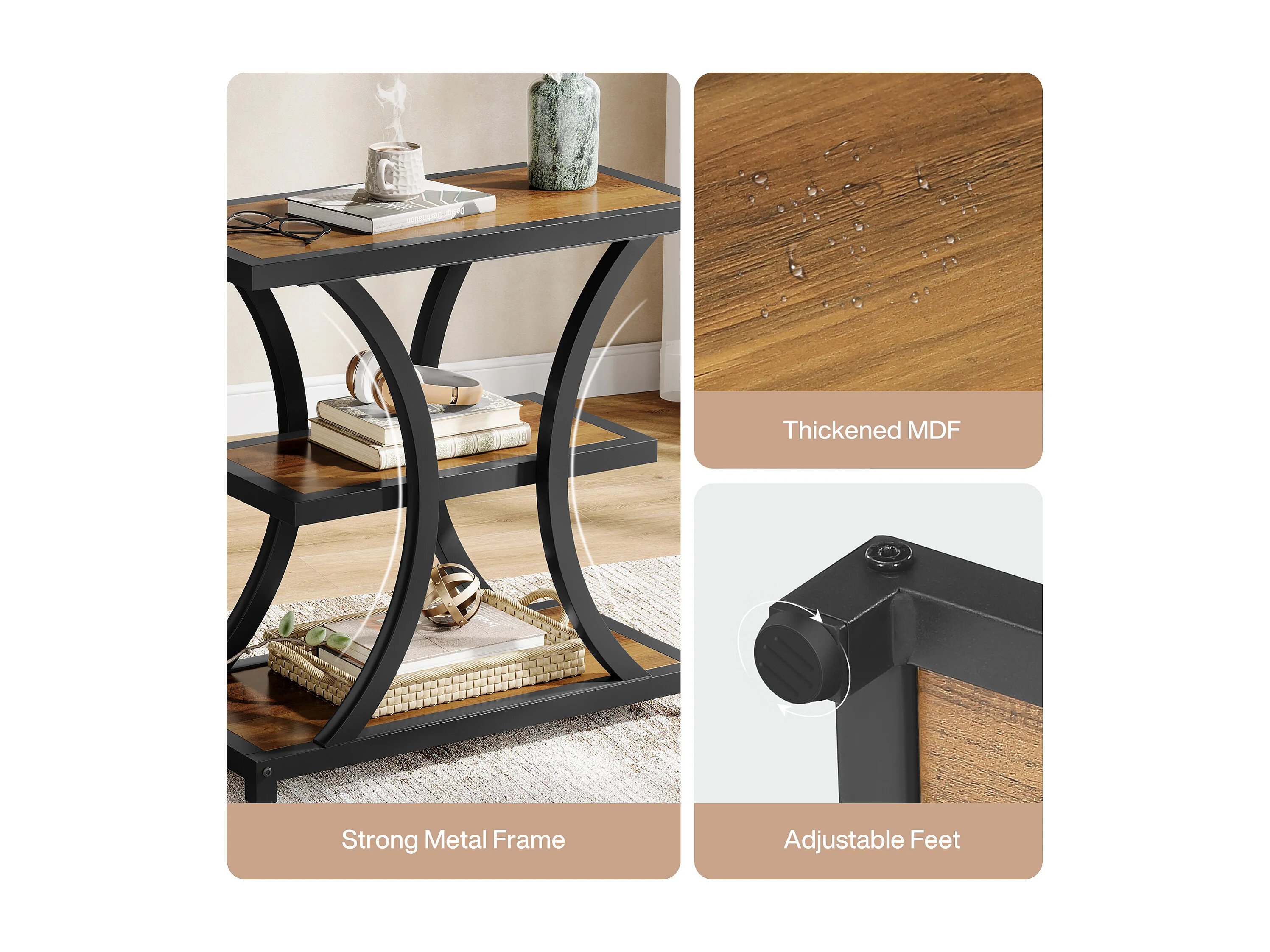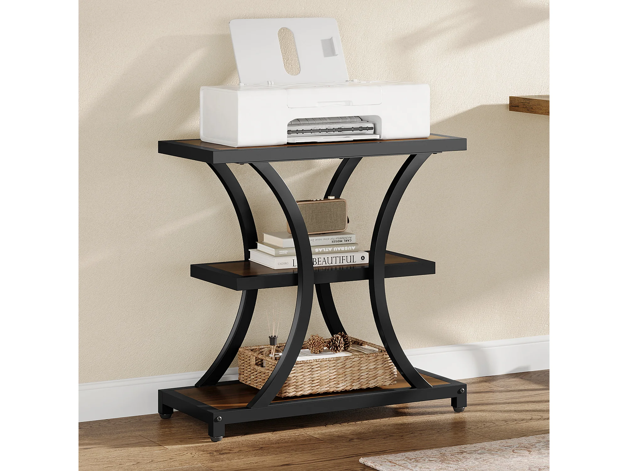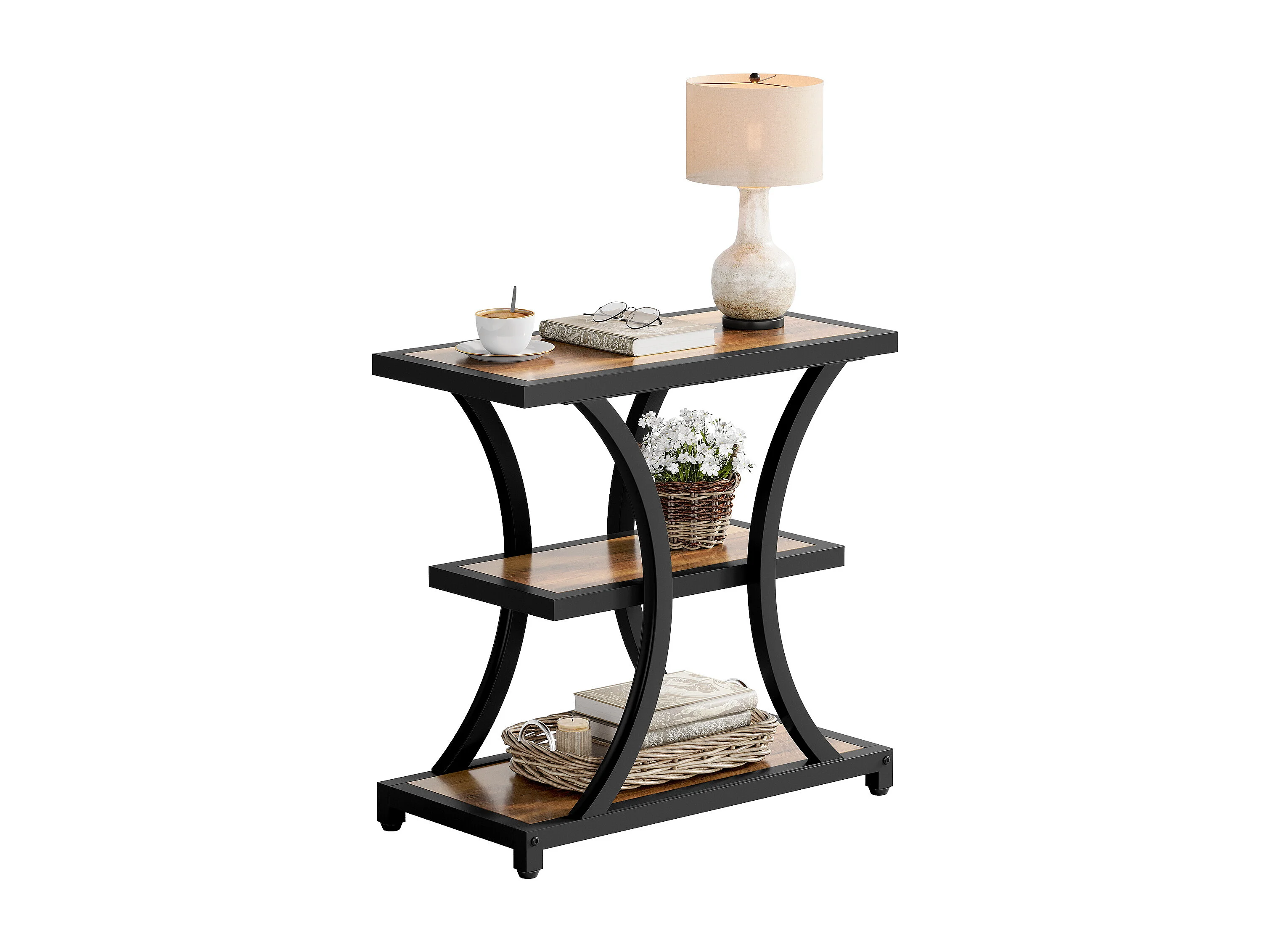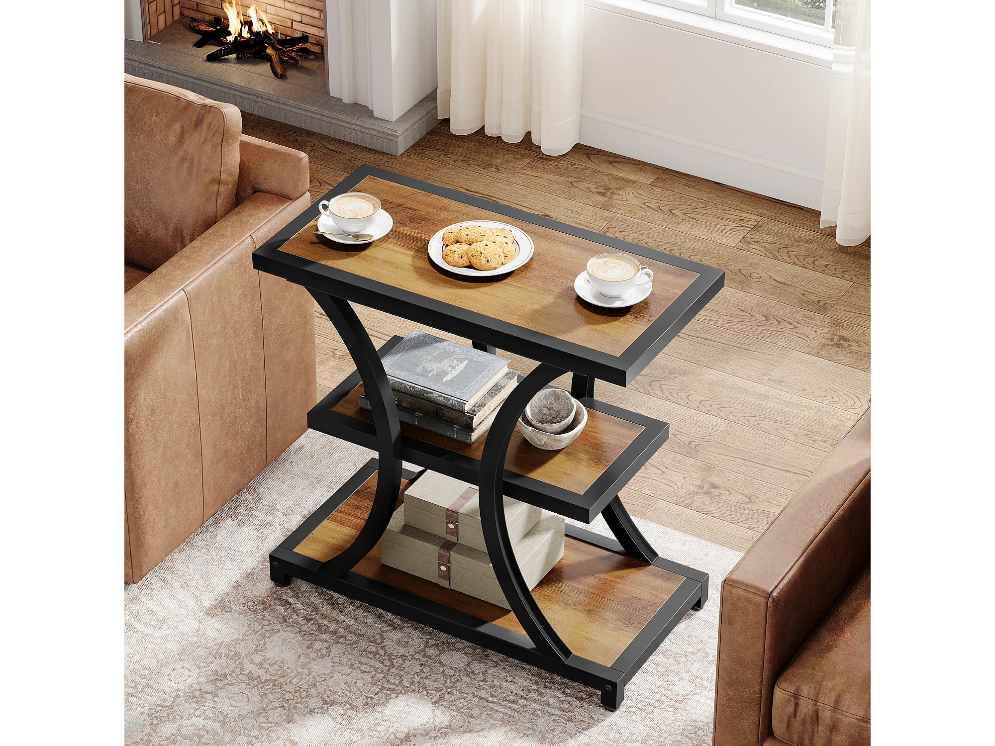 Stolik kawowy z miejscem do przechowywania, 3-poziomowy stolik boczny z geometrycznym metalowym wzorem, w stylu industrialnym