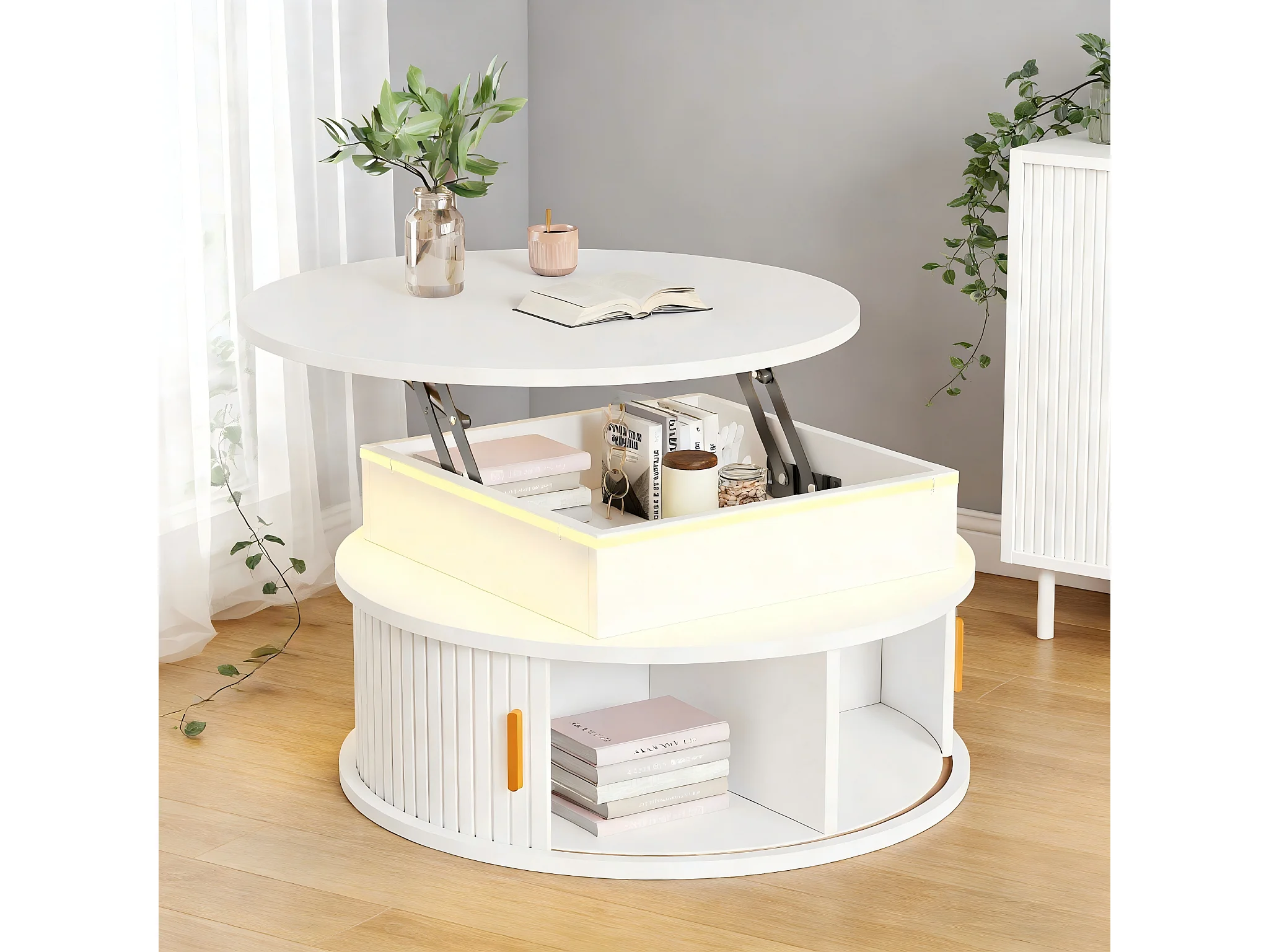 Stolik kawowy z podnoszonym blatem, lakierowany na wysoki połysk, 75 x 75 x 52 cm, z diodami LED + 2 drzwiami rolowanymi + schowek, płyta MDF, biały