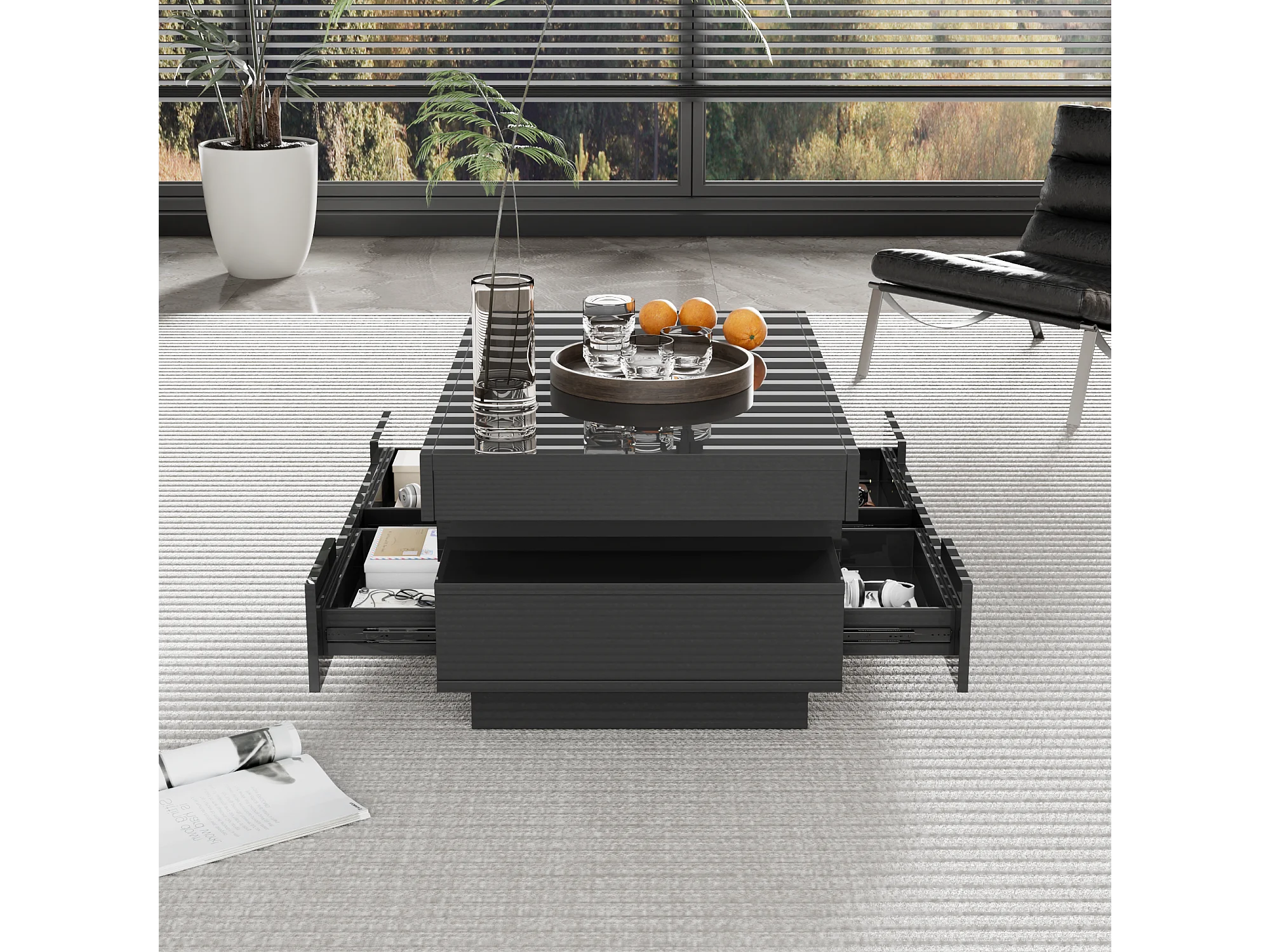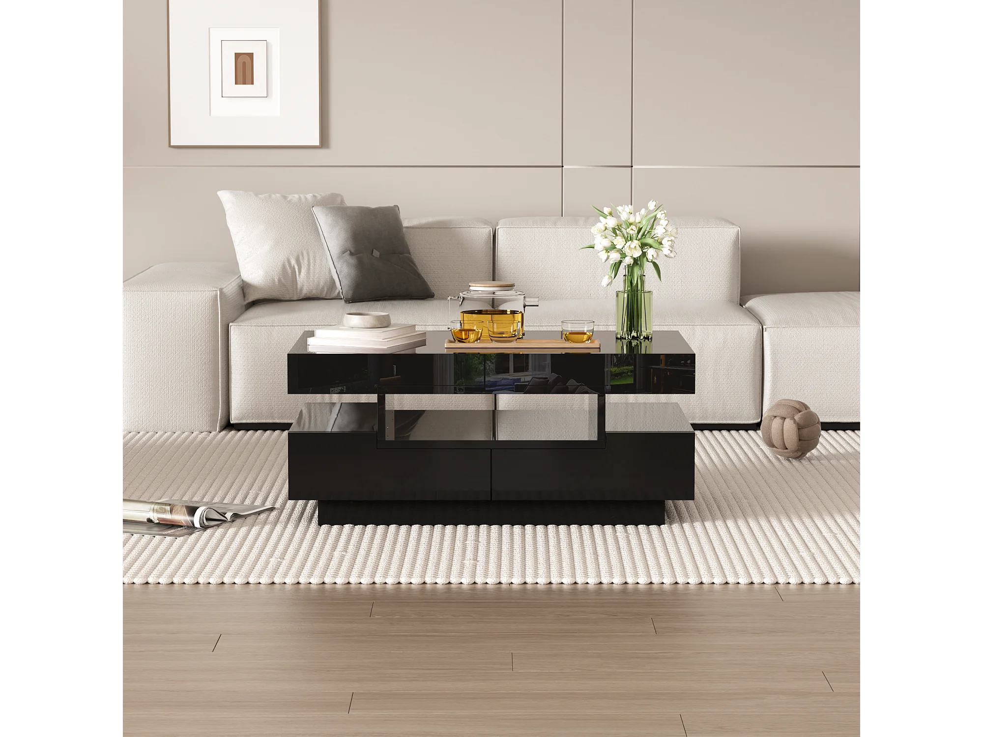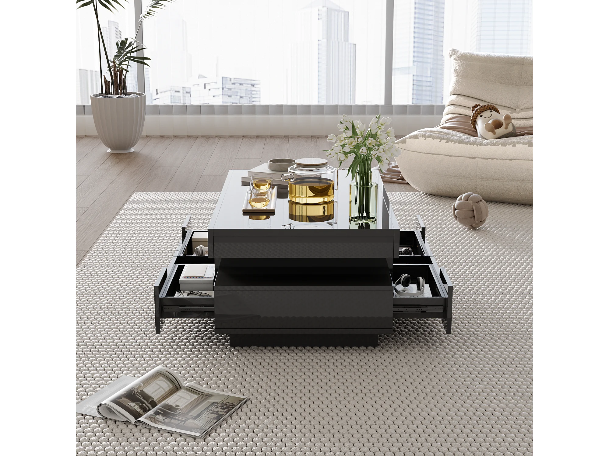 Stolik kawowy z połyskiem, z listwą świetlną LED, 4 szuflady z przodu i z tyłu, Płyta wiórowa, Czarny