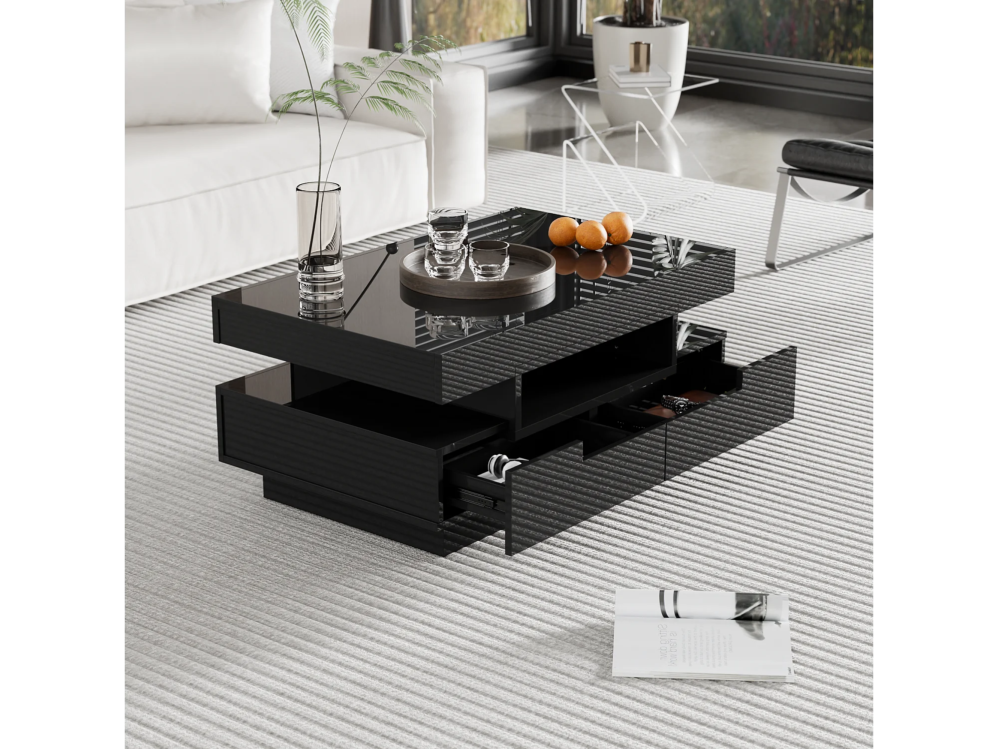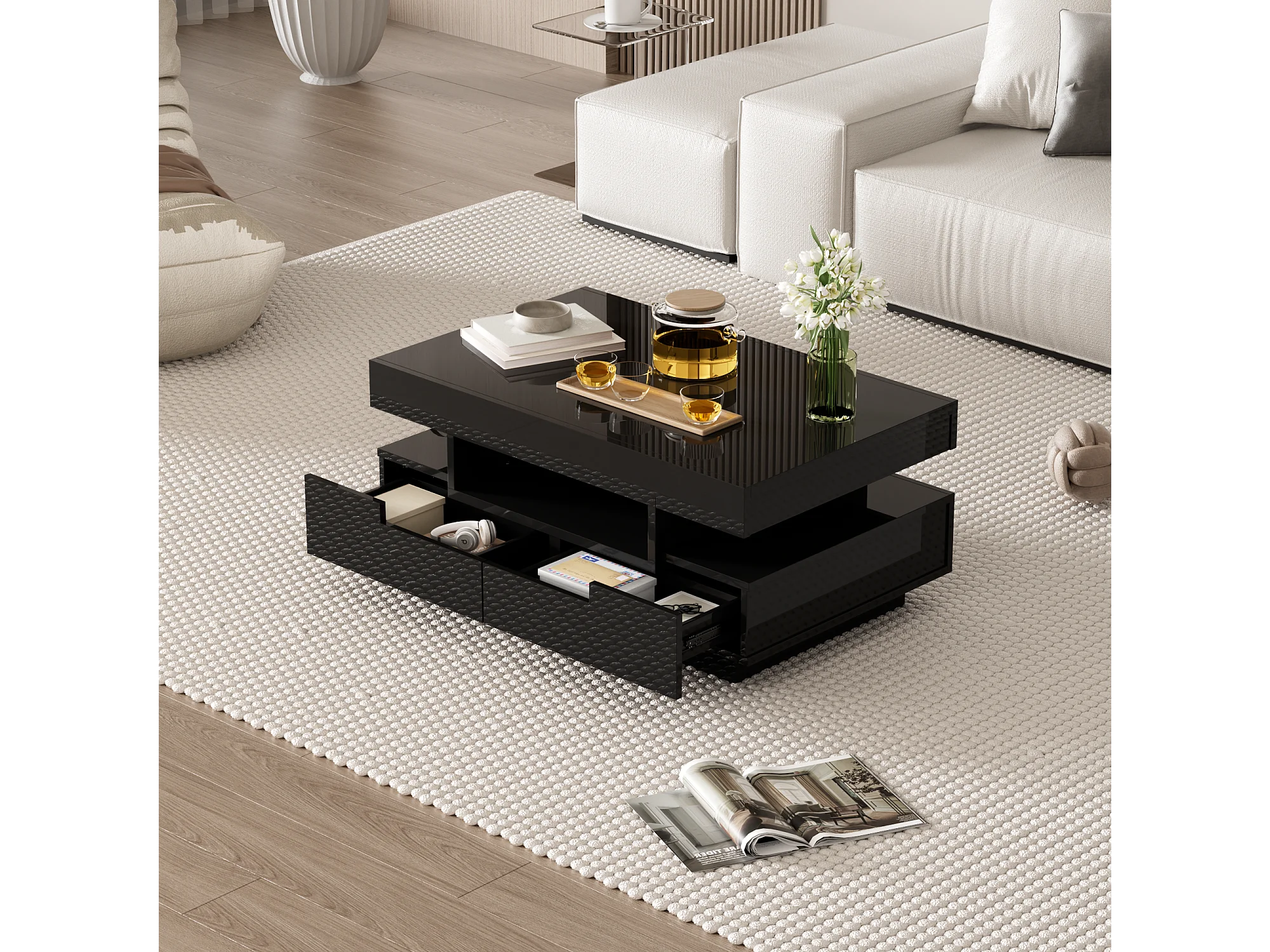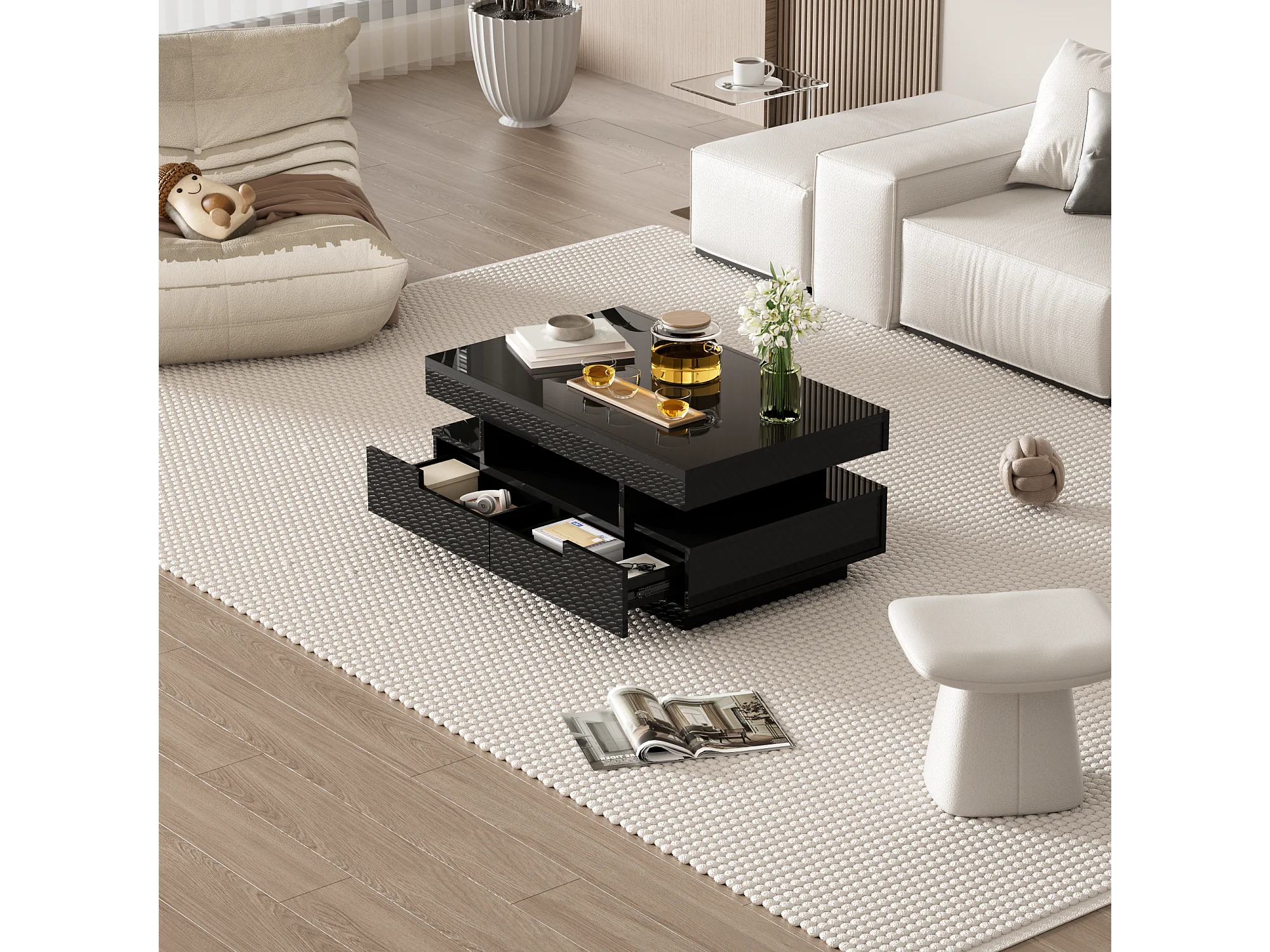 Stolik kawowy z połyskiem, z listwą świetlną LED, 4 szuflady z przodu i z tyłu, Płyta wiórowa, Czarny