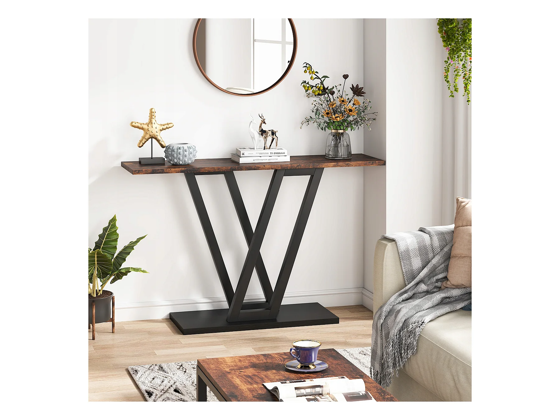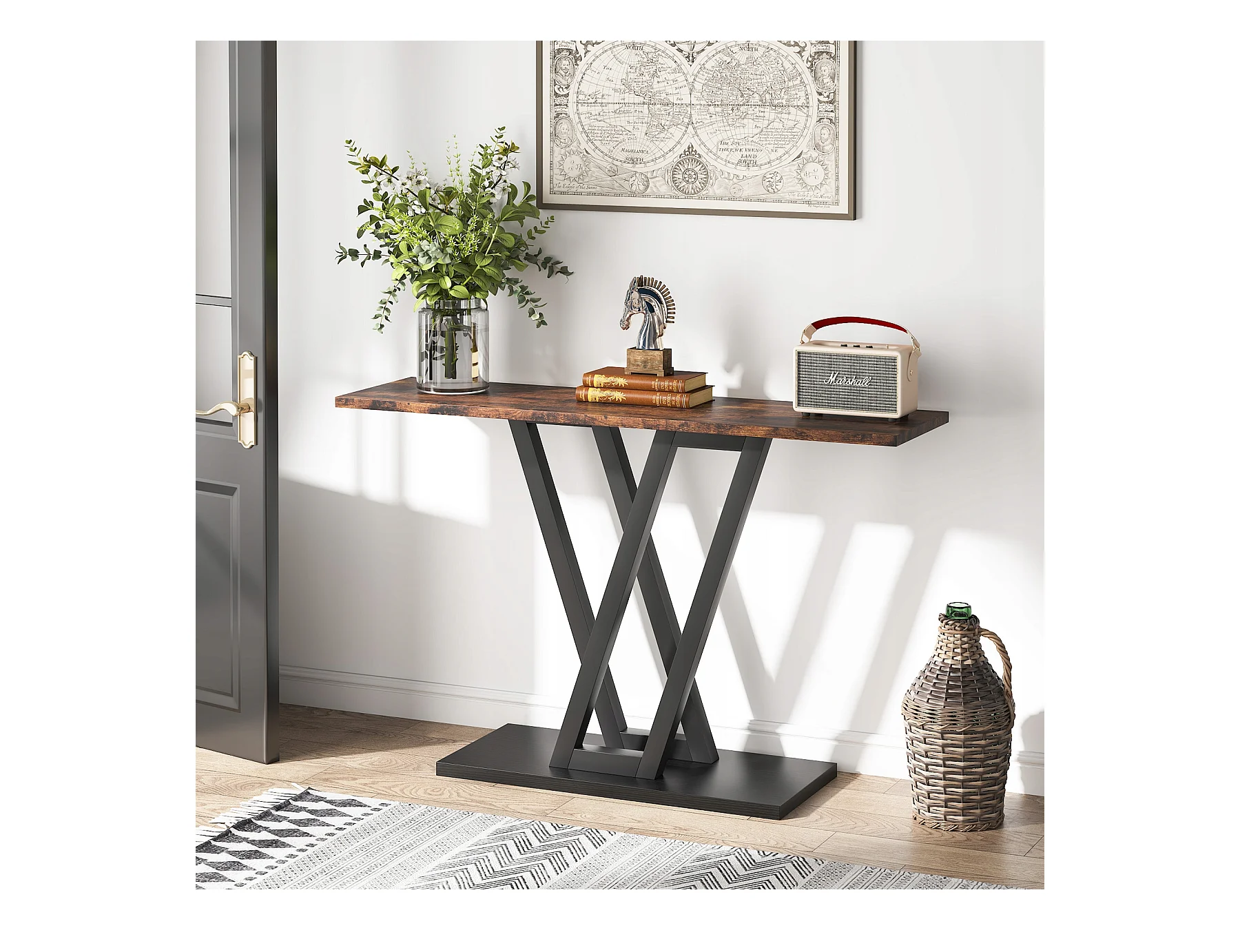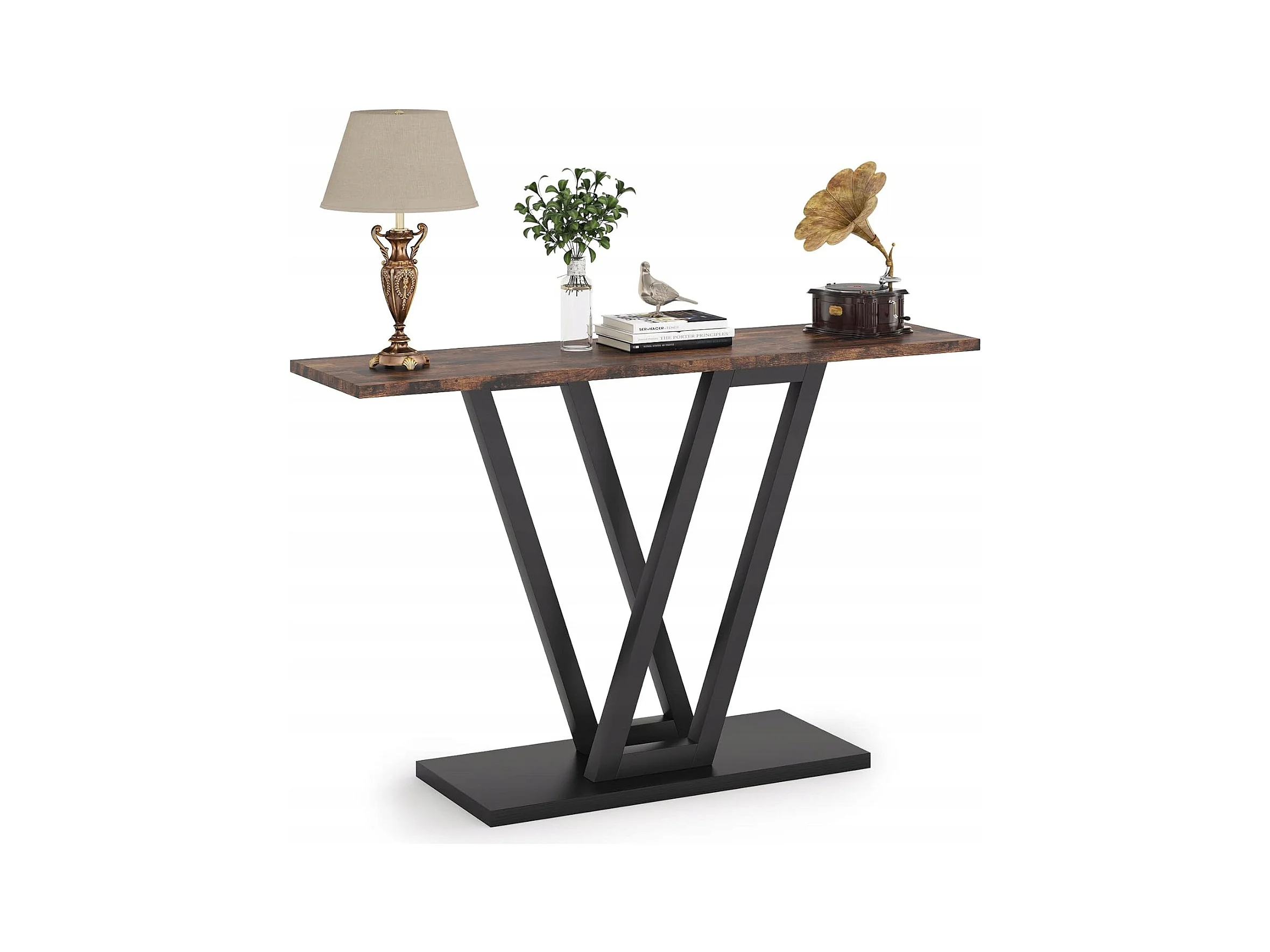Stolik konsolowy, industrialny stolik konsolowy do przedpokoju, stoliki do przedpokoju 110 cm, wąski stolik kawowy do salonu, rustykalny brąz