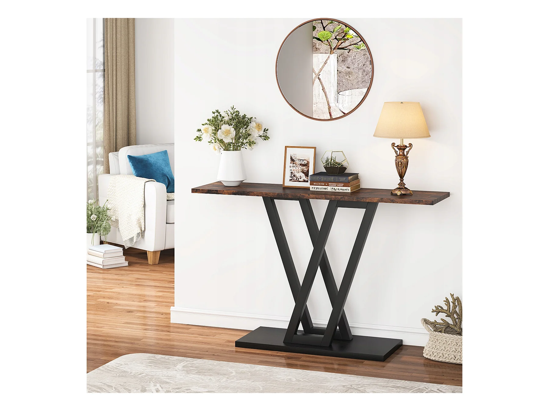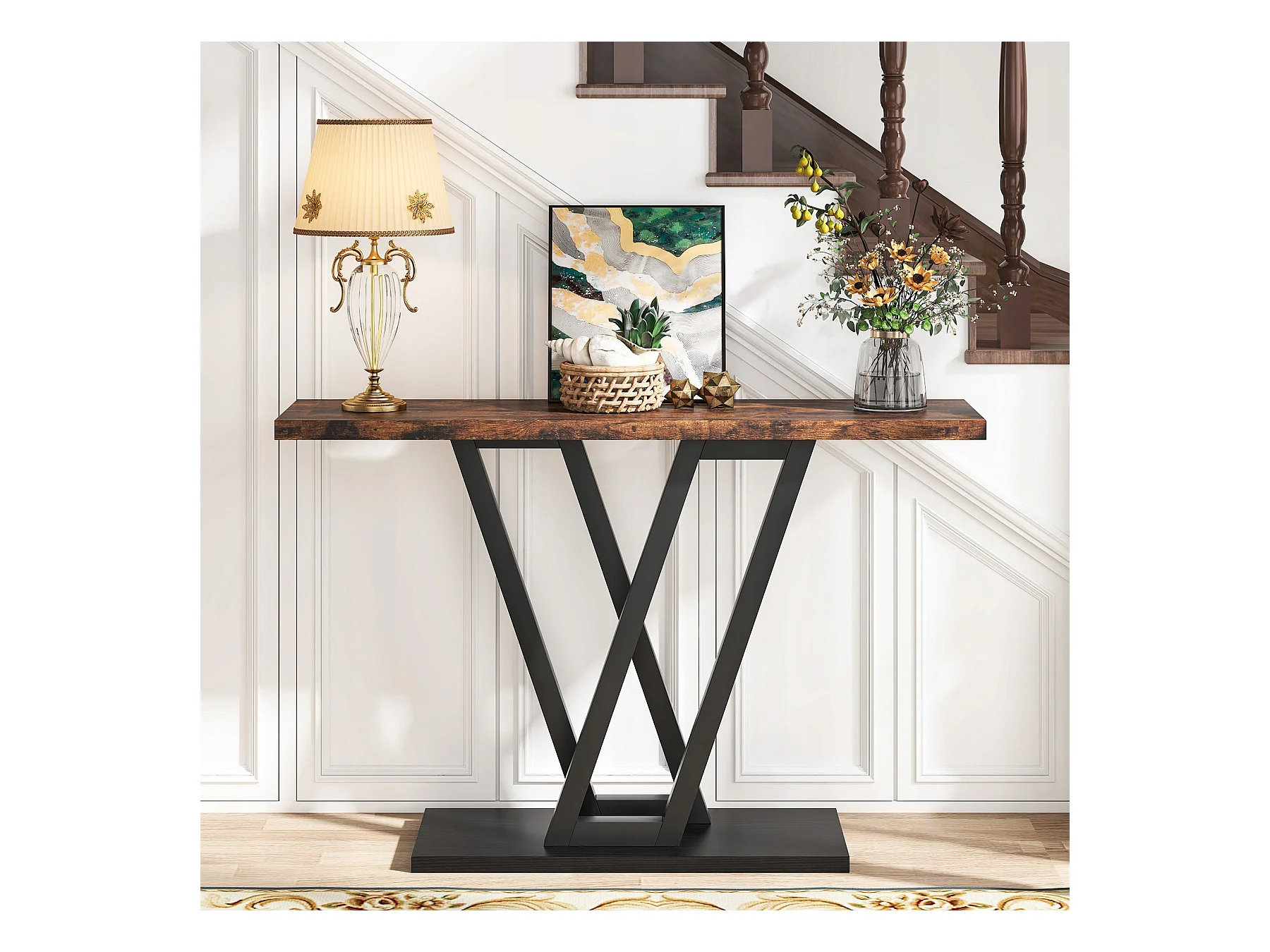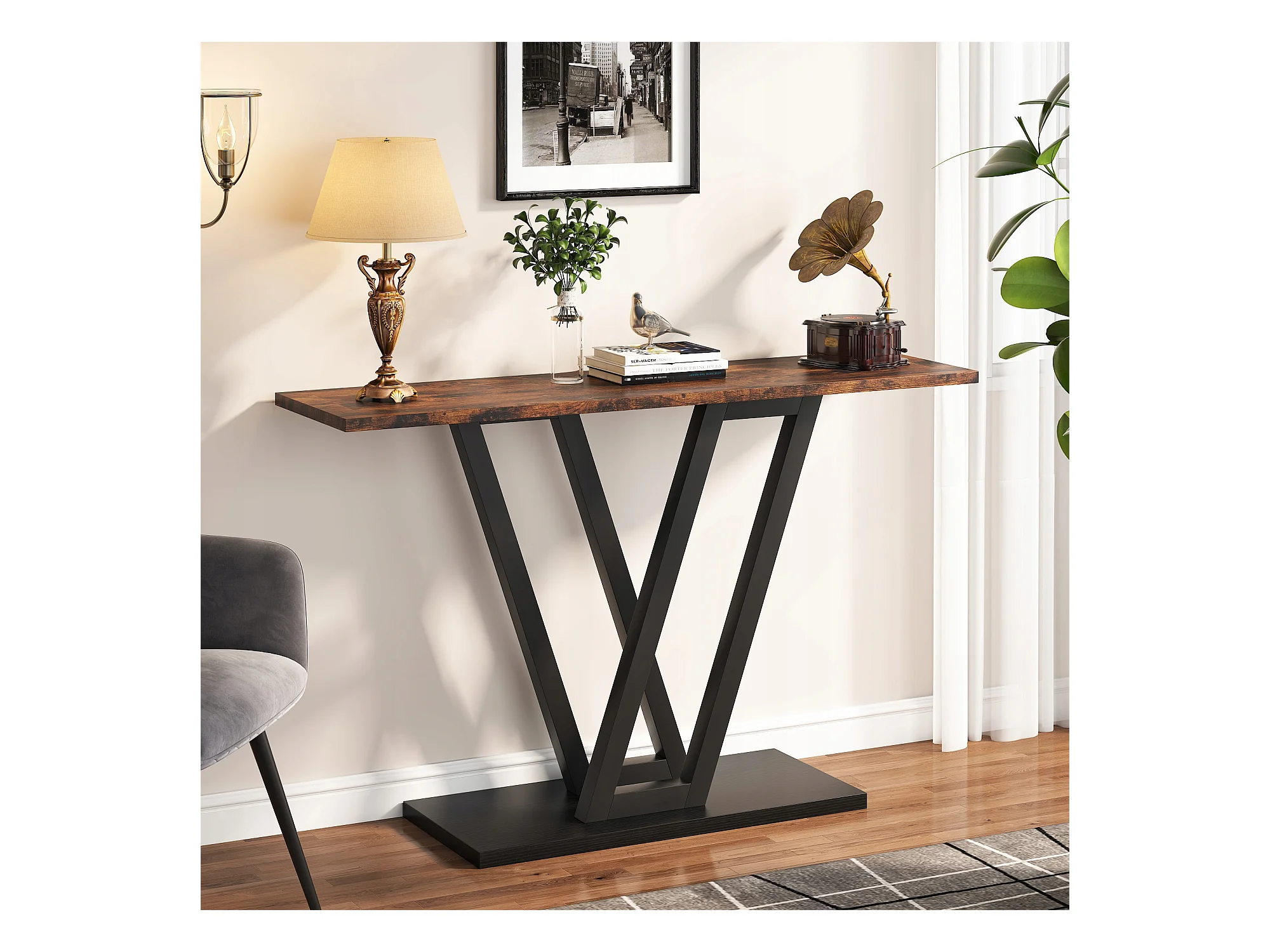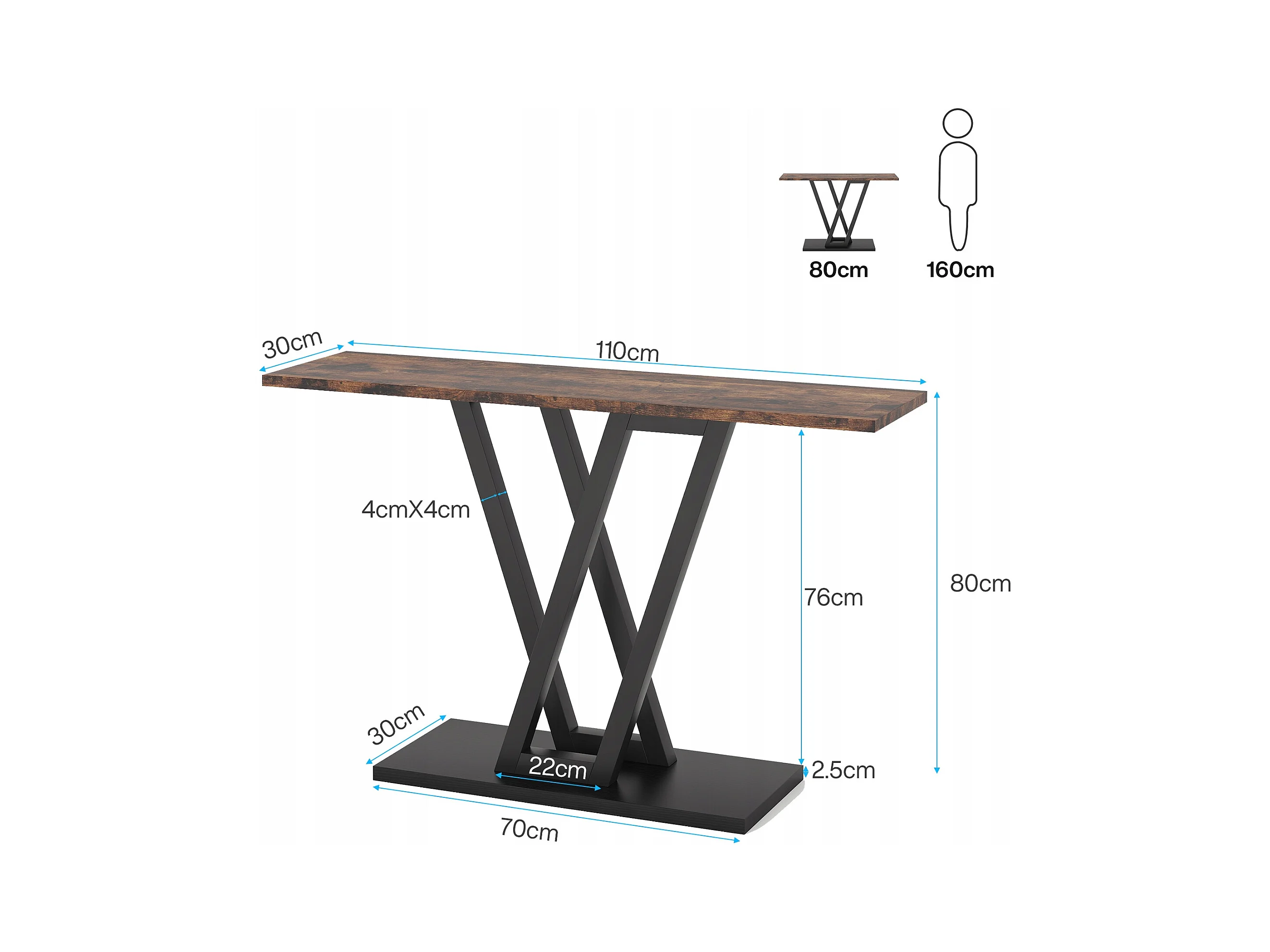 Stolik konsolowy, industrialny stolik konsolowy do przedpokoju, stoliki do przedpokoju 110 cm, wąski stolik kawowy do salonu, rustykalny brąz