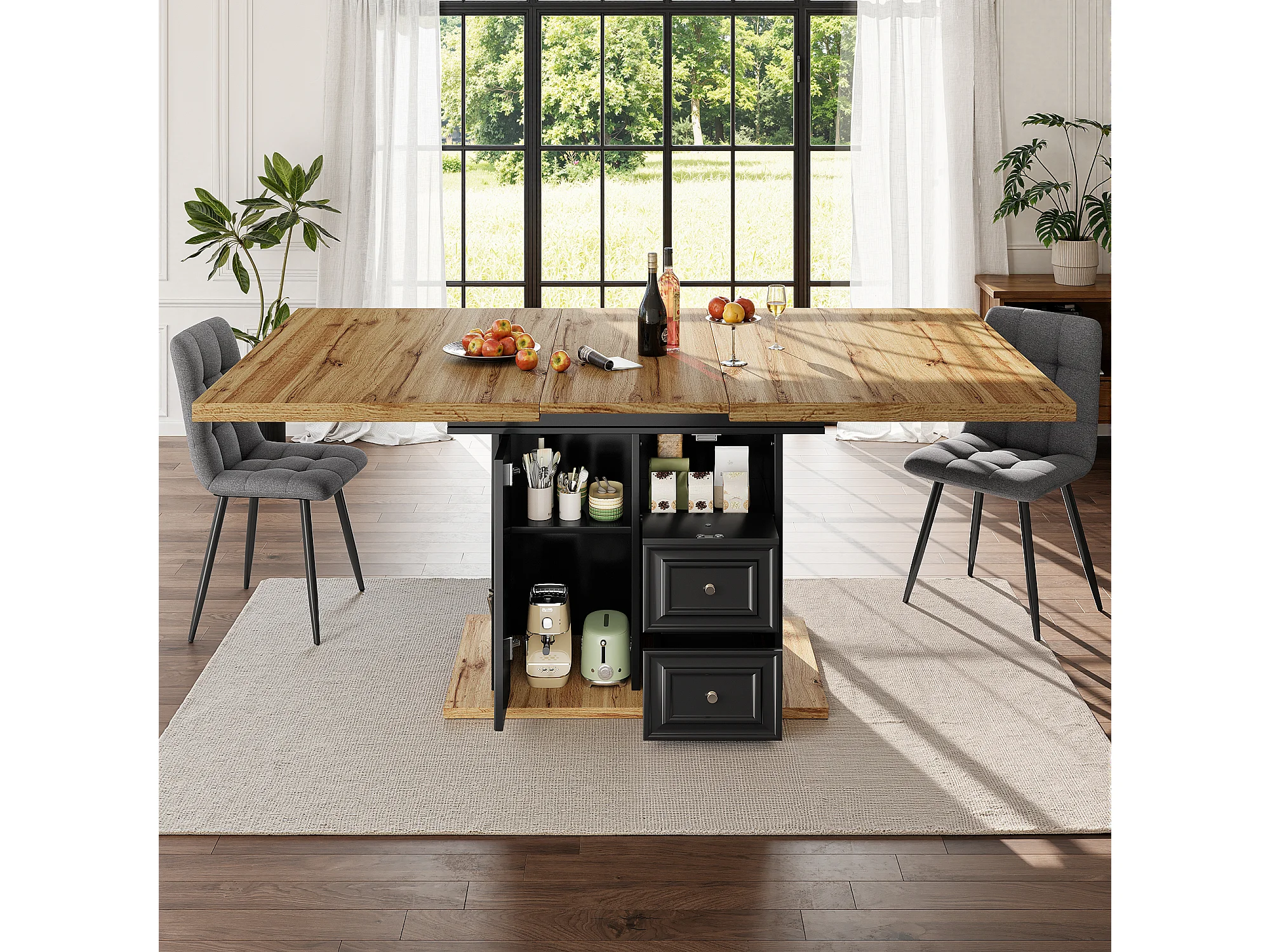 Stolik rozkładany jadalniany 110/140x80x75 cm - Dla 6 osób - 1 front - 2 szuflady - MDF + metal - Czarny