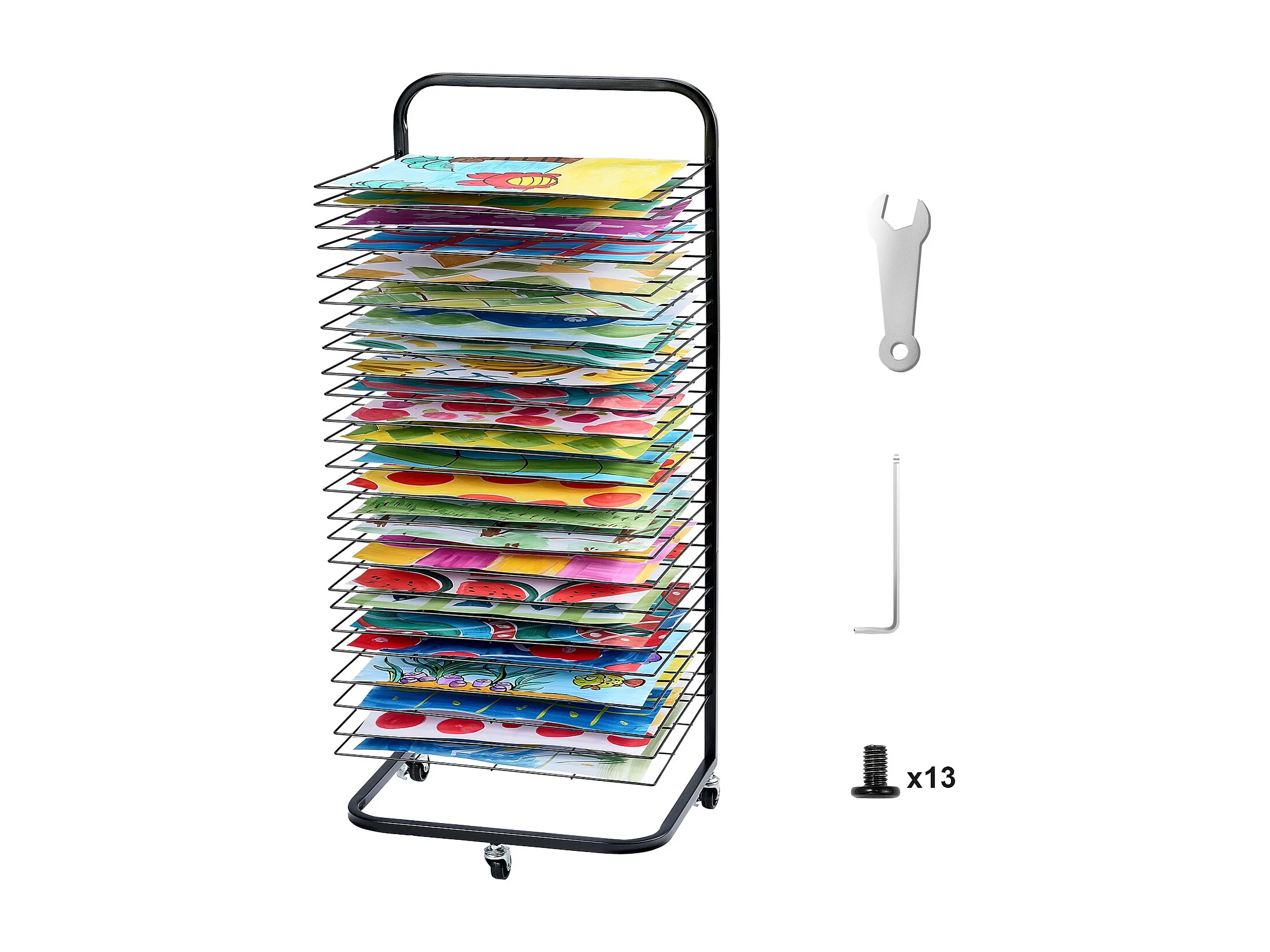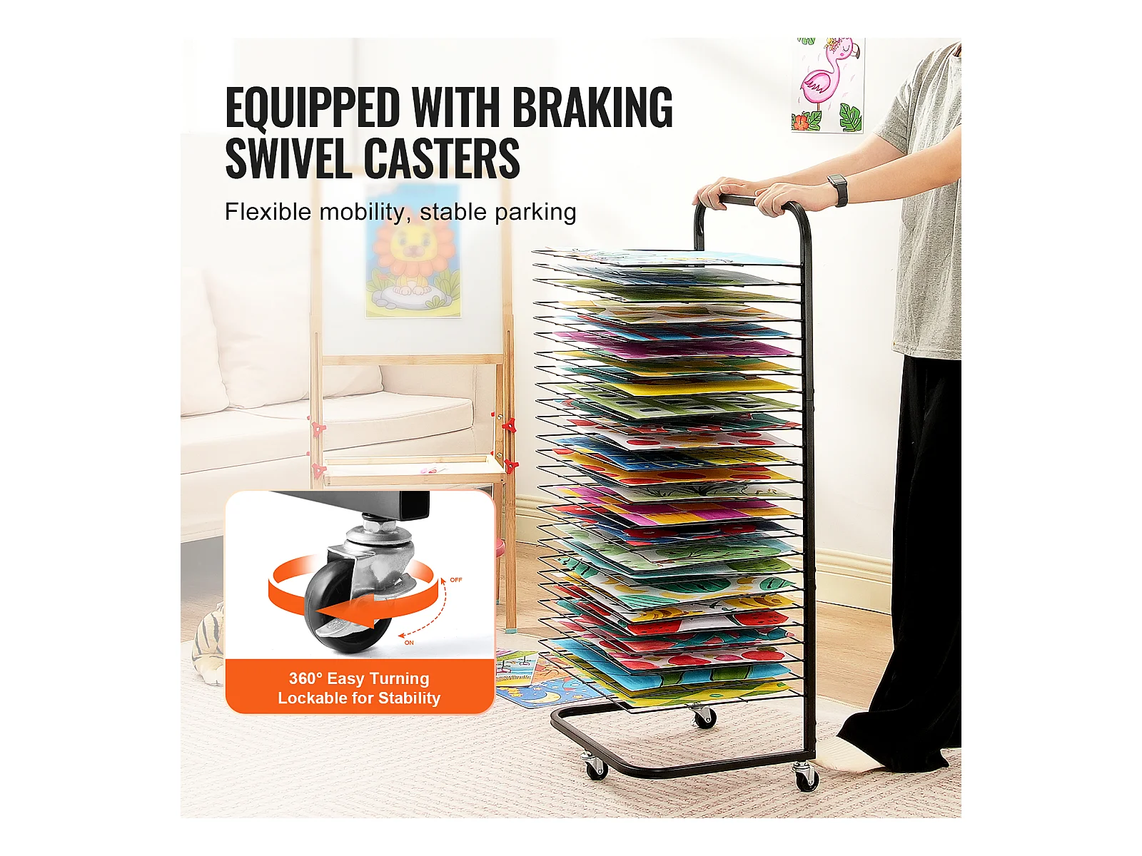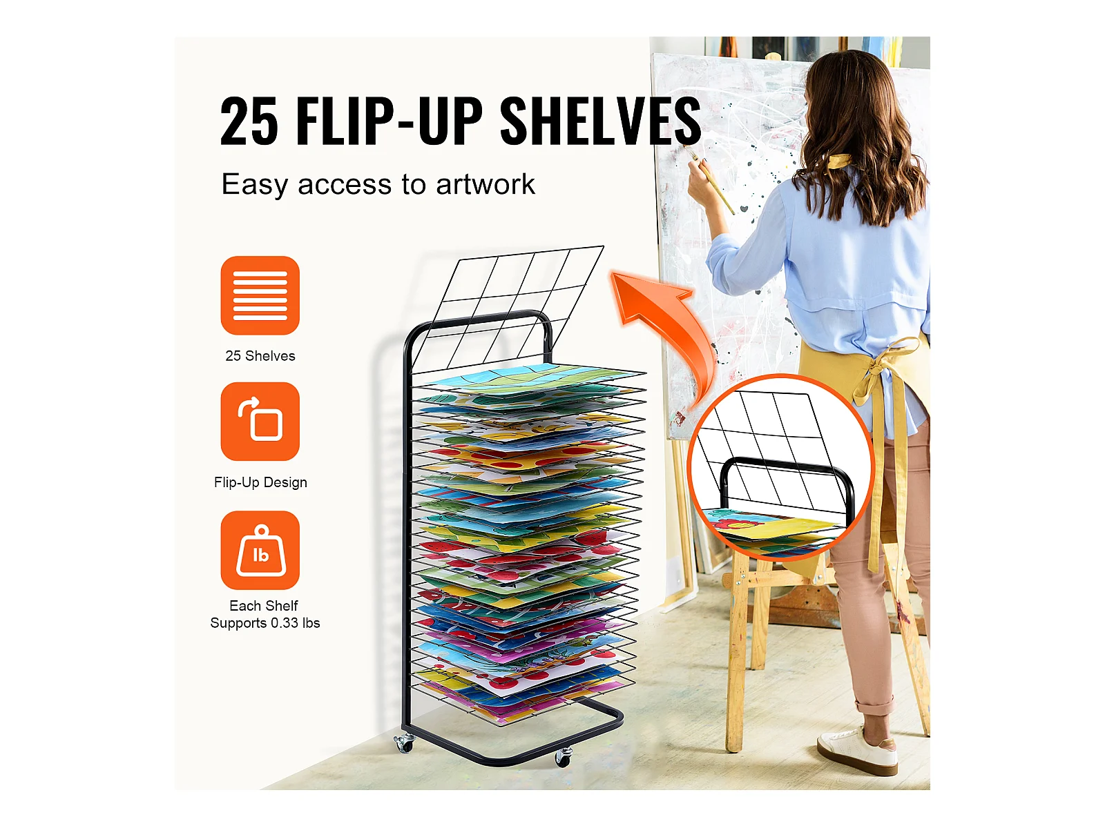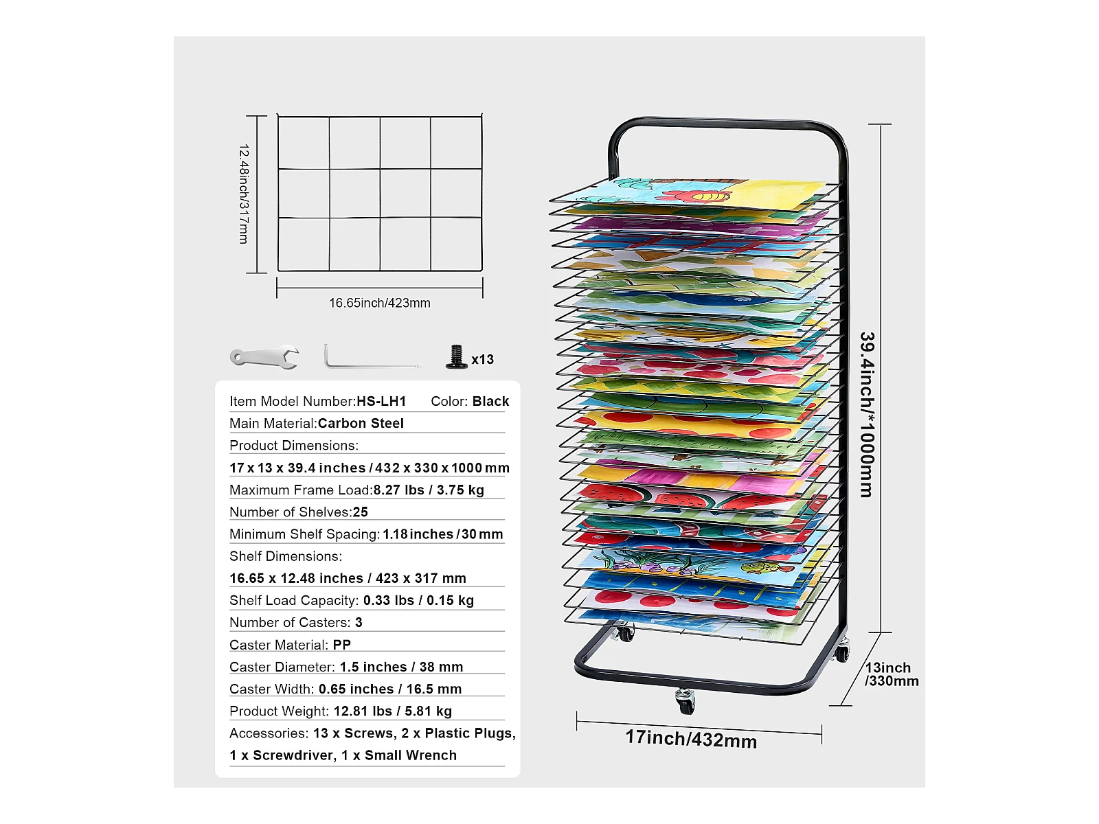 Suszarka do Farby SucceBuy 25 Półek z Kółkami, Czarny, Wyposażony w 3 Obrotowe Kółka, dwa z Hamulcami, Utrzymuje do 3,75 kg