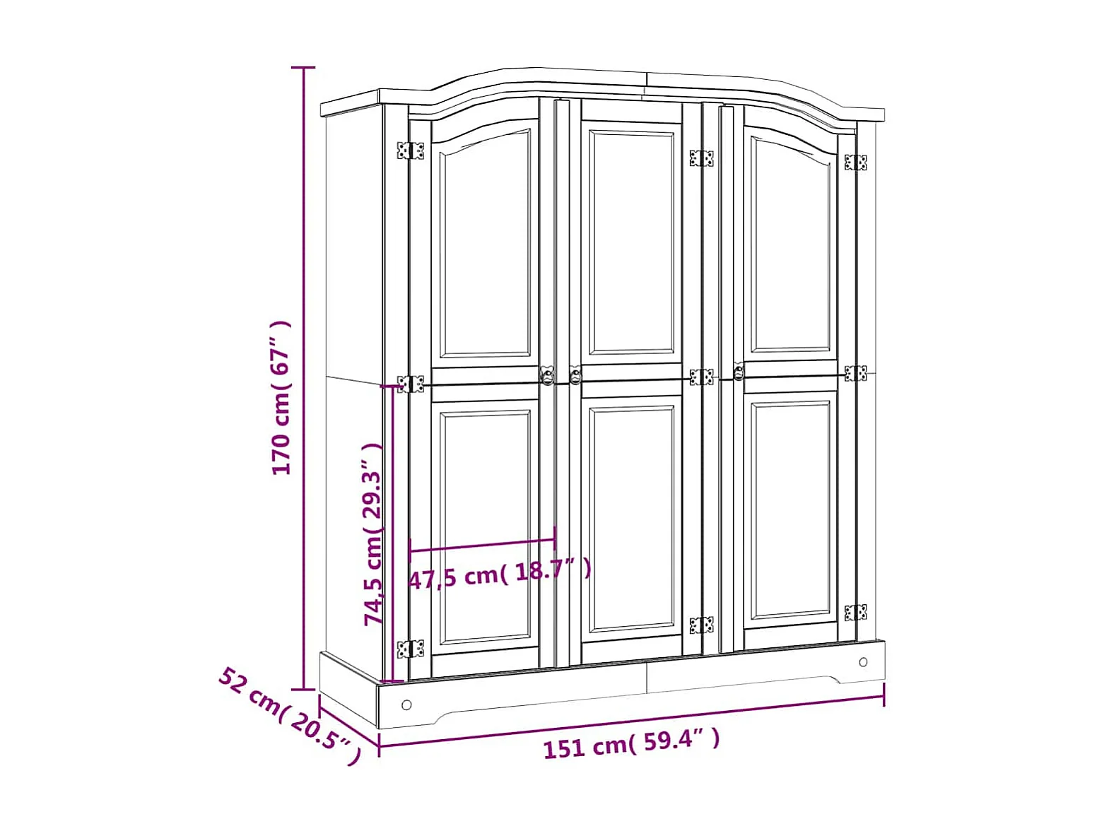 Szafa 3-drzwiowa z litego szarego sosnowego drewna w stylu meksykańskim Corona z drążkiem i półkami