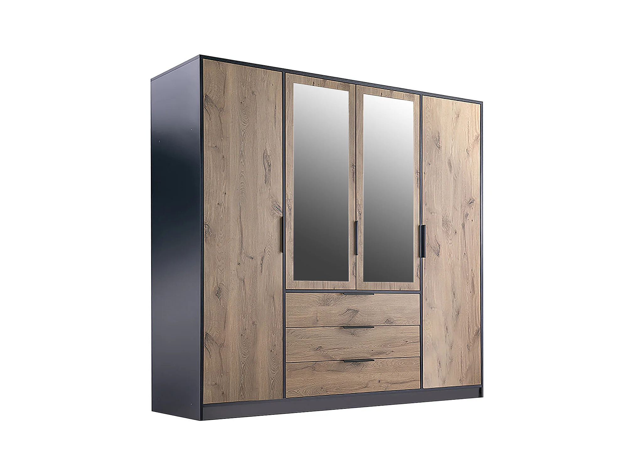 Szafa 4-drzwiowa z 3 szufladami - Z lustrami - szer. 196 cm - Naturalny i czarny - LAMIKI