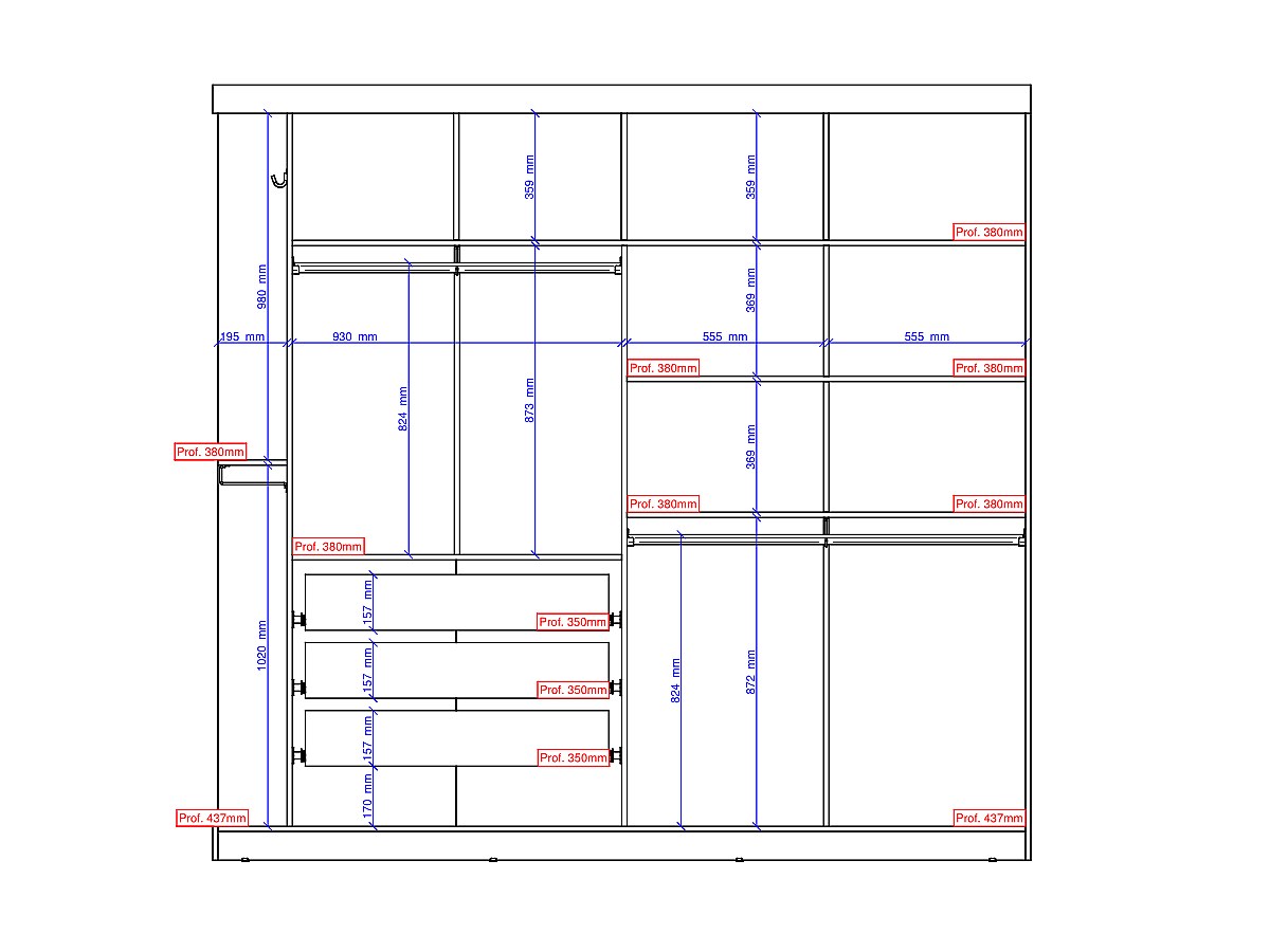 - Wewnątrz: 2 części po powieszenia ubrań, 4 małe półki, 2 duże półki i 3 szuflady