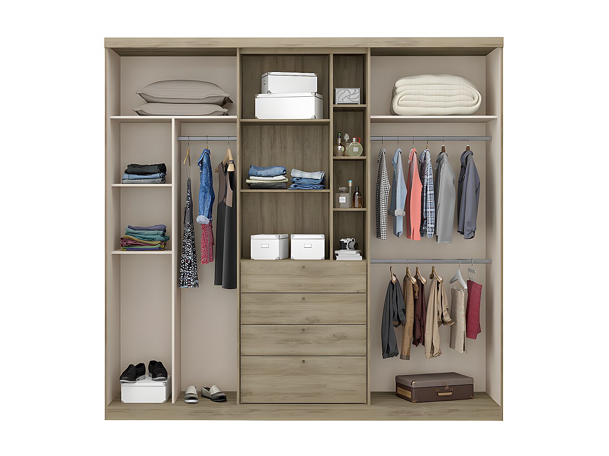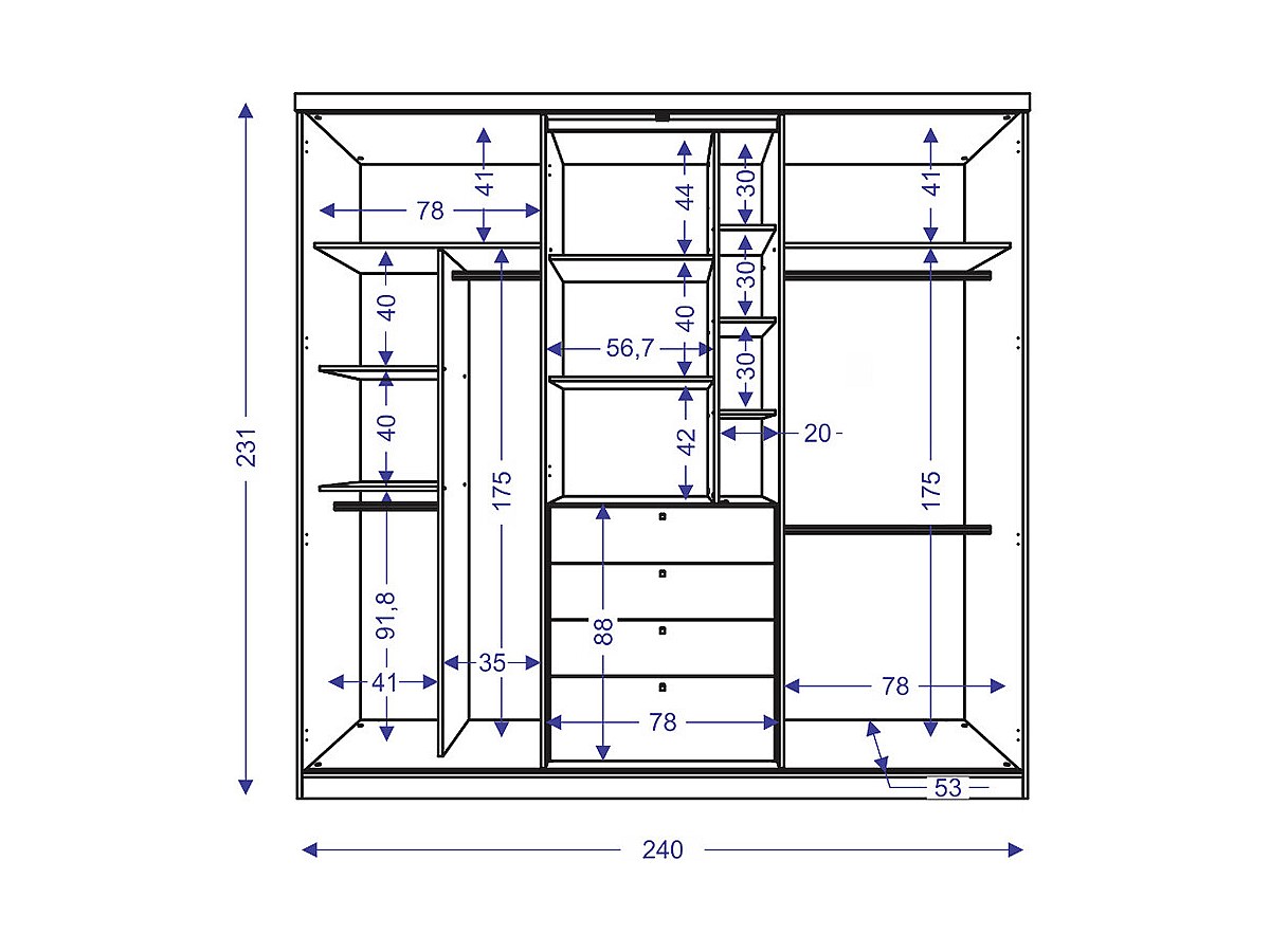 - Wewnątrz: 4 części do wieszania ubrań (1 wysoka, 3 średnie), liczne półki, 4 szuflady (dł.76 x wys.19 cm)