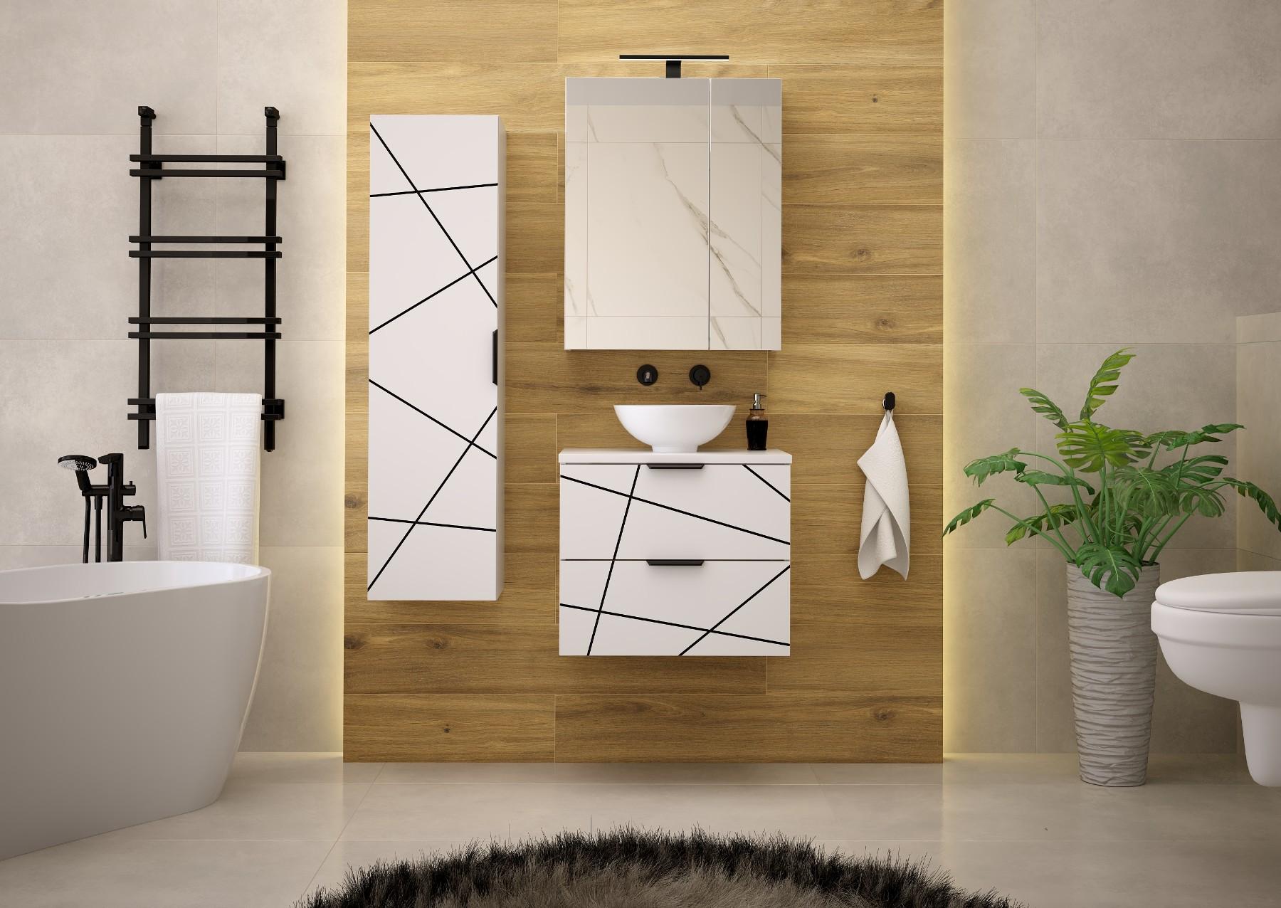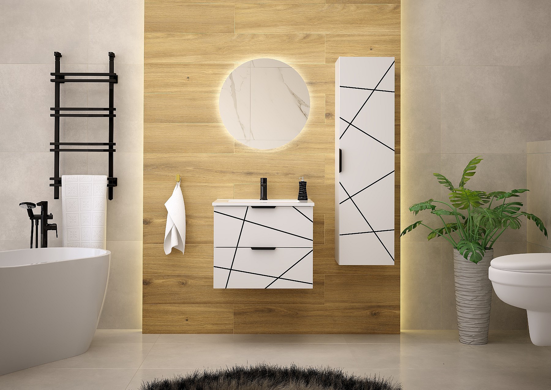 Kolekcja obejmuje szafki pod umywalkę (60 i 80 cm), słupek wysoki, regał oraz blaty, które można łączyć z umywalkami meblowymi i nablatowymi, lustrami oraz szafkami z lustrem. Dzięki temu łatwo dopasujesz meble do swojej przestrzeni i potrzeb, niezależnie od wielkości łazienki.