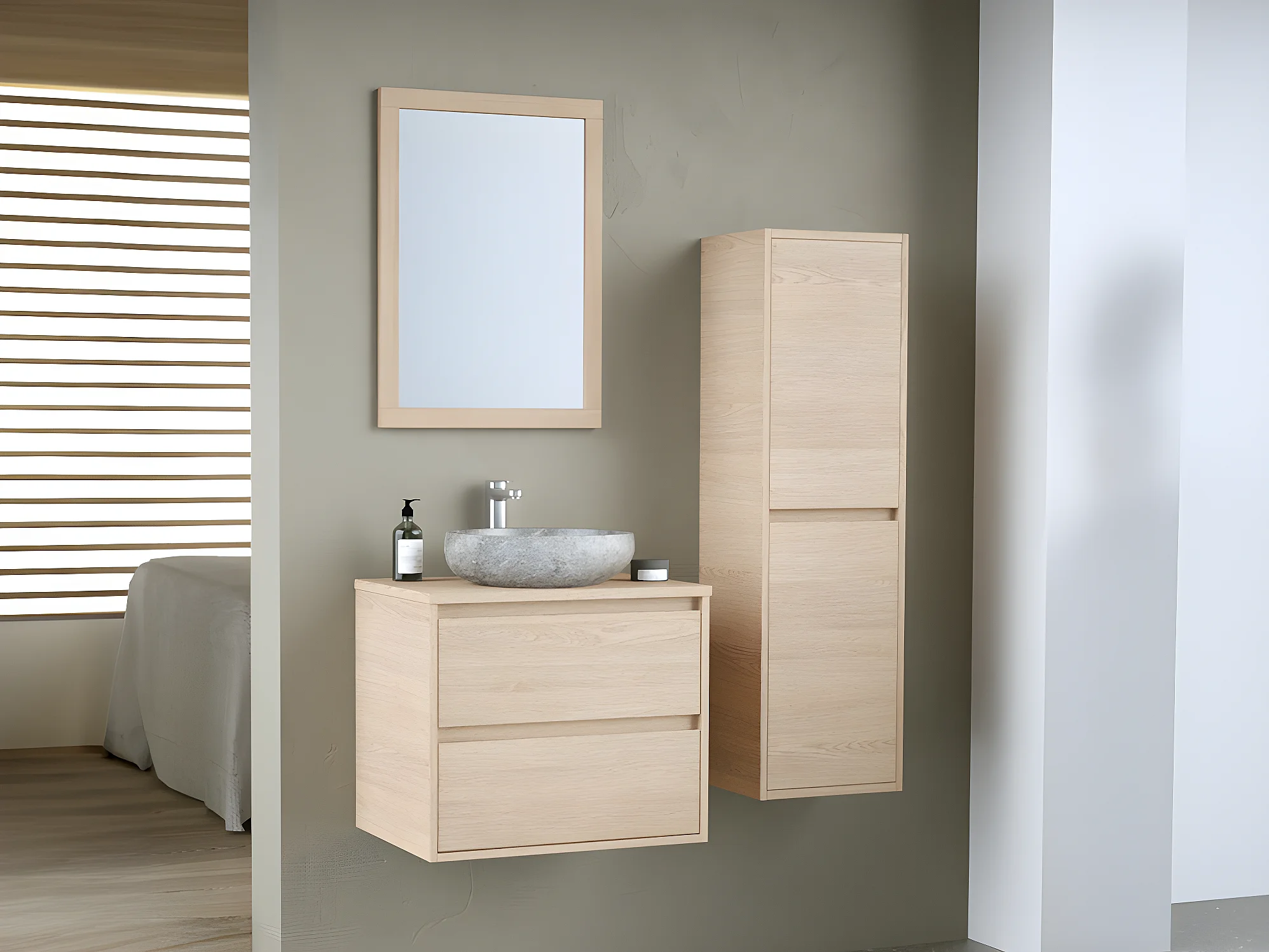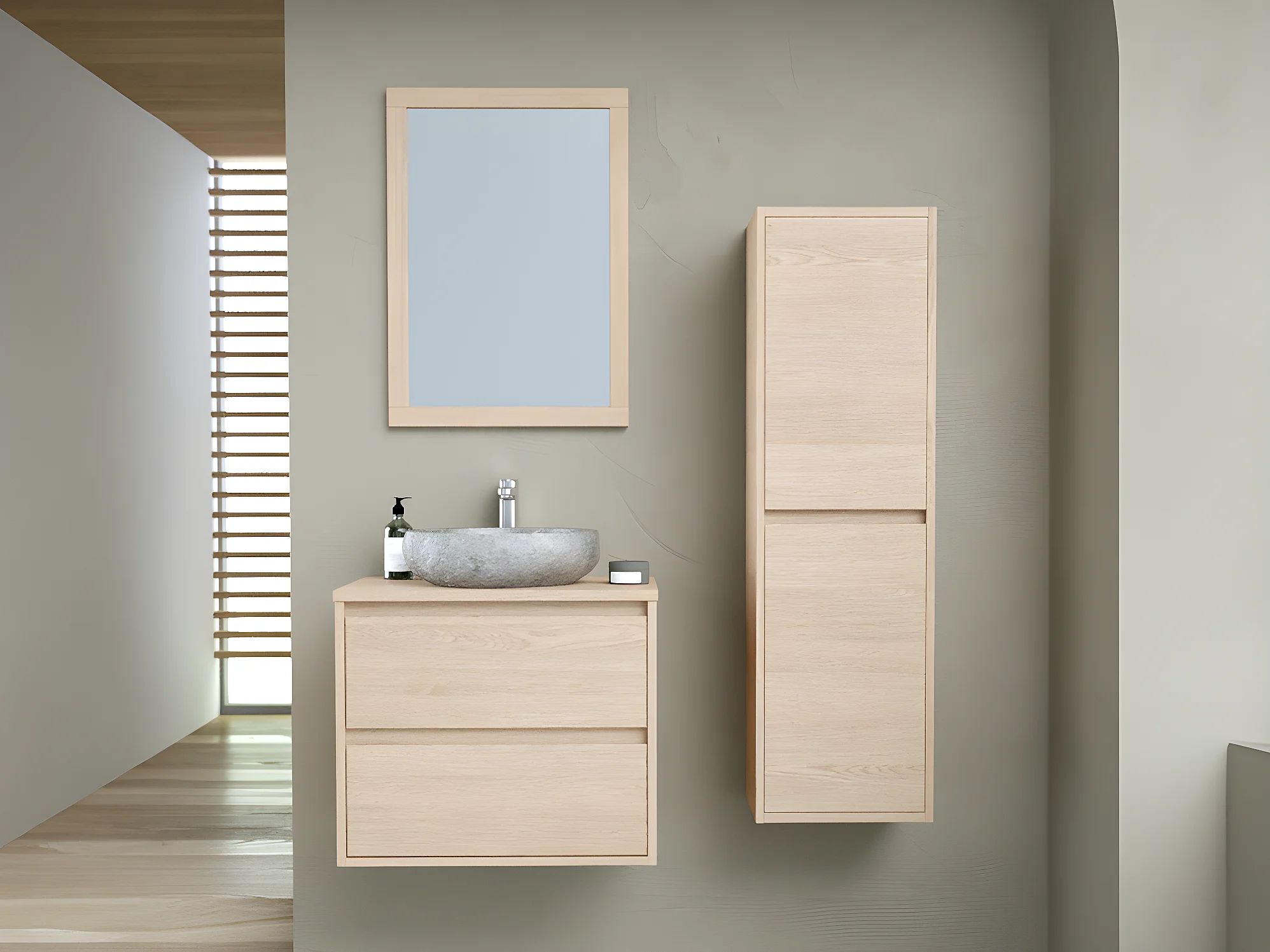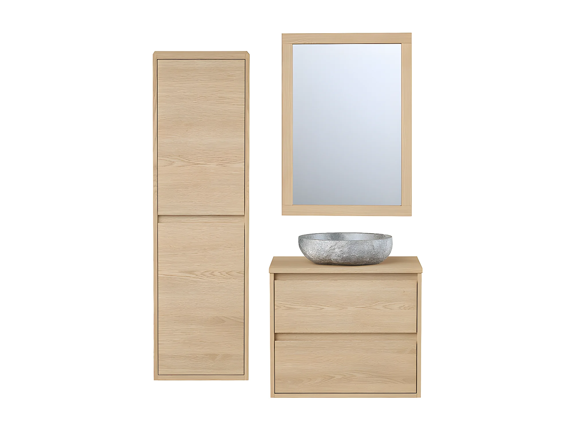 Szafka łazienkowa wisząca z kamienną umywalką nablatową, lustrem i słupkiem - 60 cm - MILIPAM