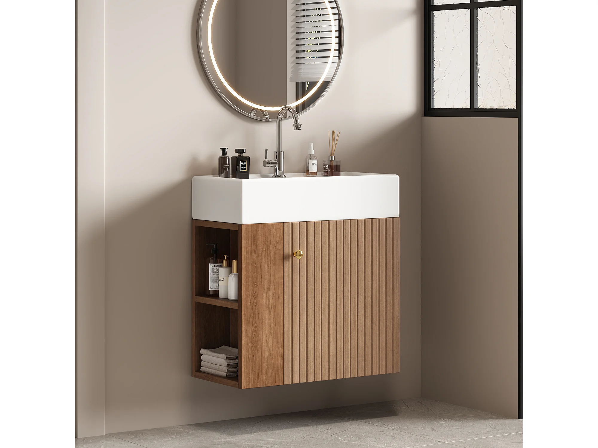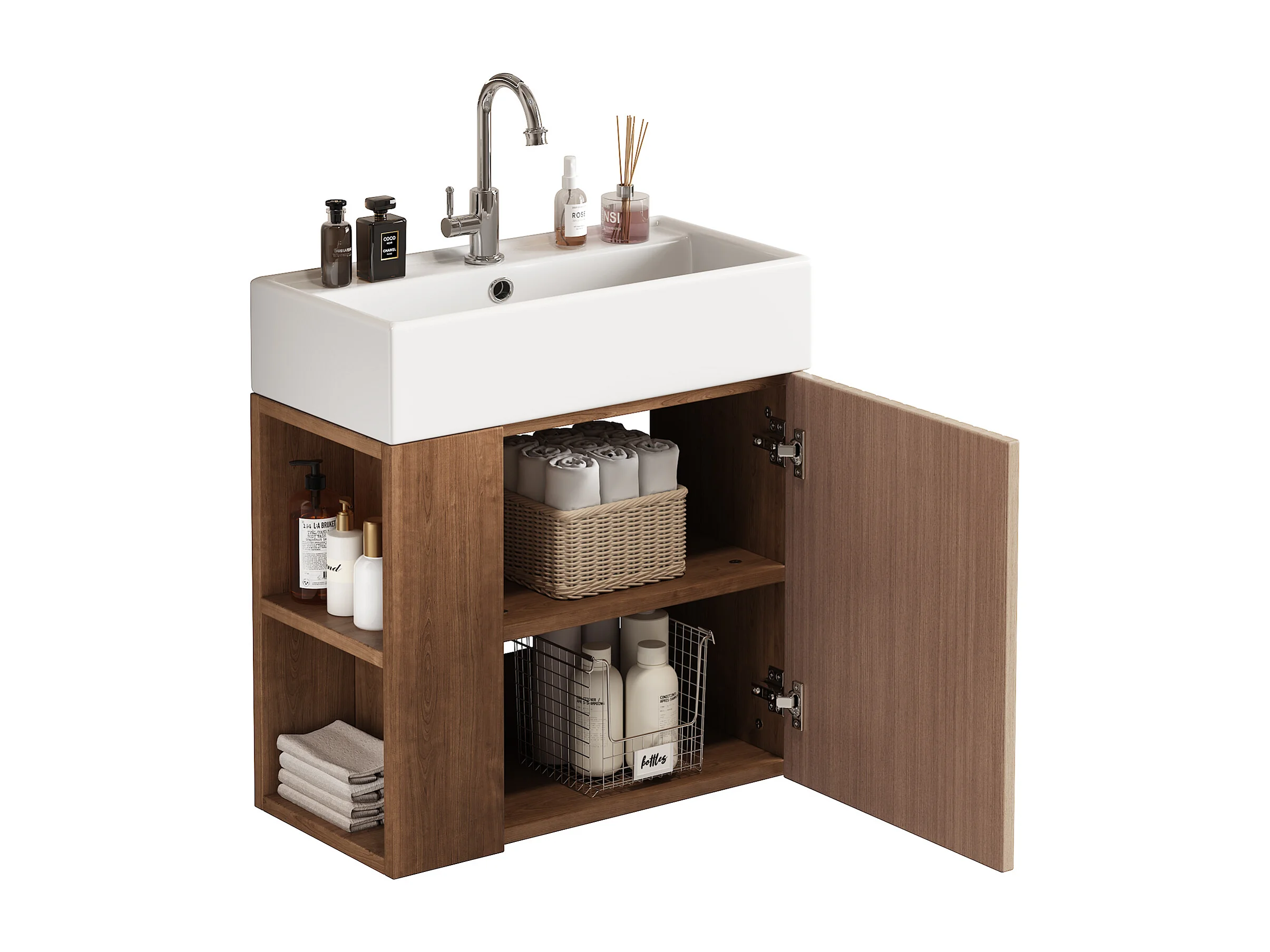 Szafka łazienkowa wisząca z umywalką - 55 x 31 x 66,5 cm - z 1 drzwiami i półką - MDF - brązowa