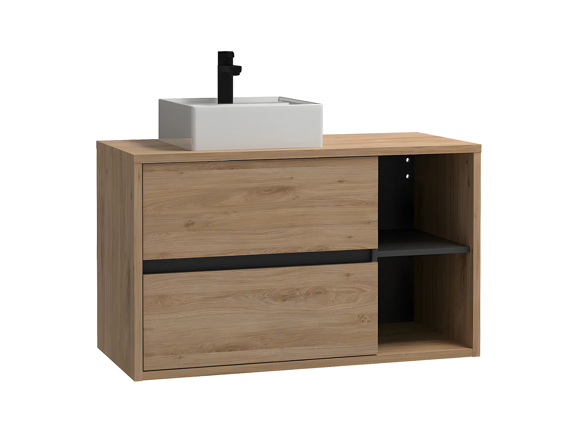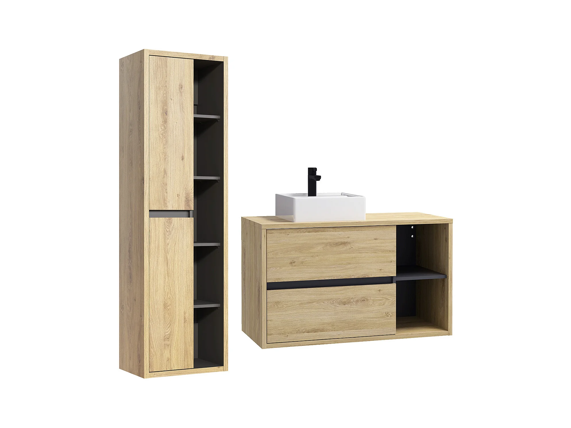 Szafka łazienkowa wisząca z umywalką i słupkiem - 100 cm - Naturalny - PURNAL