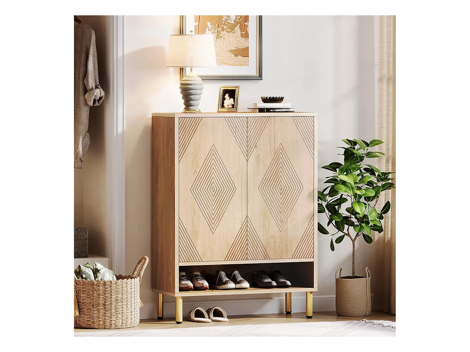 Szafka na buty do przedpokoju z 2 wysuwanymi szufladami, wąska drewniana szafka na buty z żłobkowanym panelem