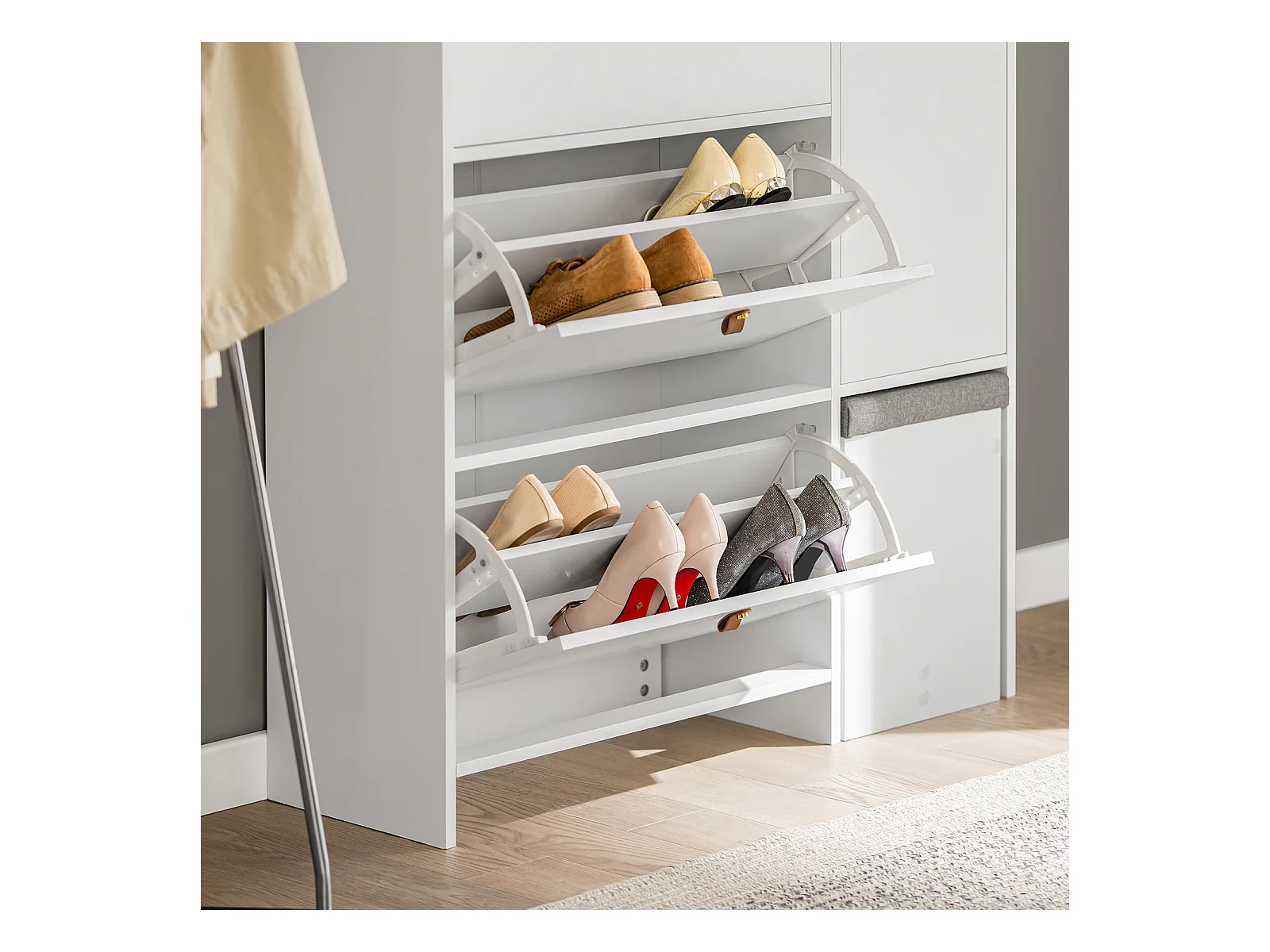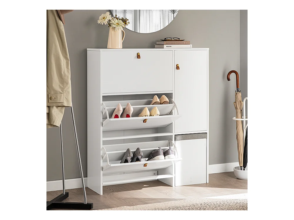Szafka na buty biała z siedziskiem I schowkiem przedpokój 6 półek otwierana
