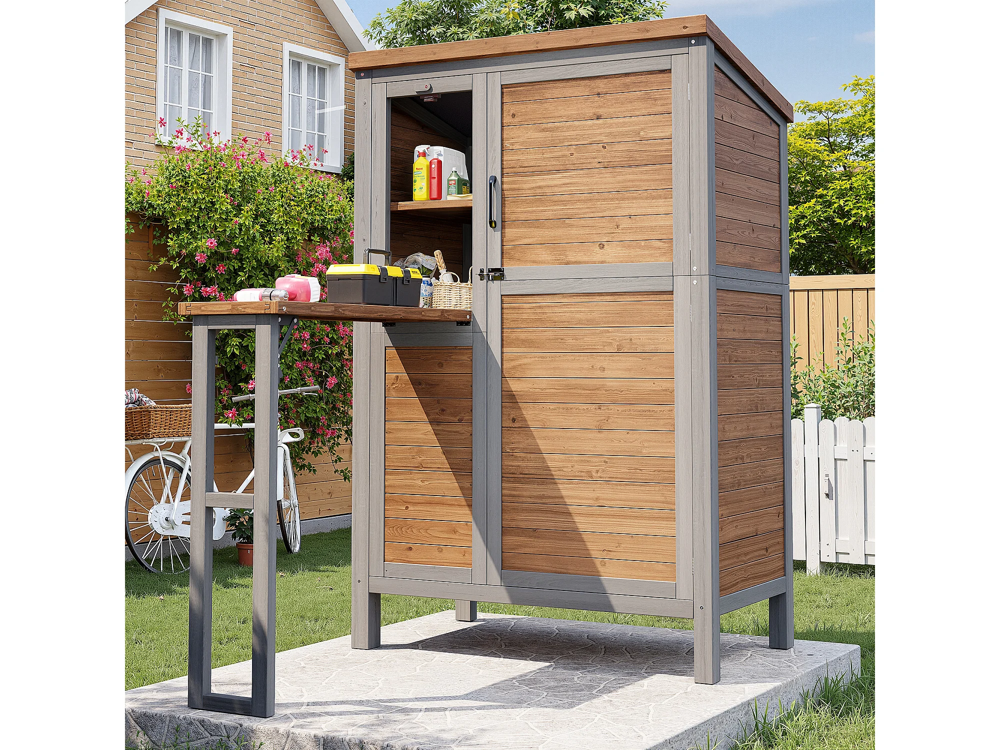 Drewniana szafka ogrodowa - 80 x 51 x 148,5 cm - z blatem + półki + 2 drzwi - naturalna