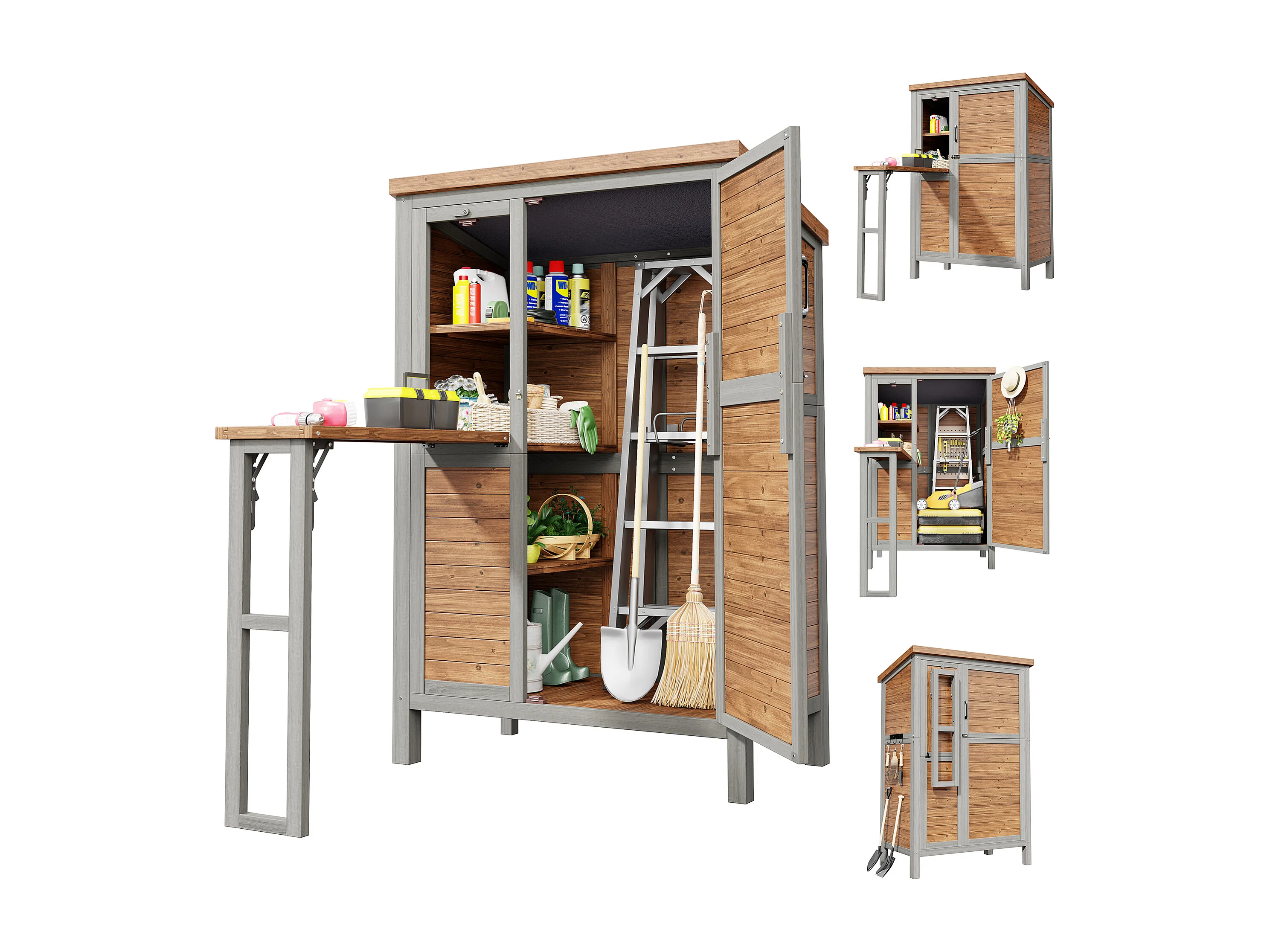 Szafka ogrodowa z rozkładanym blatem - 86 x 51,8 x 160 cm - z półkami i wieszakami - metal i drewno - naturalny