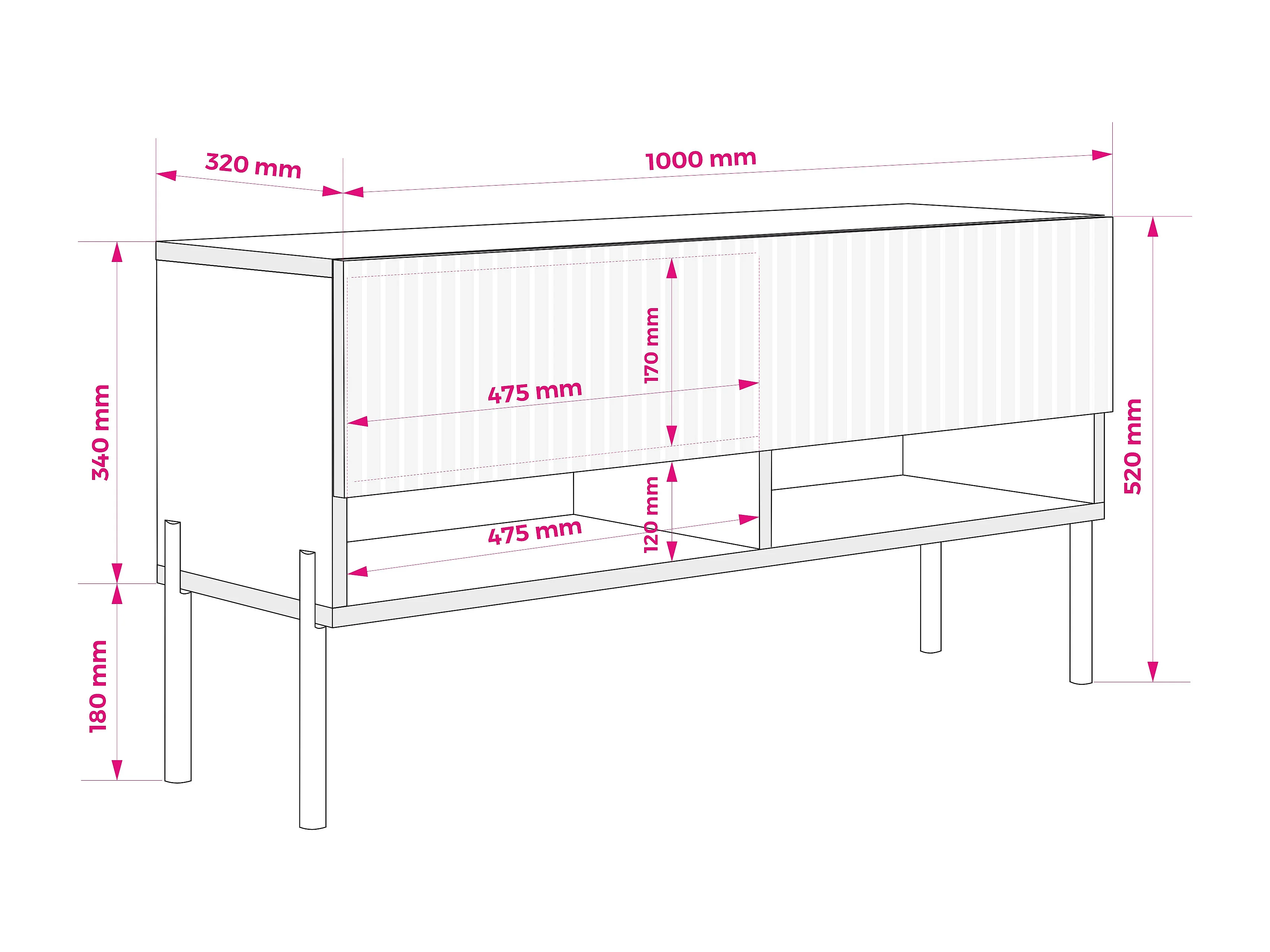 Szafka pod telewizor z ryflowanym frontem 100, Biały Mat, nóżki proste czarne, 100 × 32 × 52 cm