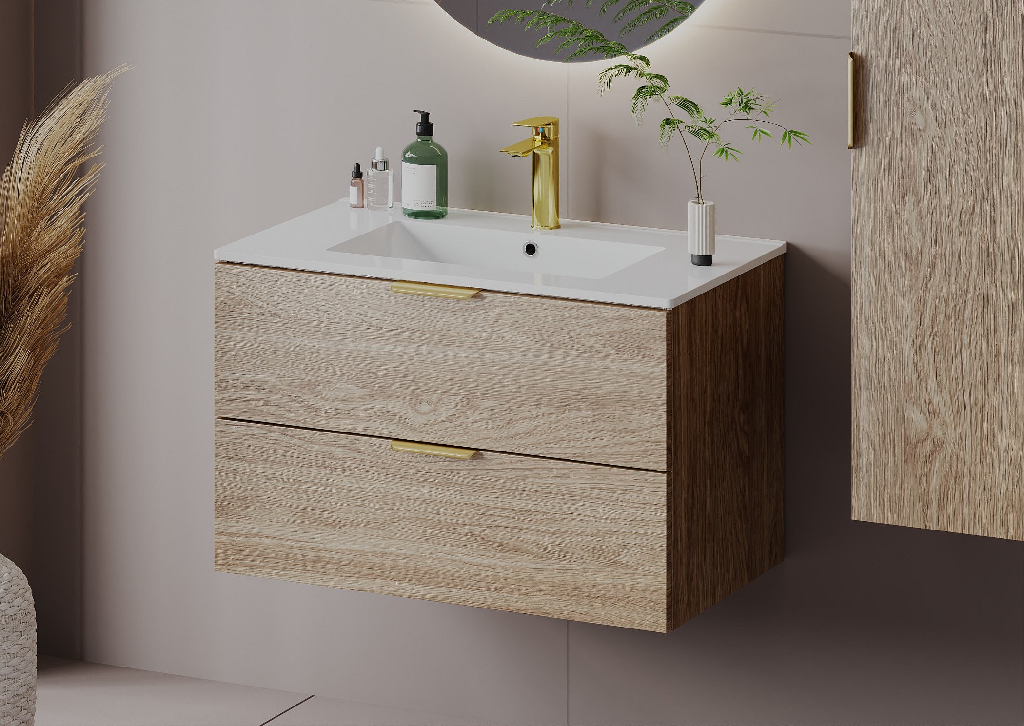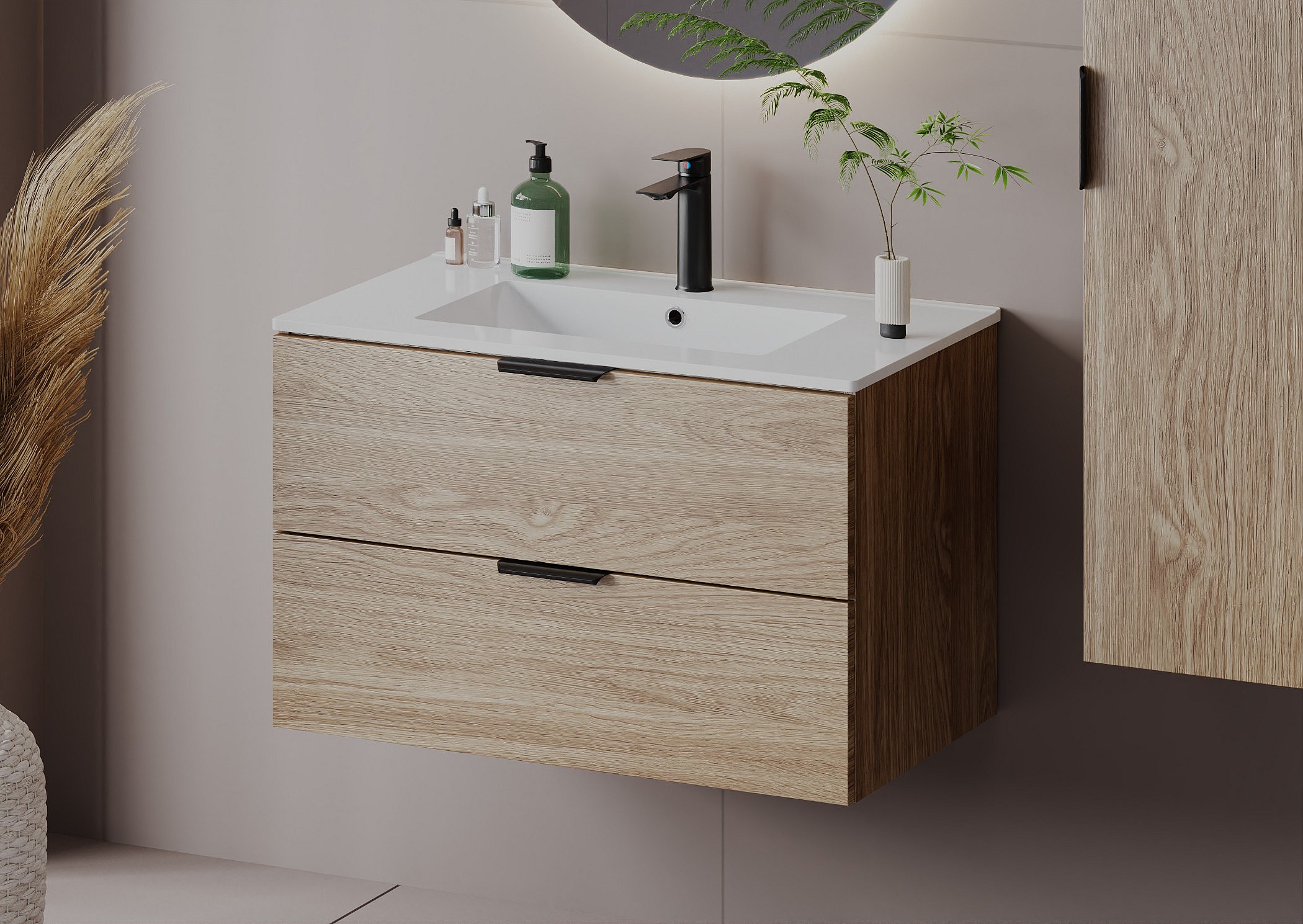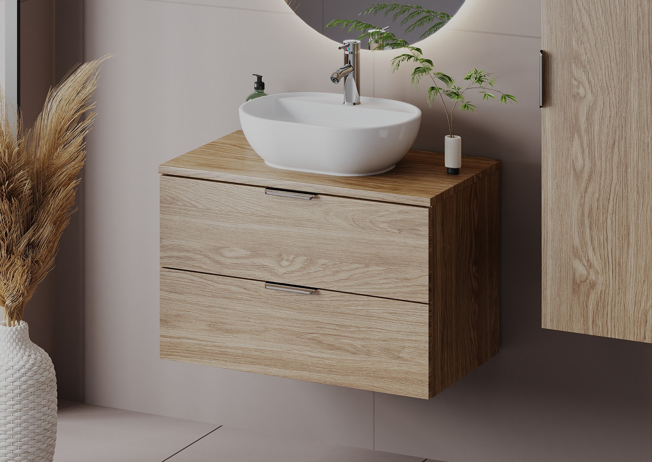 W skład kolekcji wchodzą szafki pod umywalkę o szerokości 60 i 80 cm oraz wysoki słupek, jednak na szczególną uwagę zasługują gotowe zestawy – starannie skomponowane komplety, w których znajdziesz dopasowane blaty, regały oraz umywalki. Dzięki temu stworzysz spójną i harmonijną aranżację, bez konieczności żmudnego dobierania elementów.