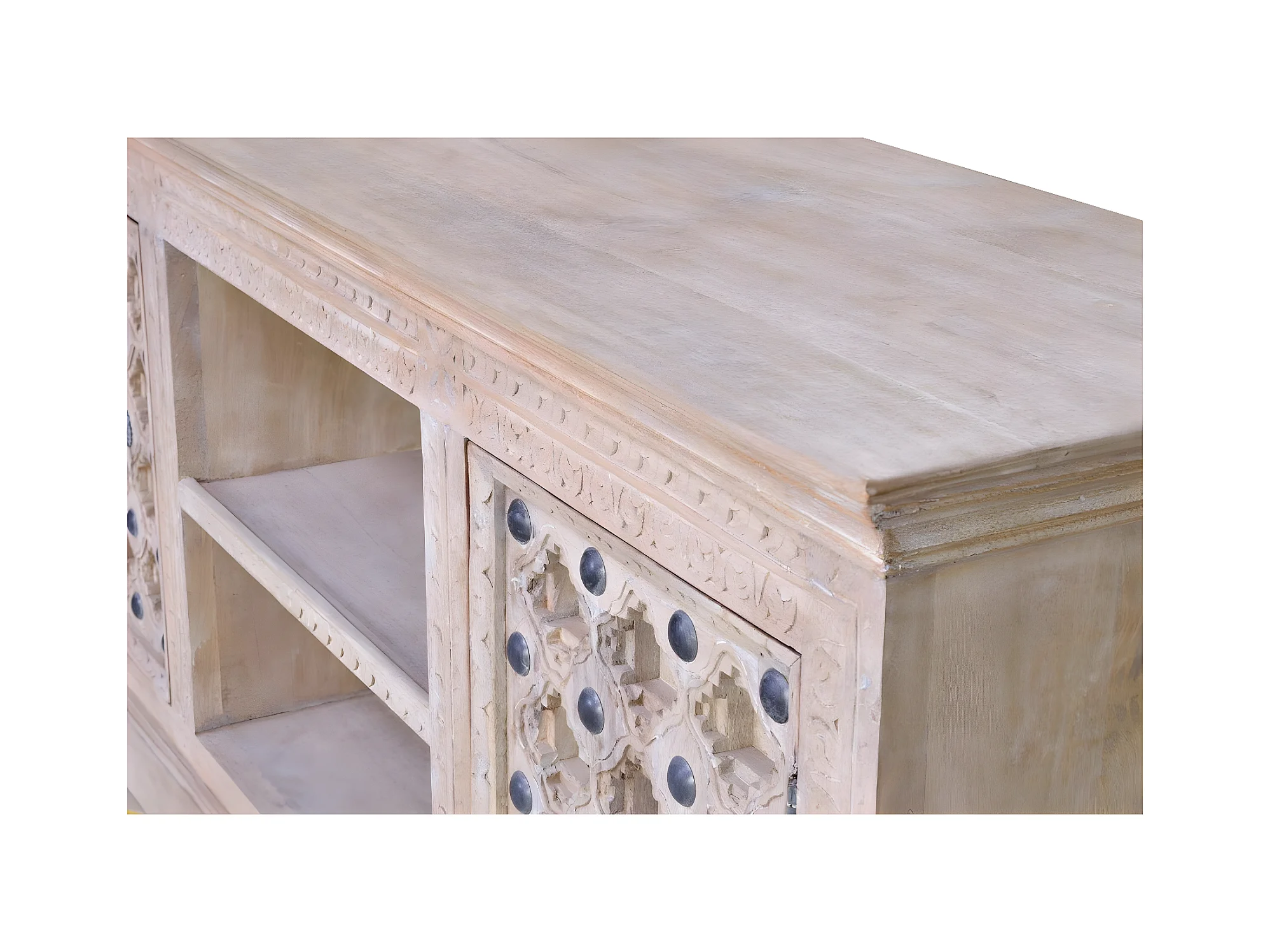 Szafka RTV z rzeźbionego drewna mango i metalu
