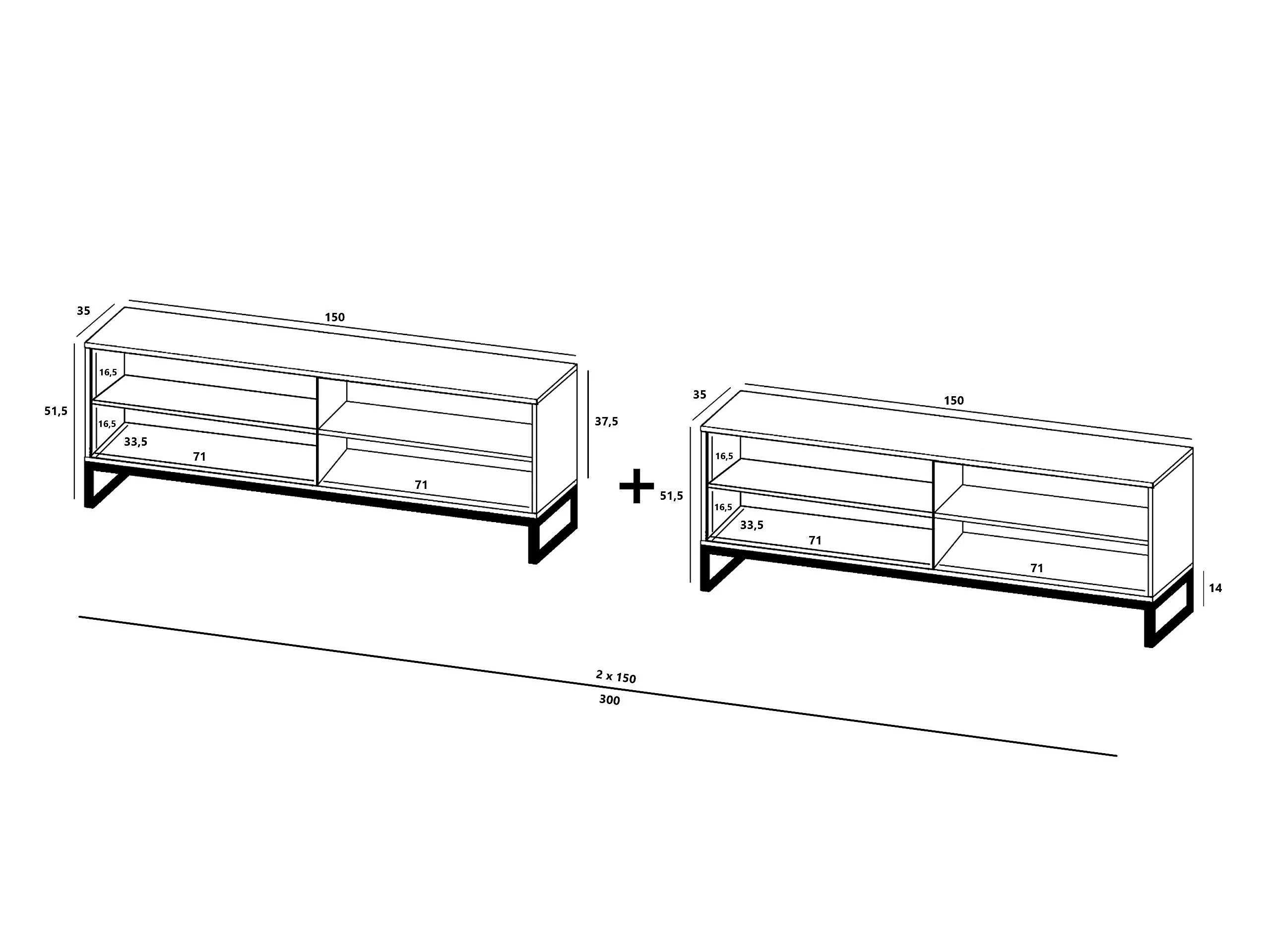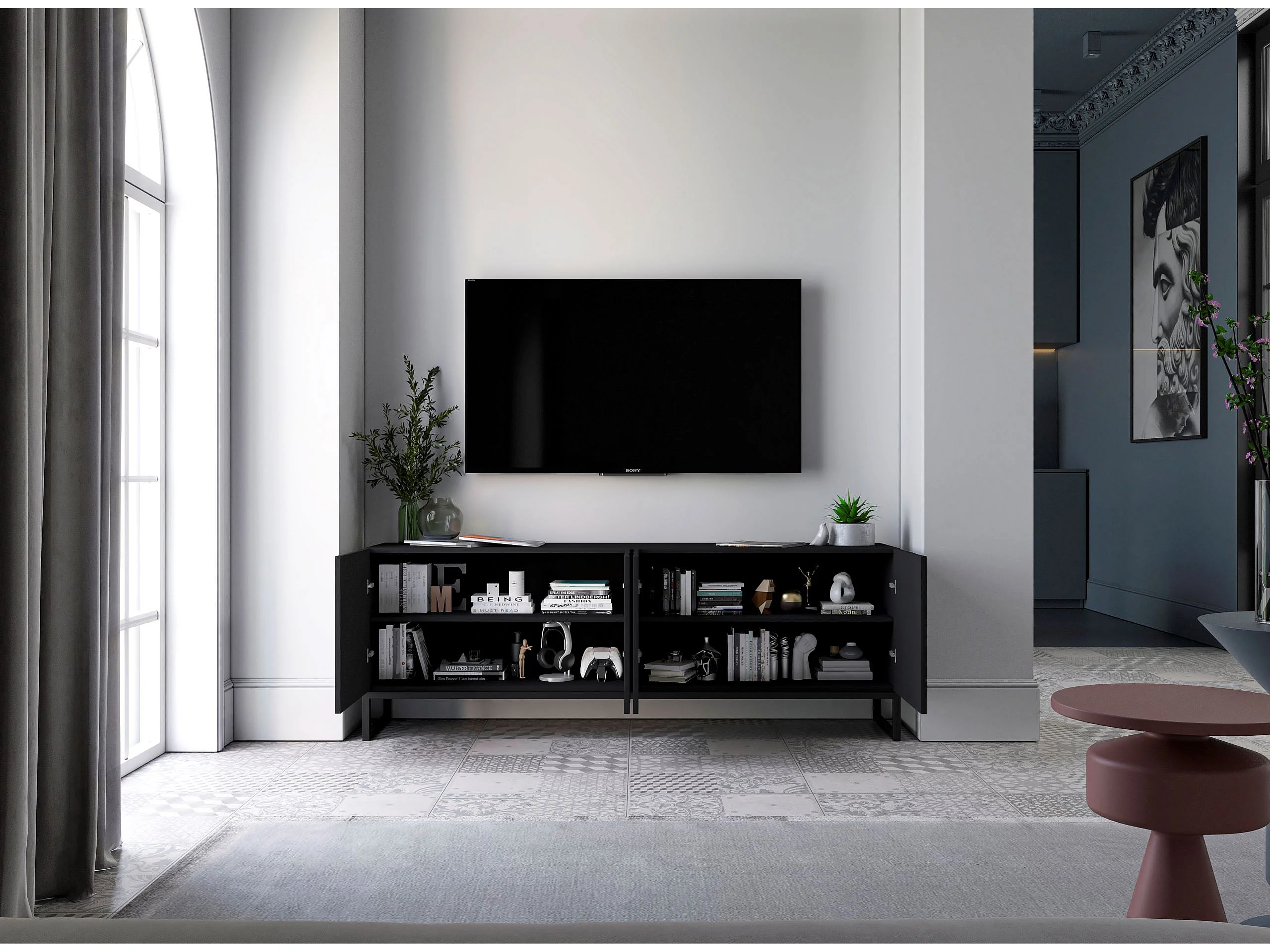 Szafka RTV z 8 drzwiczkami - Korpus czarny mat, ryflowane fronty czarny mat - 300 cm, Czarna metalowa rama