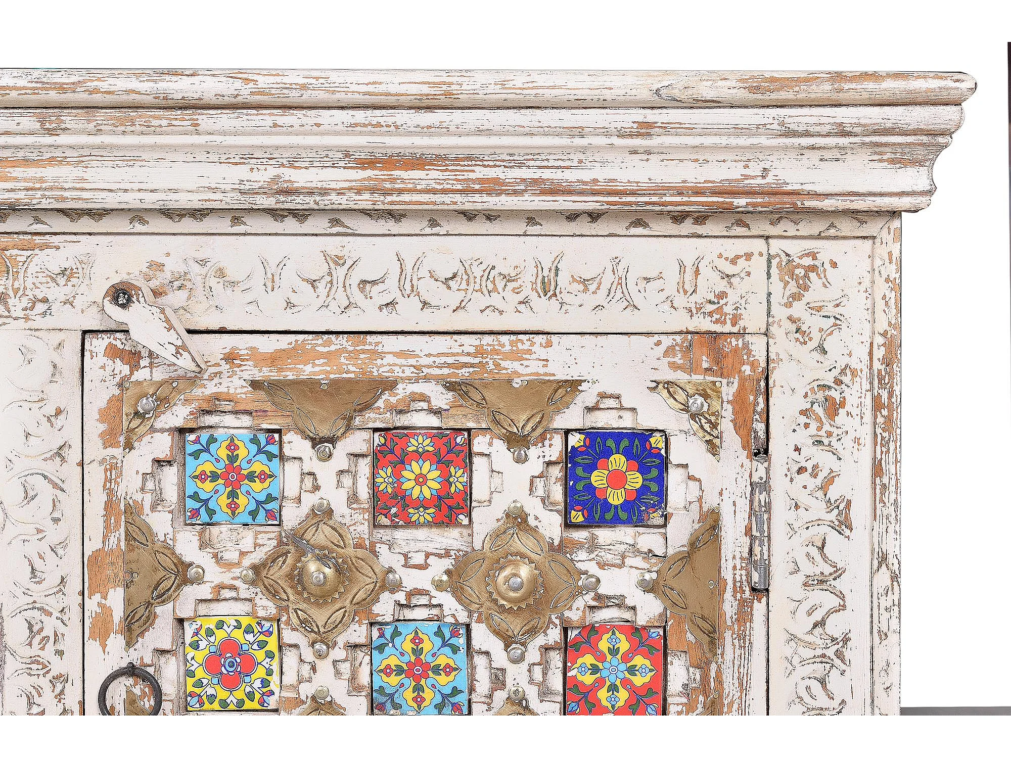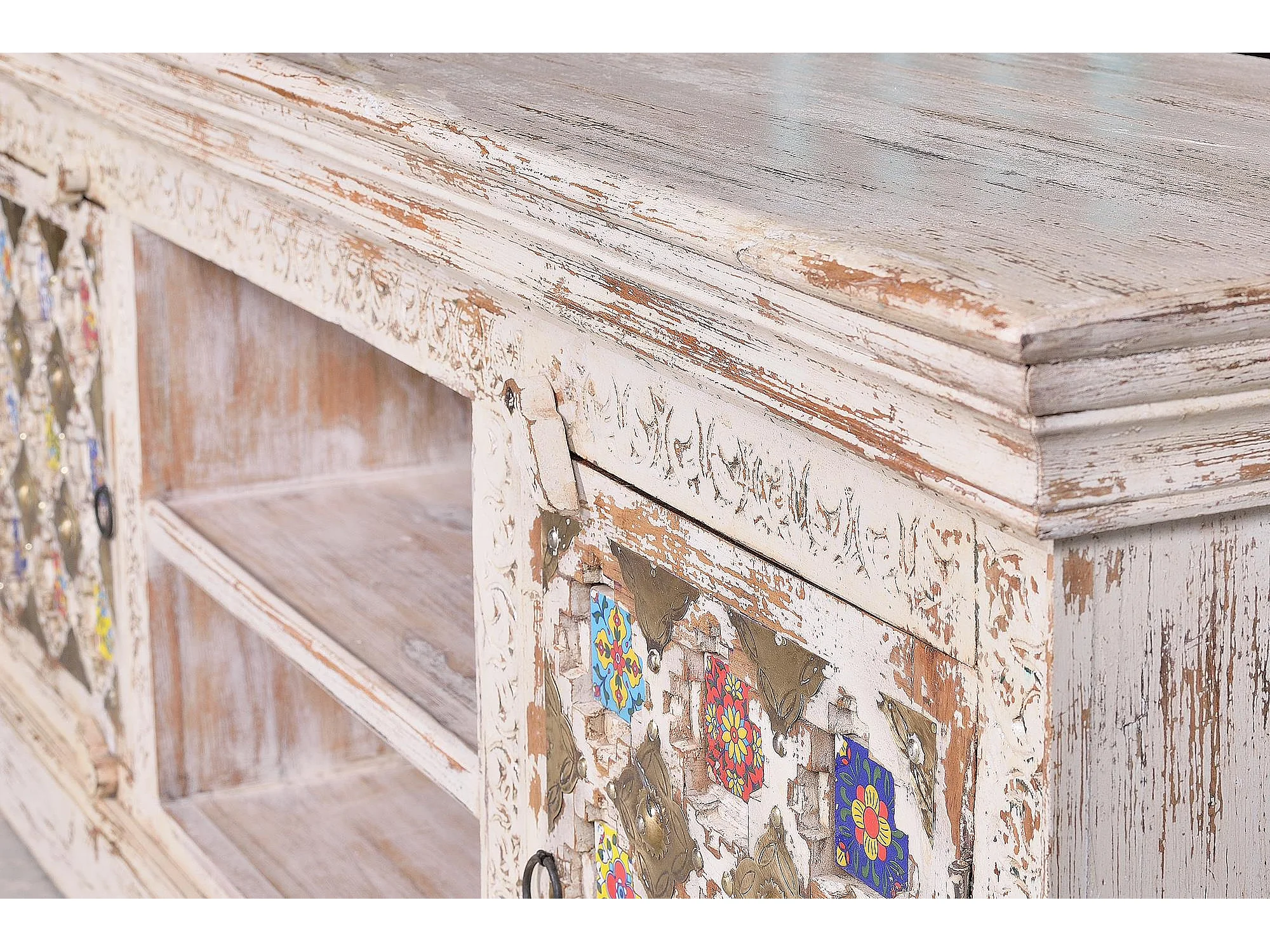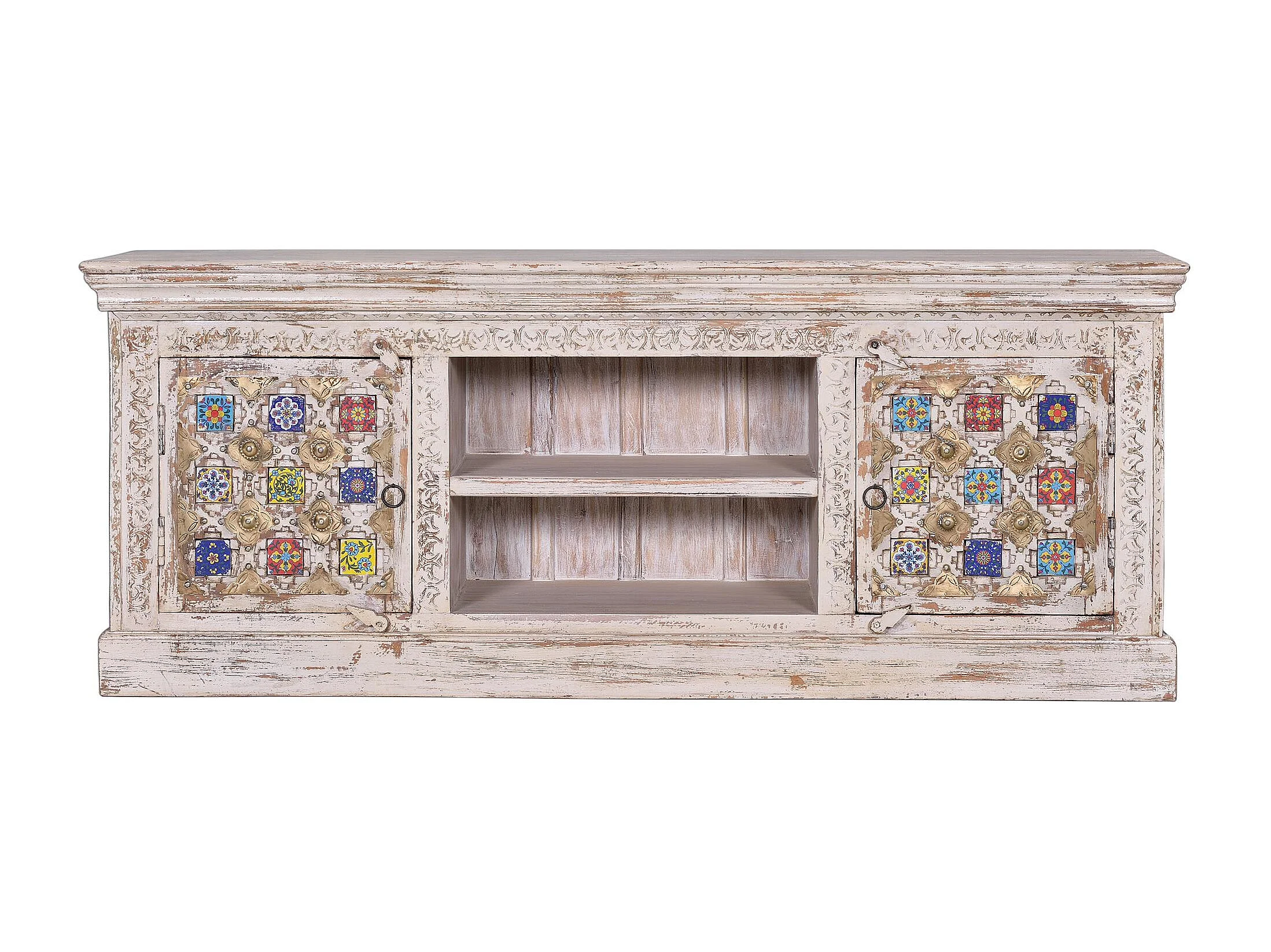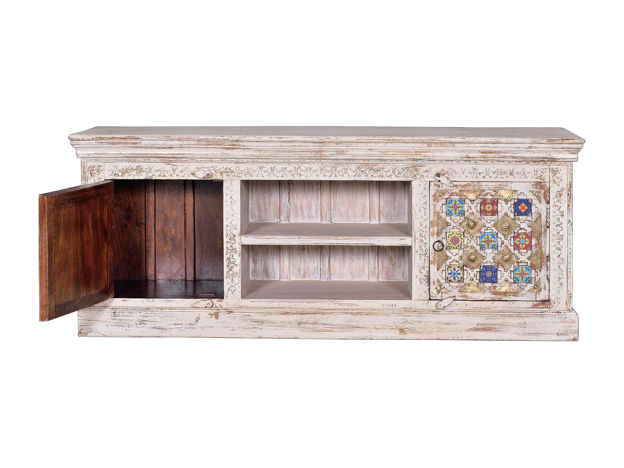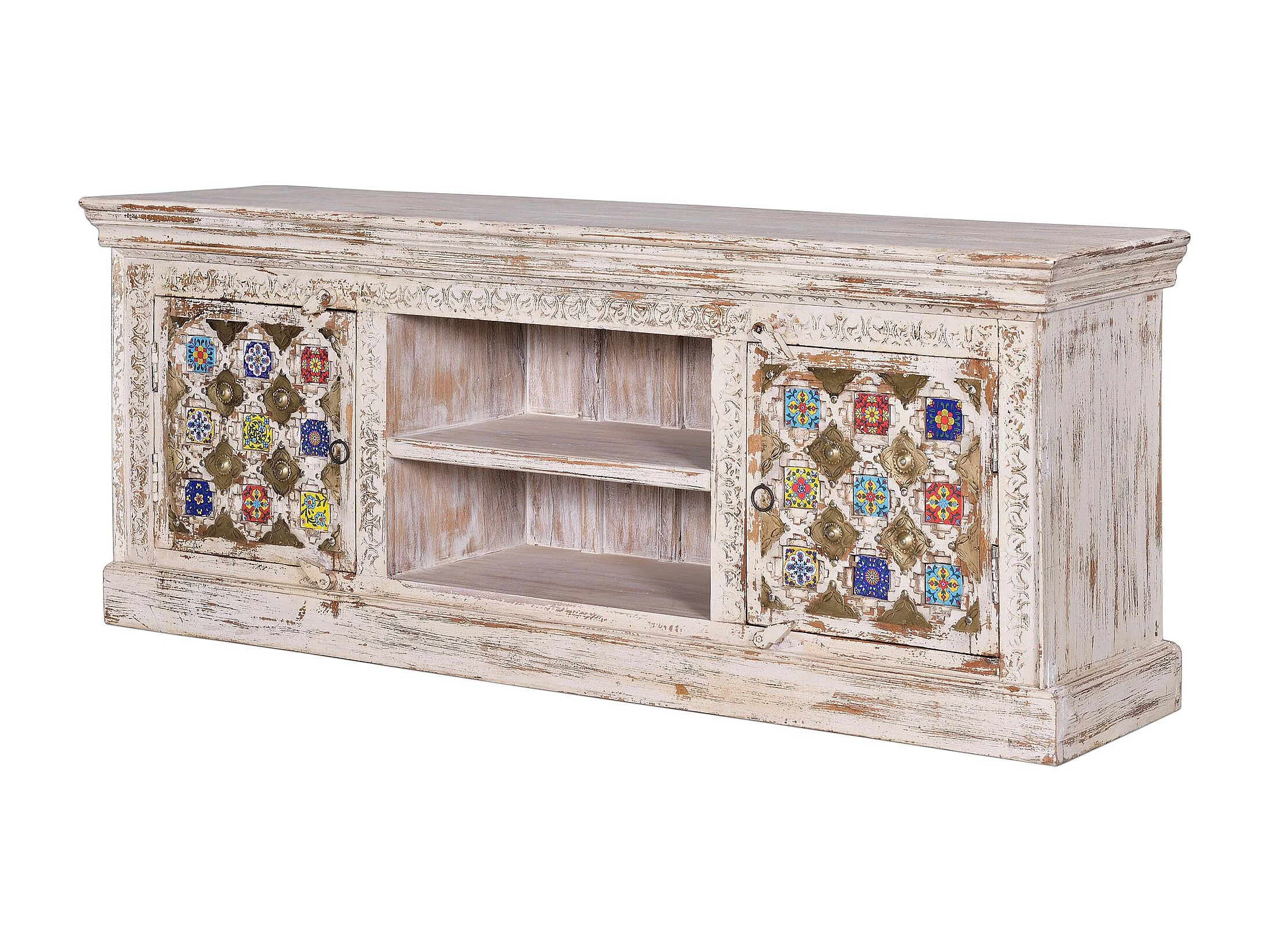Szafka RTV z drewna manguier z ceramicznymi detalami