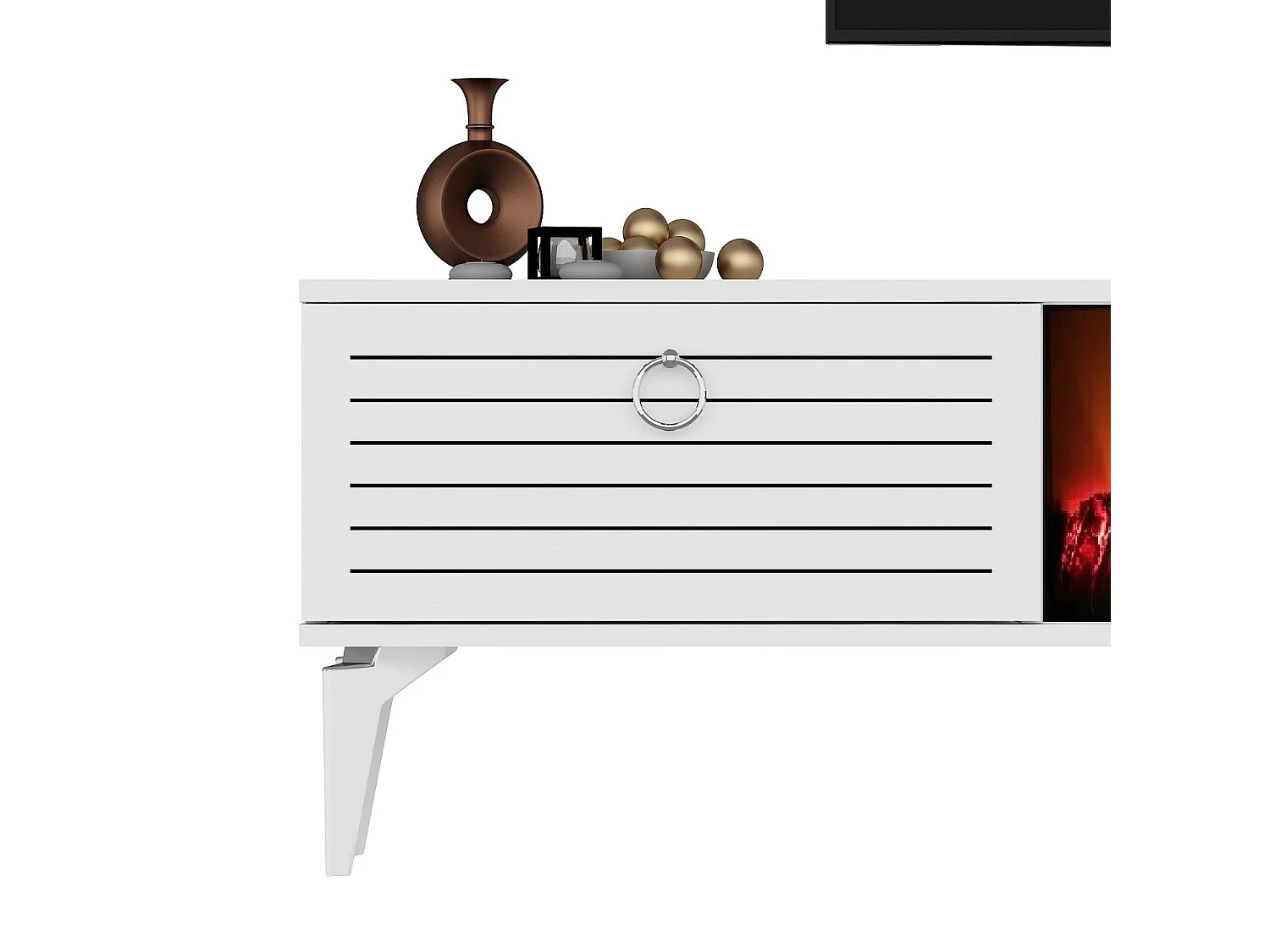 Szafka RTV z kominkiem elektrycznym – 150 cm x 44,6 cm x 29,6 cm – biała – płyta wiórowa pokryta melaminą