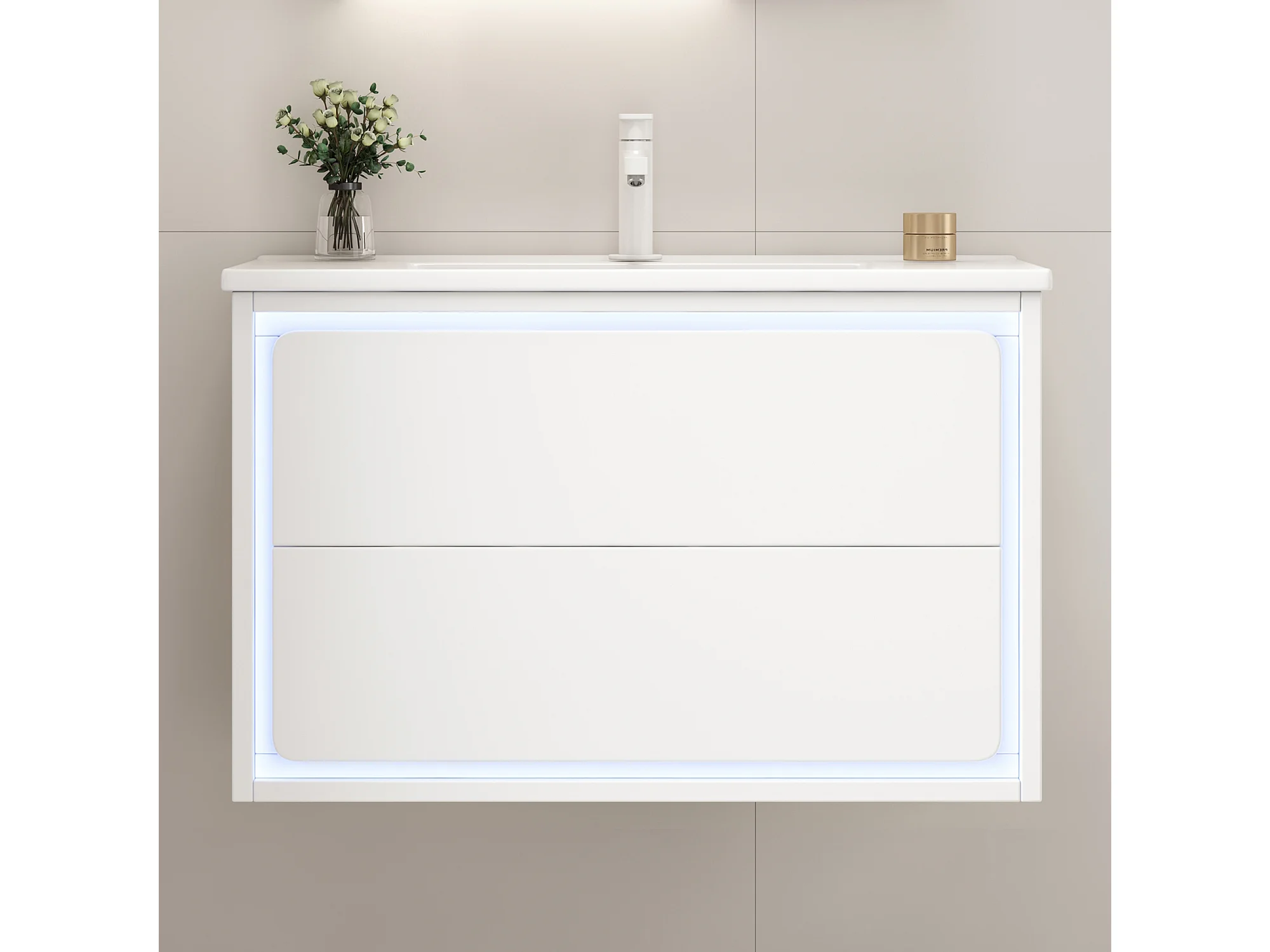 Szafka ścienna pod umywalkę ceramiczną z pojedynczą umywalką - 76 x 46 x 48,5 cm - wykończenie lakierowane - z diodami LED + 2 szuflady - ceramika + MDF - biała