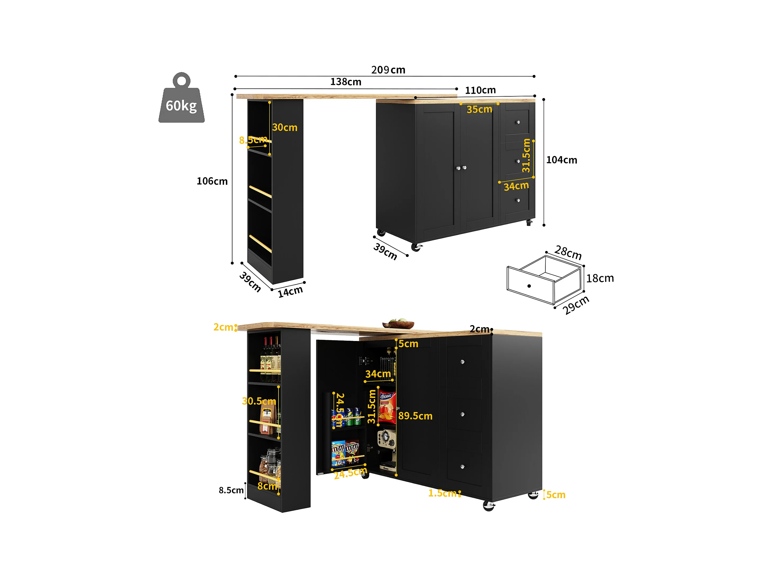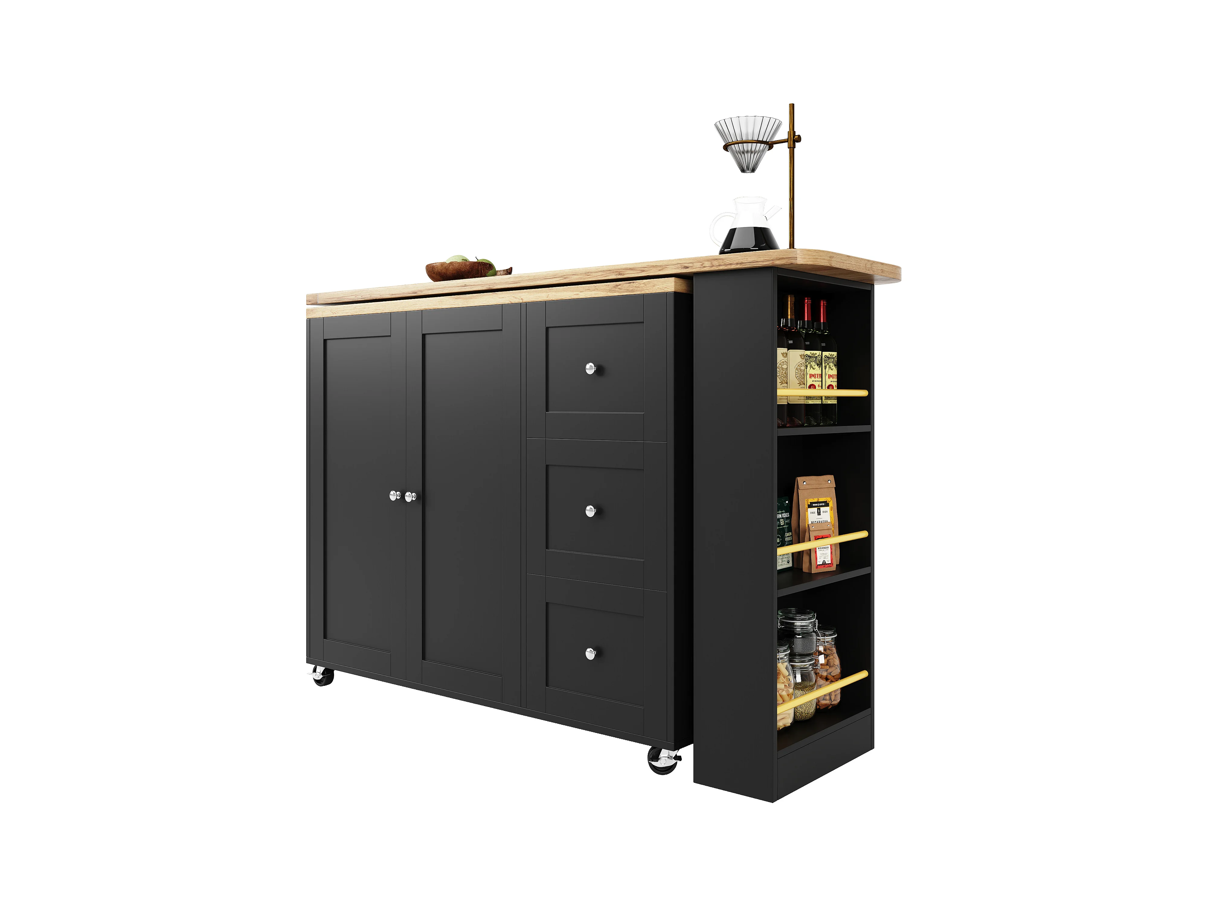 Obrotowa szafka barowa - 4 szuflady, 3 półki do przechowywania i wnęka - blat MDF imitujący drewno - 138 cm/105x39x102 cm - czarny