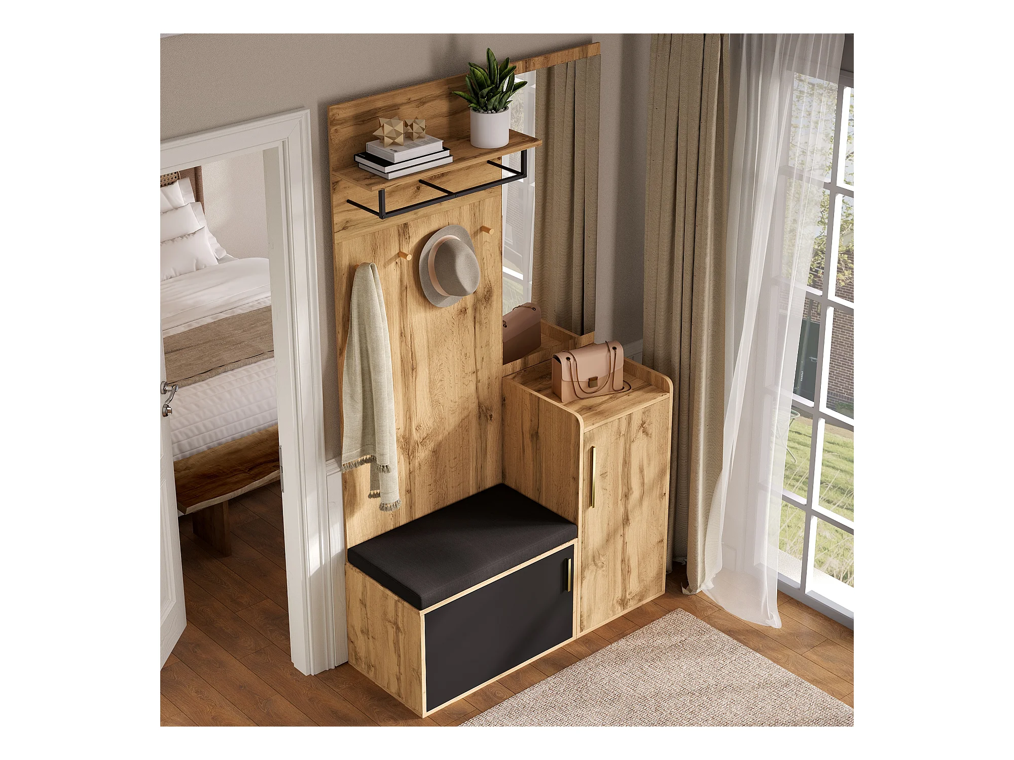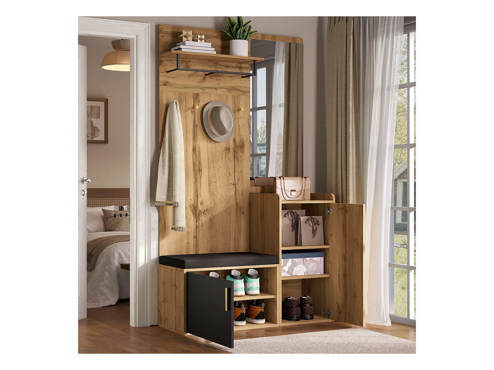 Szafka z lustrem + ławką + półką na buty i wieszakami - 100 x 38 x 185 cm - płyta wiórowa - naturalna