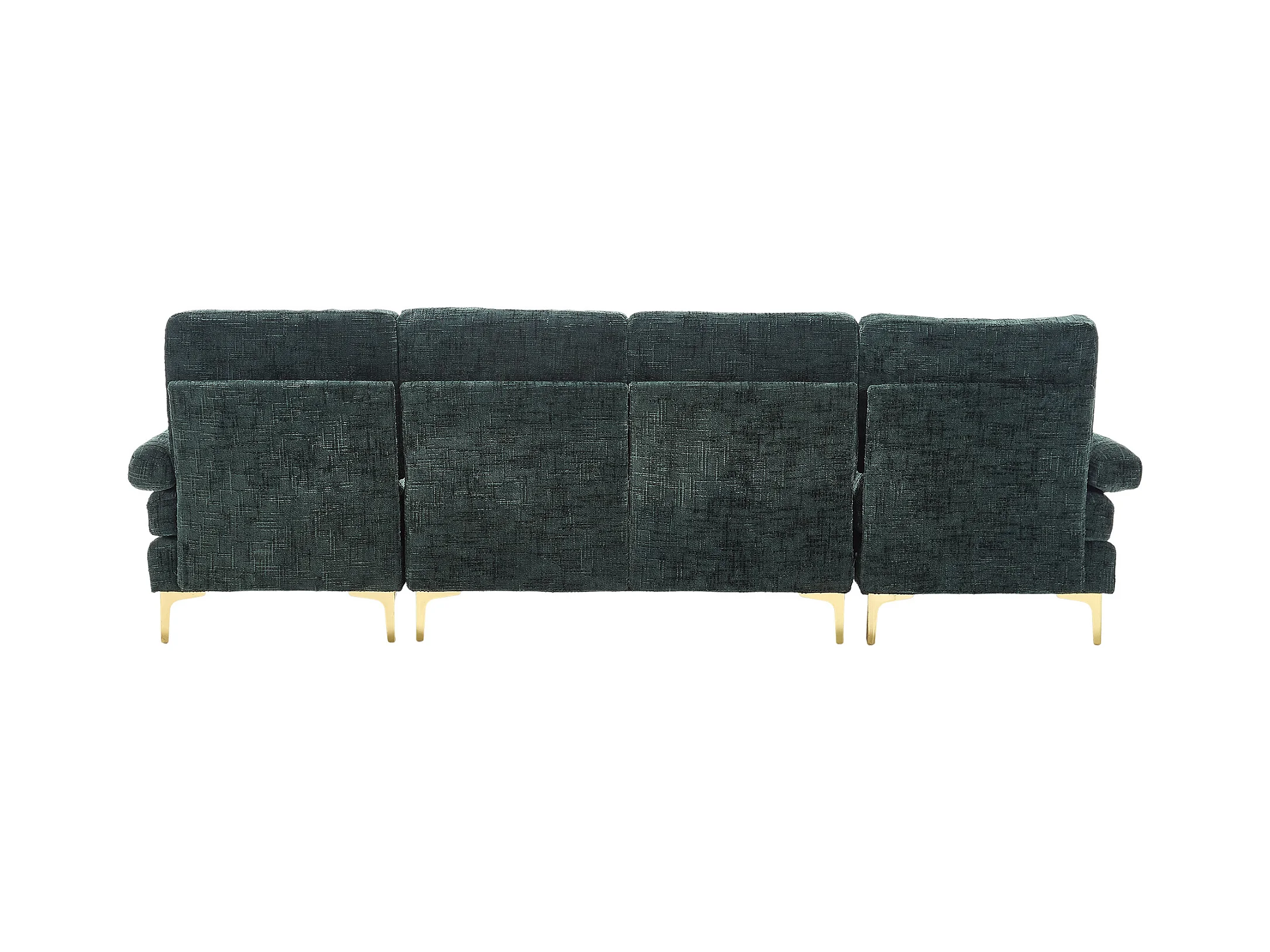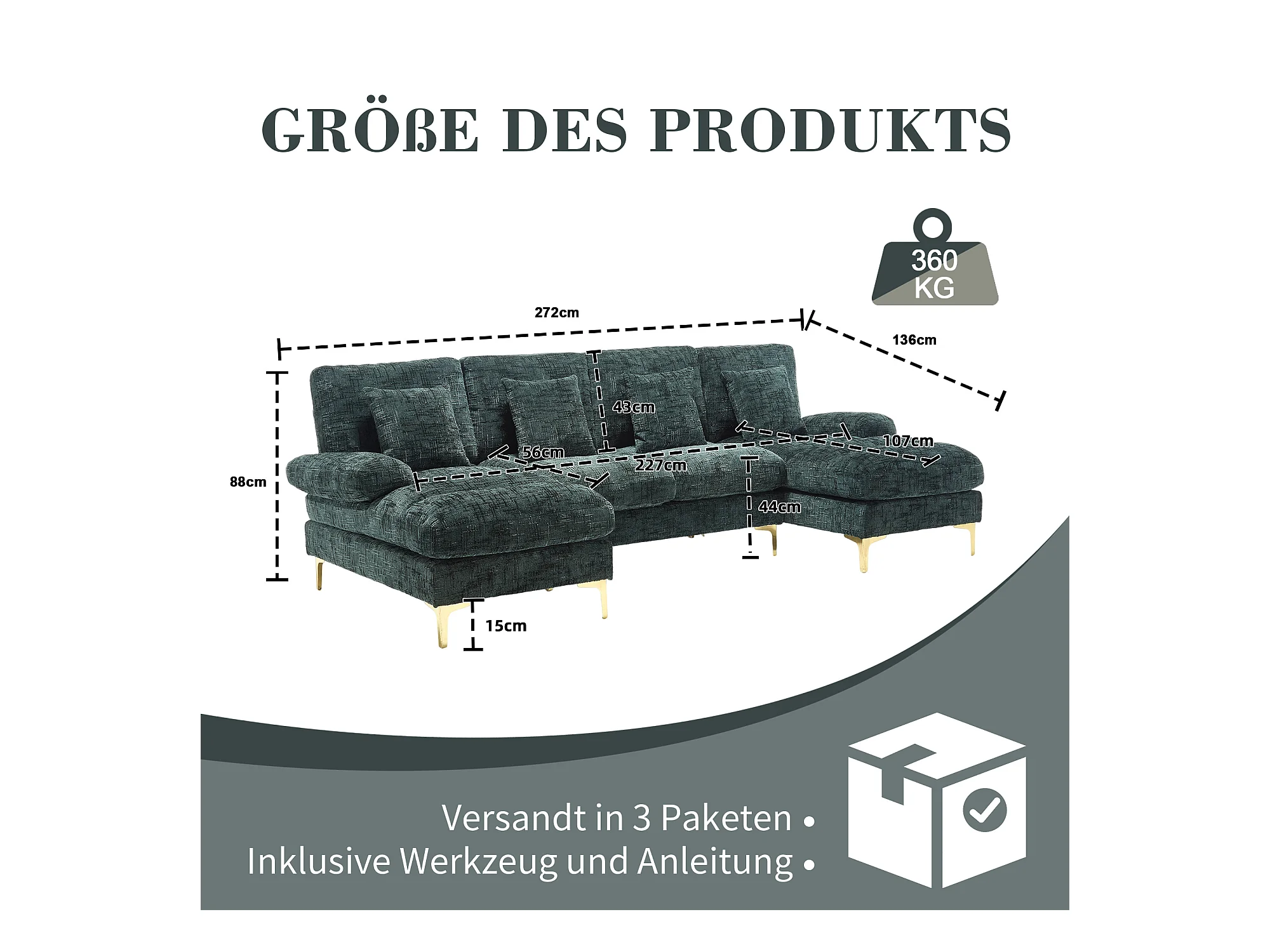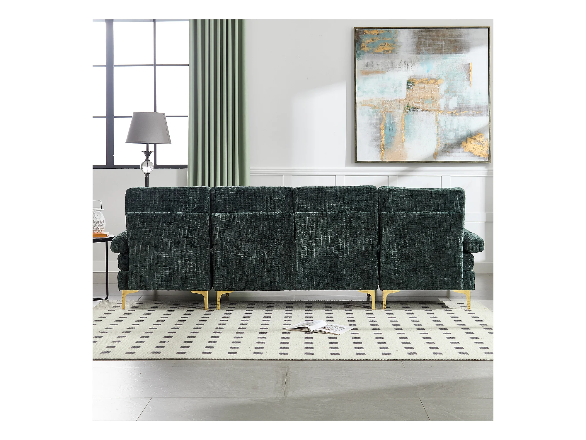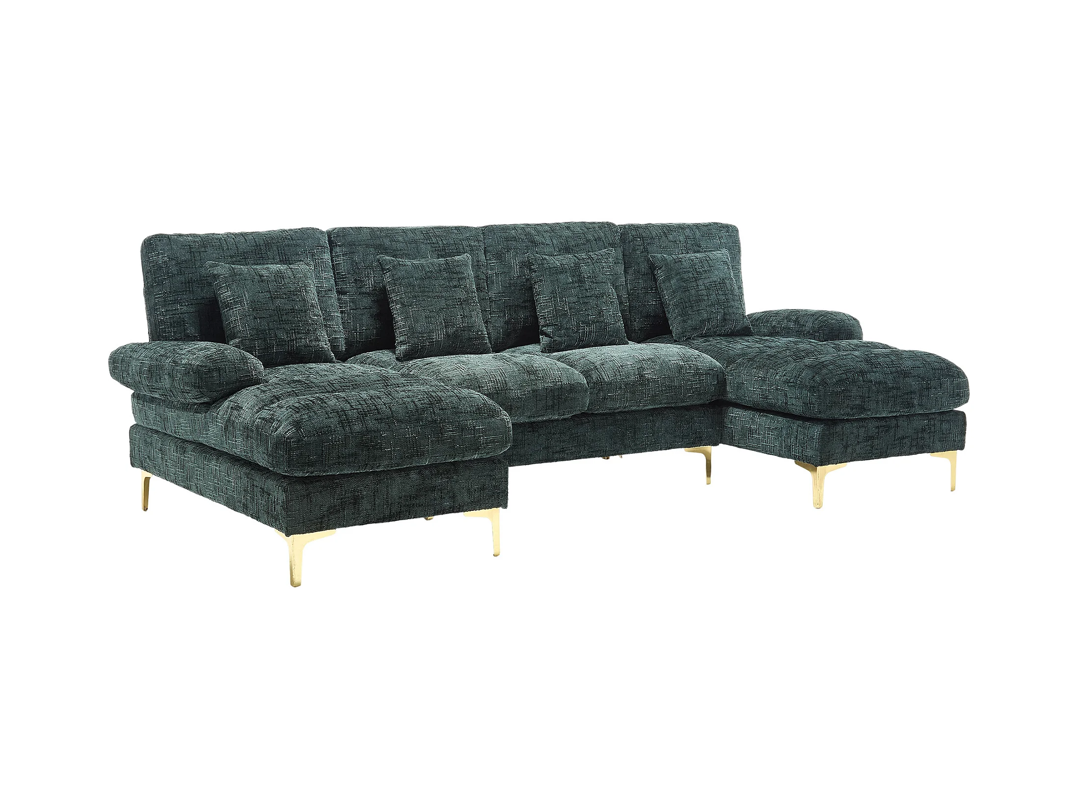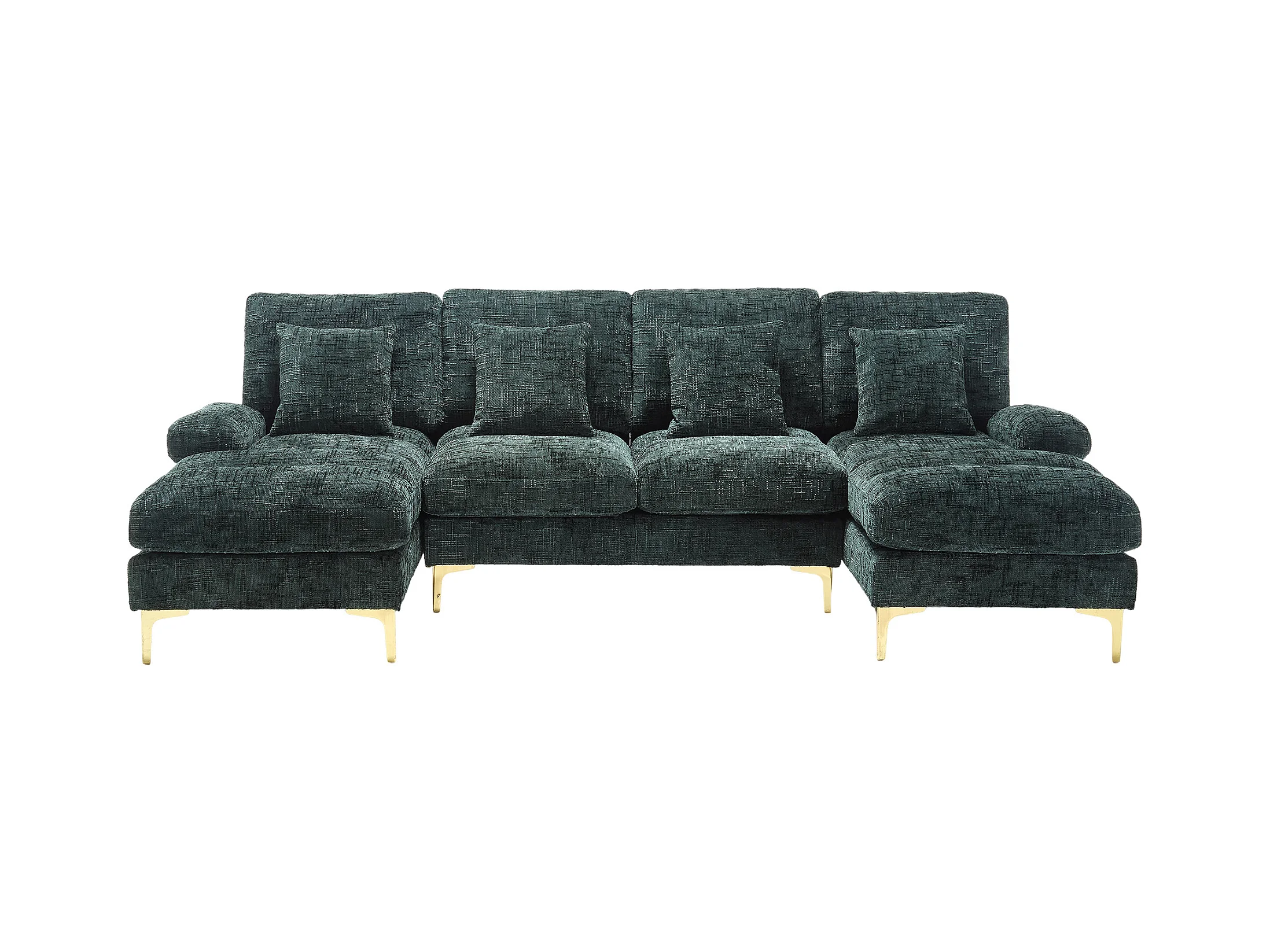 Szmaragdowozielona sofa w kształcie litery U z szenili, tapicerowana, z poduszkami i poduszkami dekoracyjnymi, do salonu i sypialni