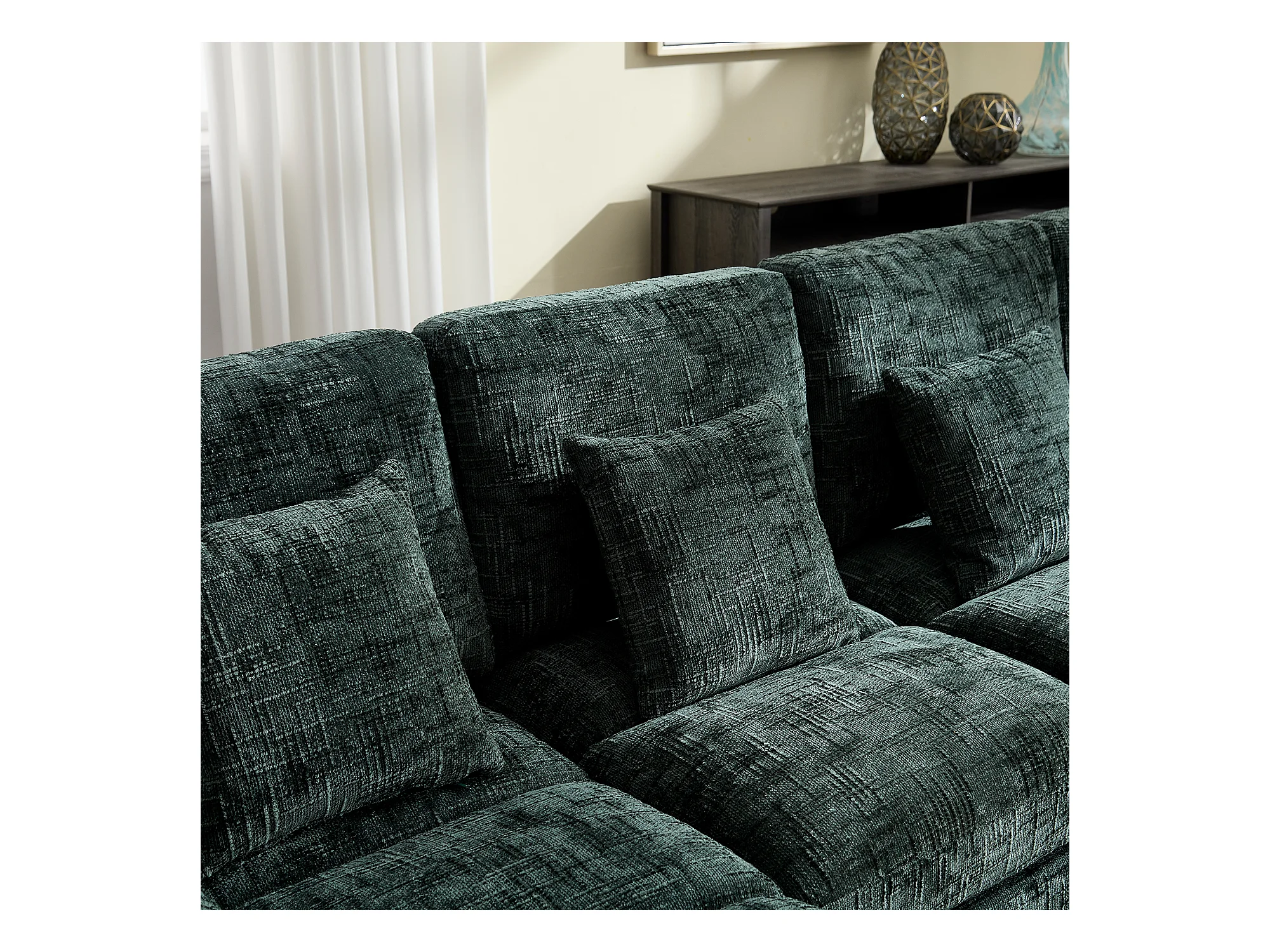 Szmaragdowo-zielona, 4-osobowa sofa modułowa Chenille z pufem ze schowkiem, uchwytami na kubki i kieszeniami bocznymi – do salonu