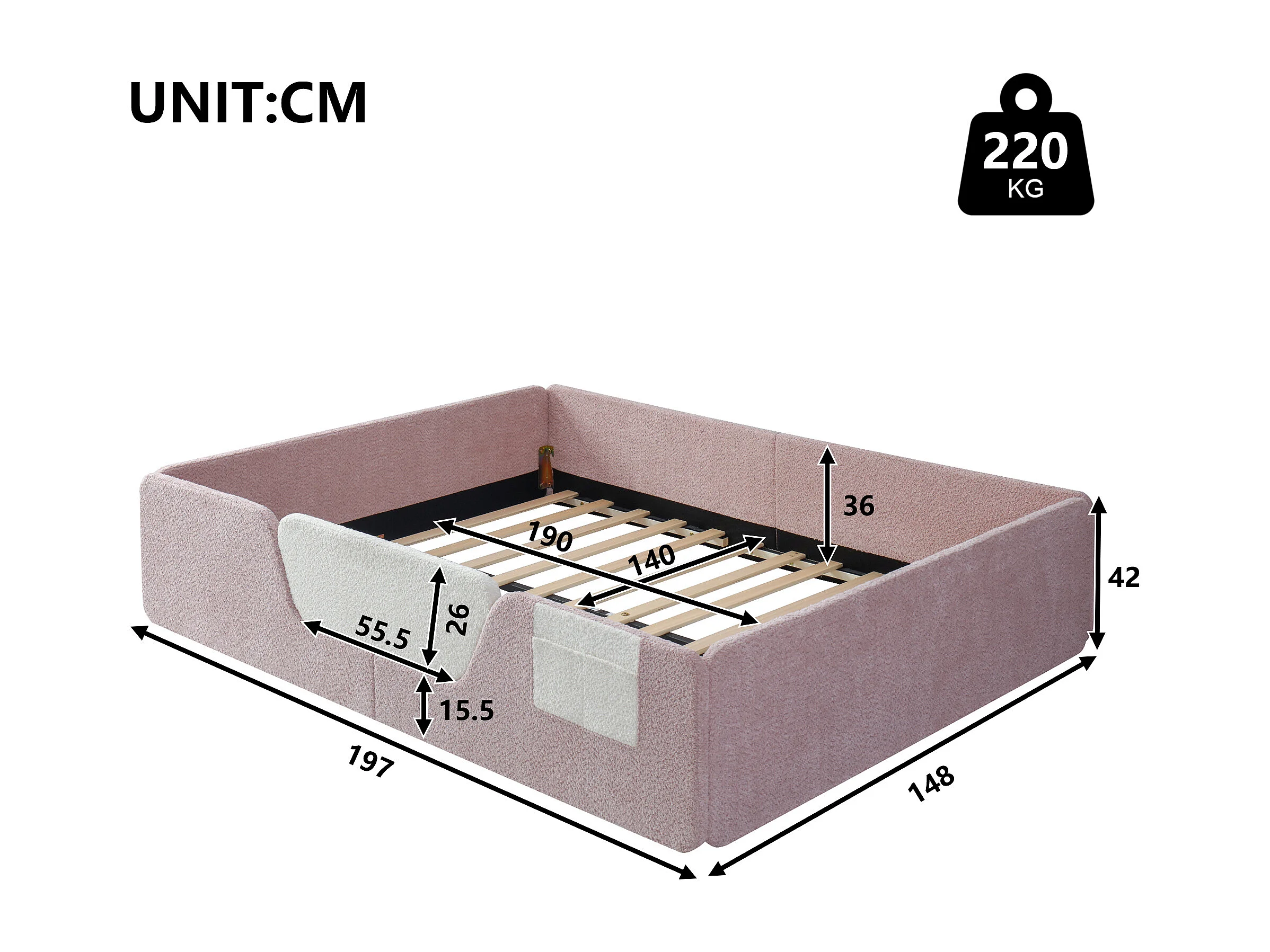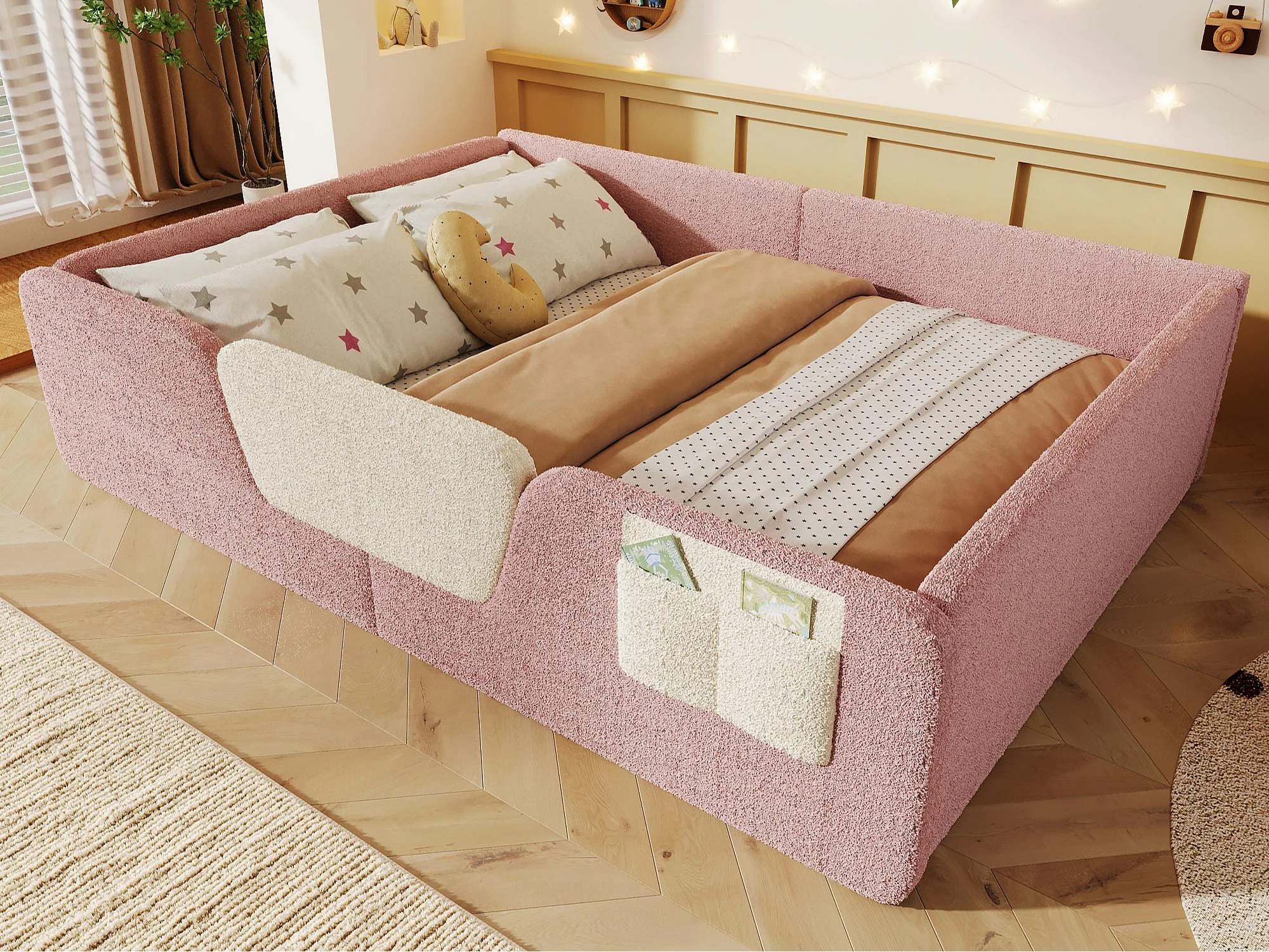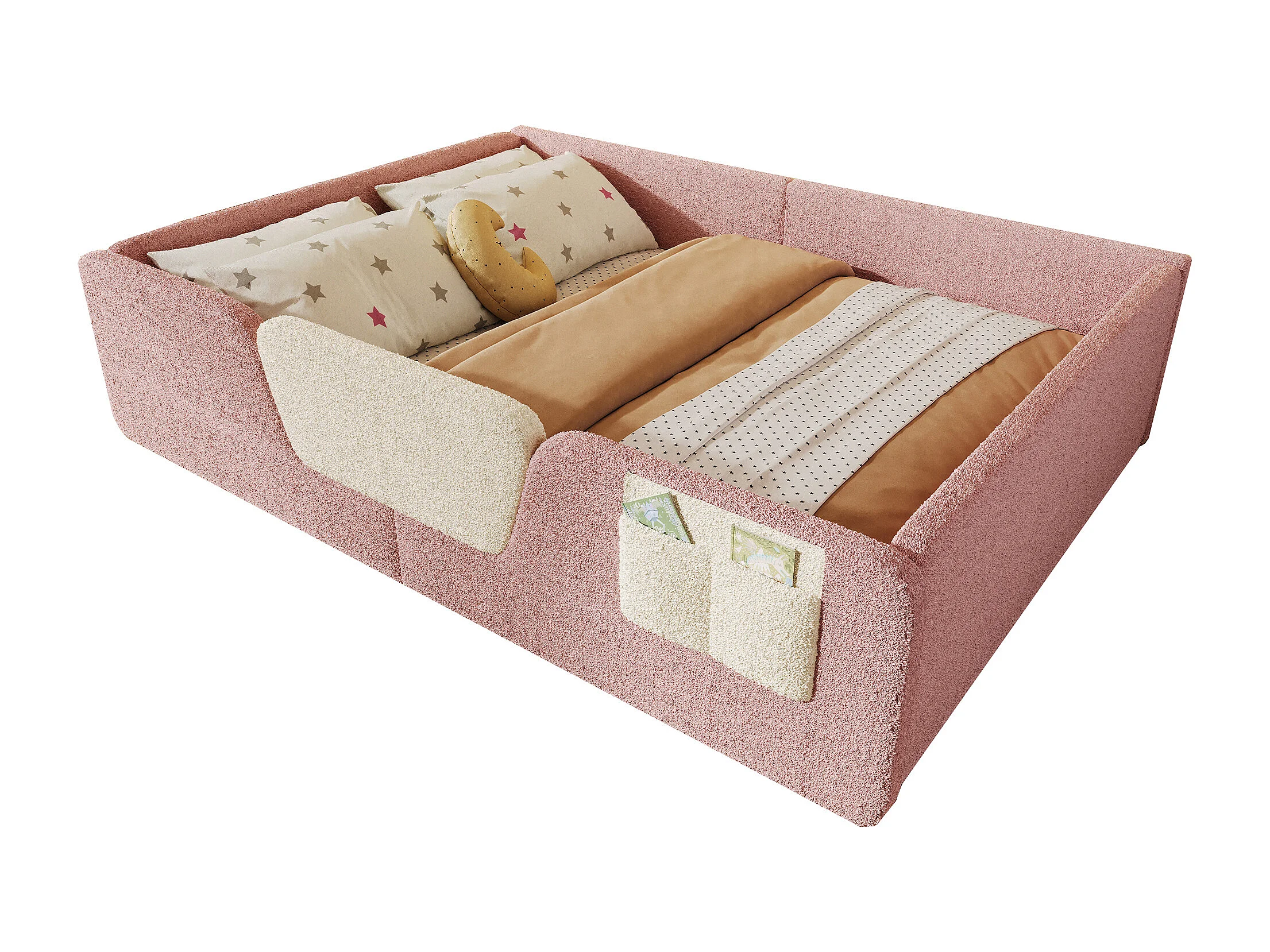 Tapicerowane łóżko dziecięce 140x190 cm - z wyjmowanymi barierkami bezpieczeństwa - z torbą do przechowywania - różowy (materac nie jest wliczony w cenę)