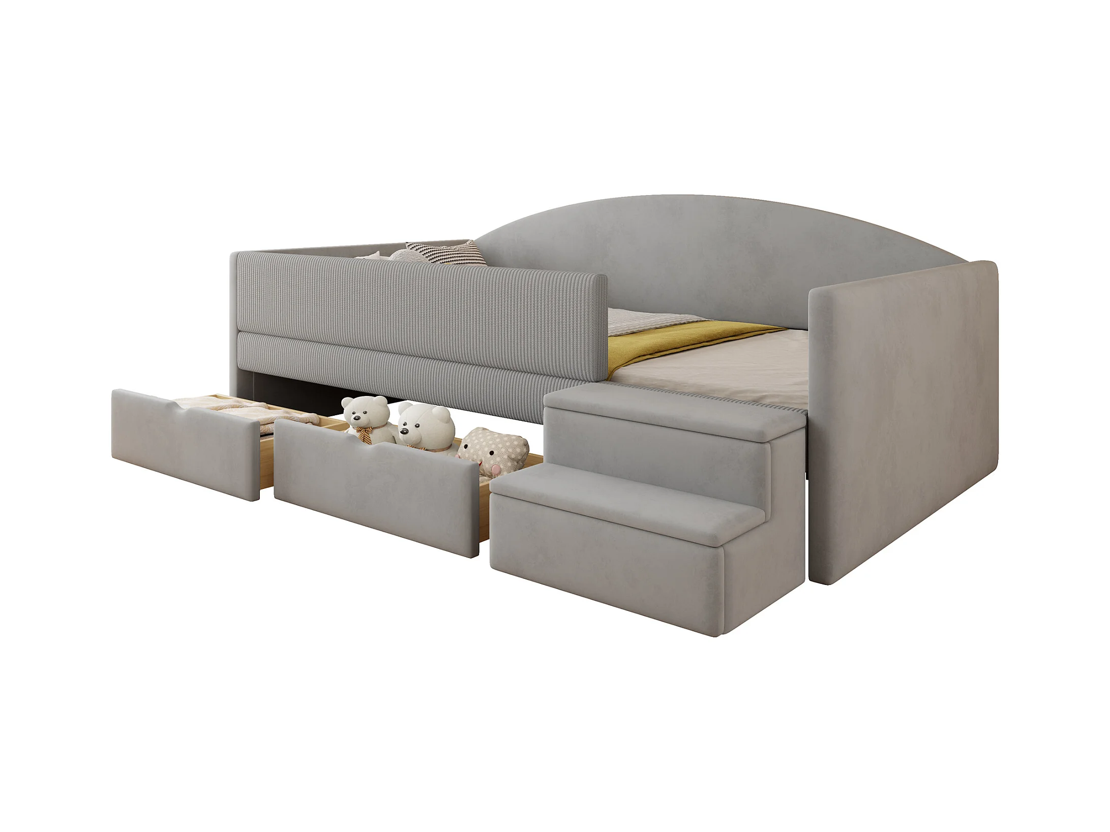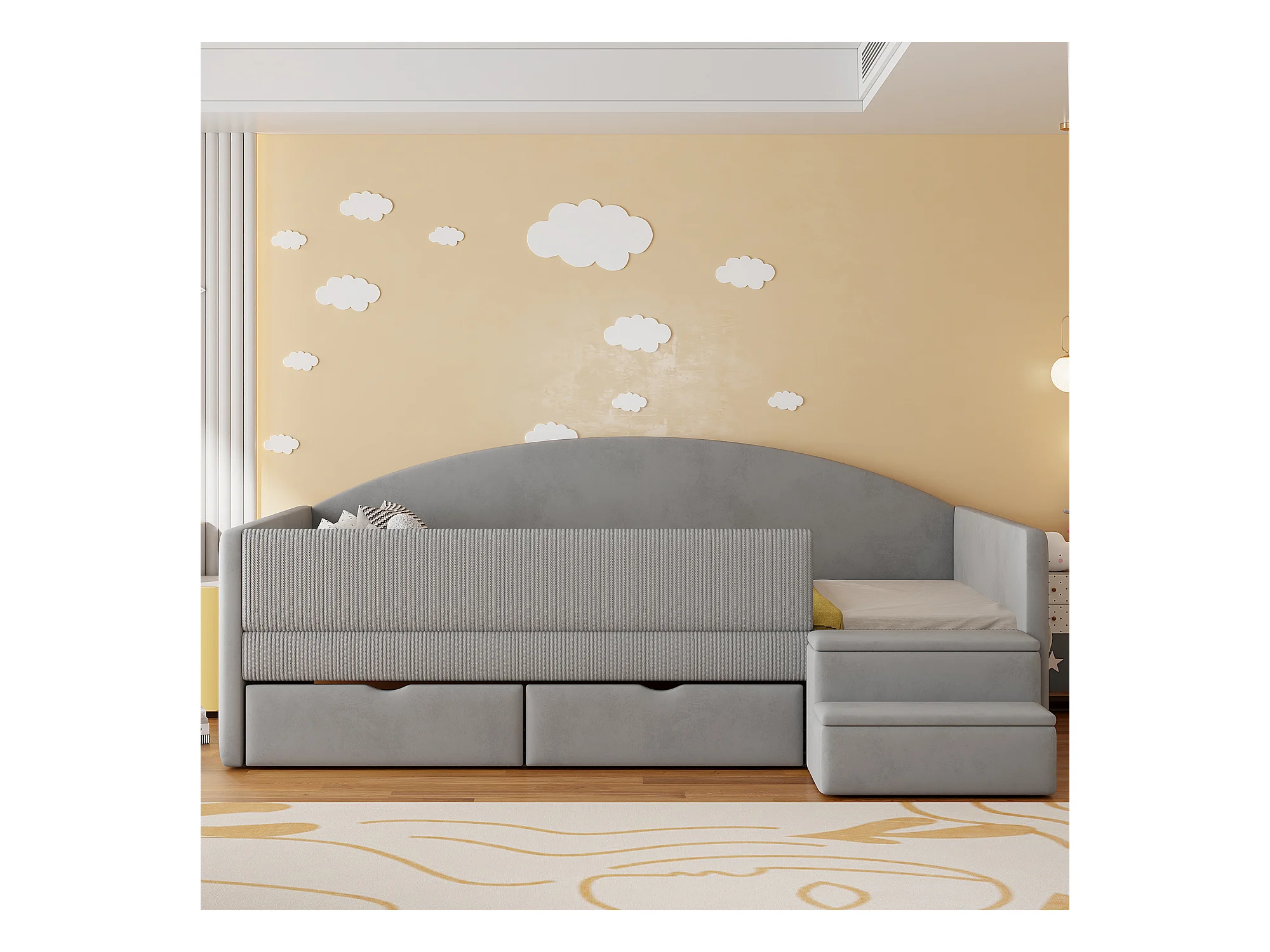 Tapicerowane łóżko dziecięce 90x190 cm - z 2 szufladami - z stopniami - welur - szary (materac nie jest wliczony w cenę)