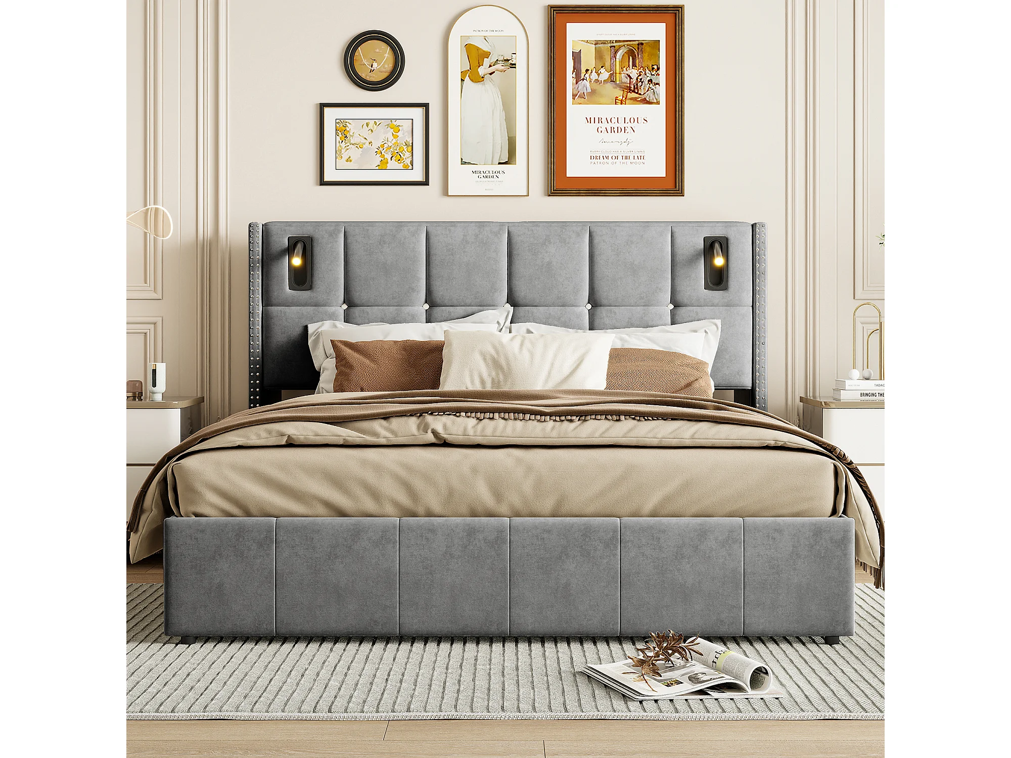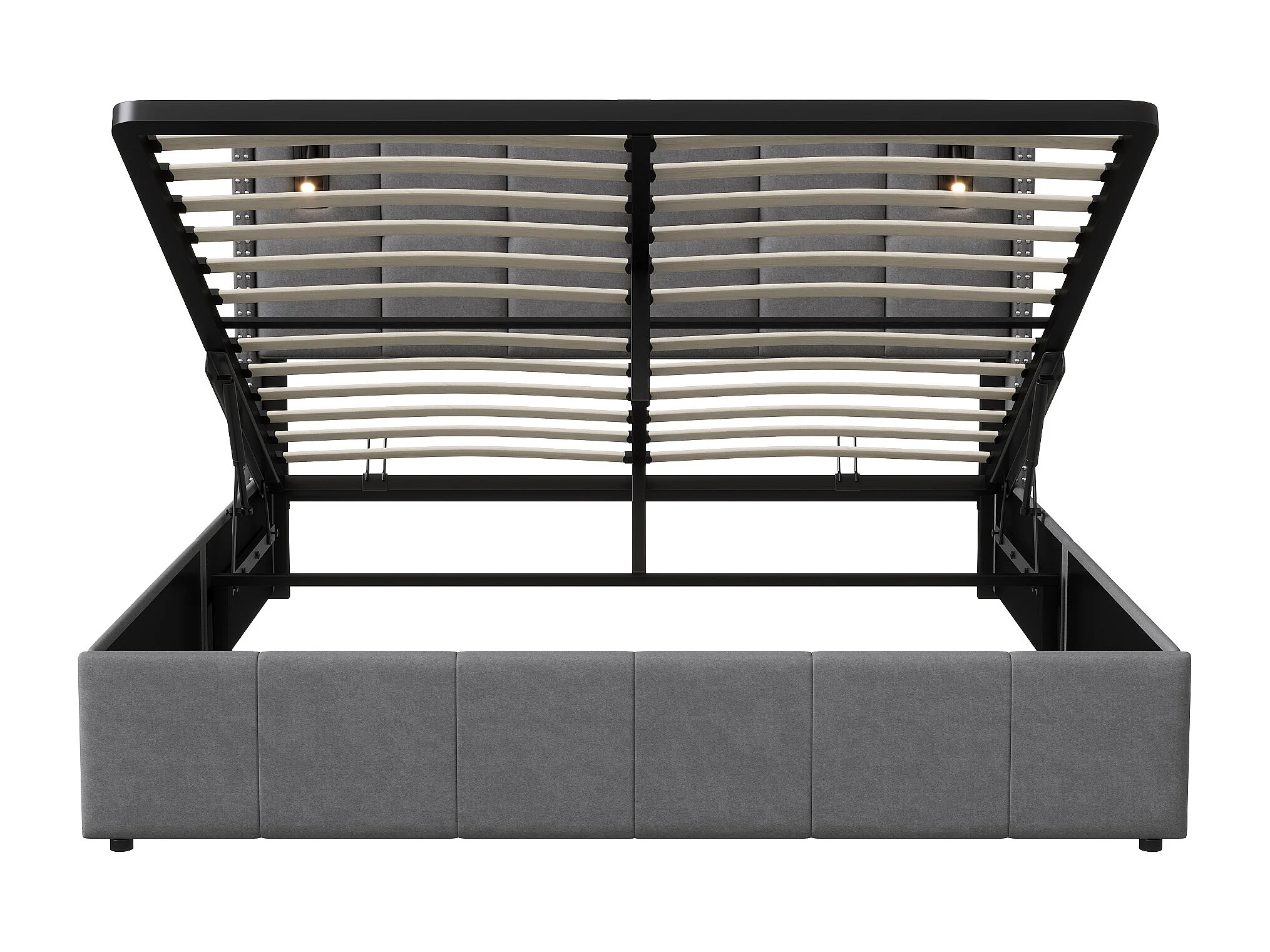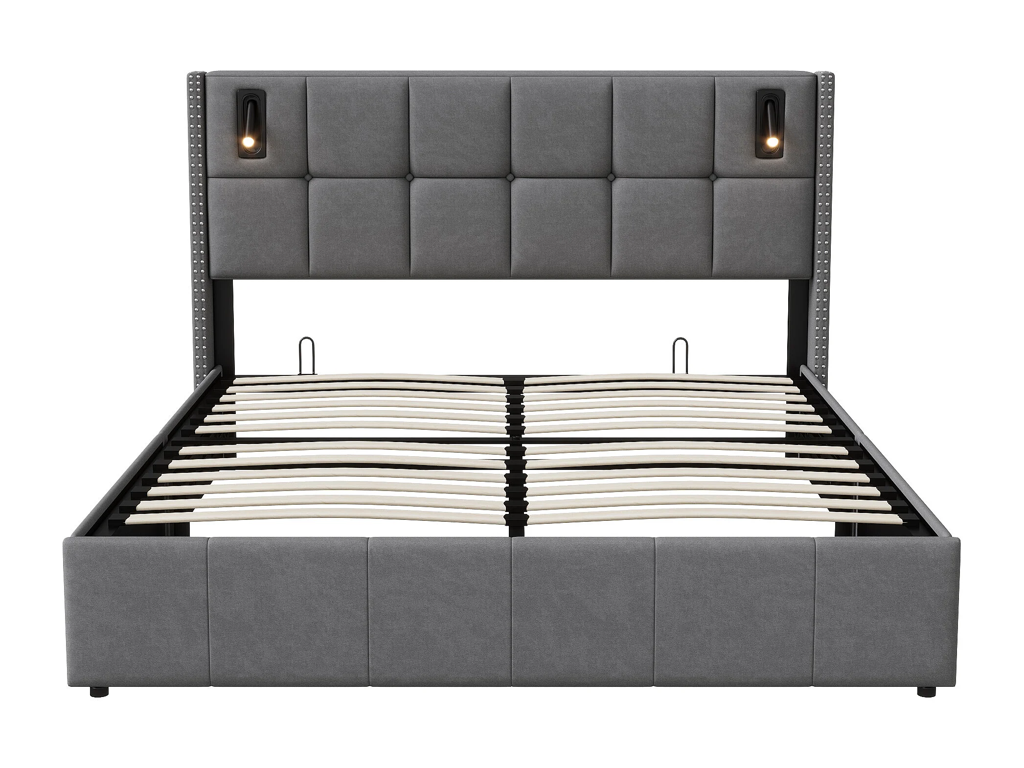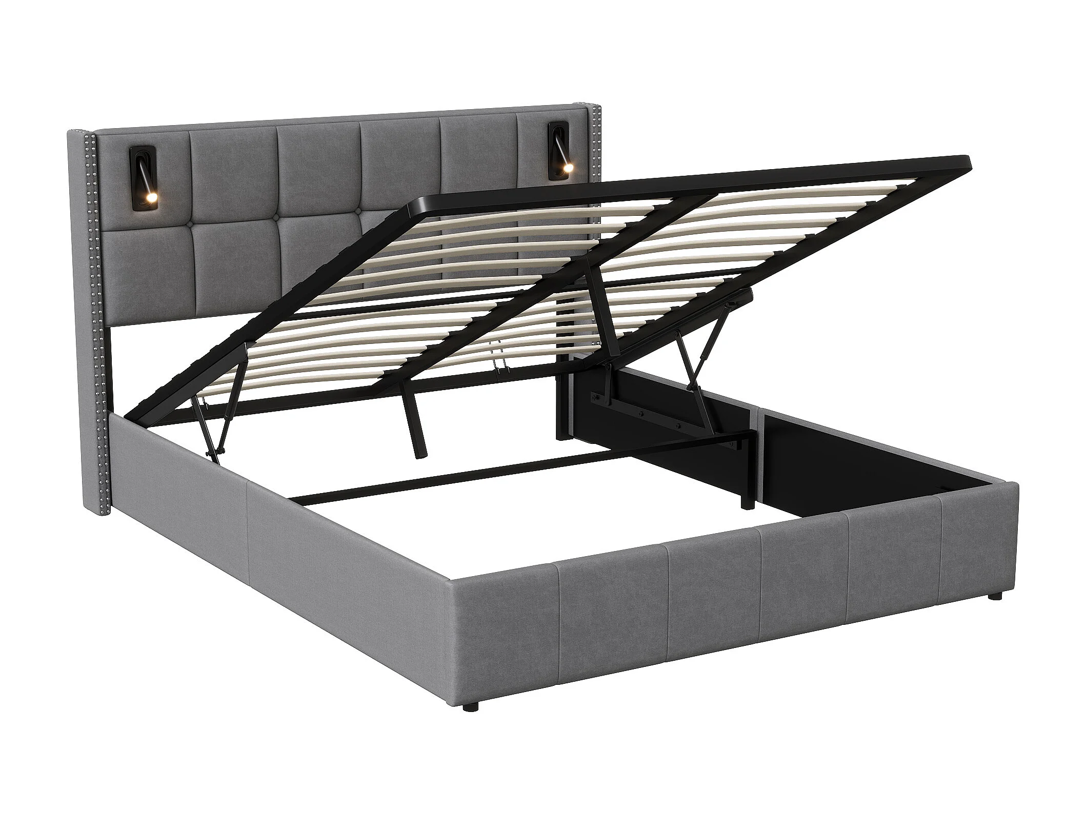 Tapicerowane łóżko podwójne z szarym aksamitem 140x200 cm z hydraulicznym schowkiem, lampkami do czytania i portem USB