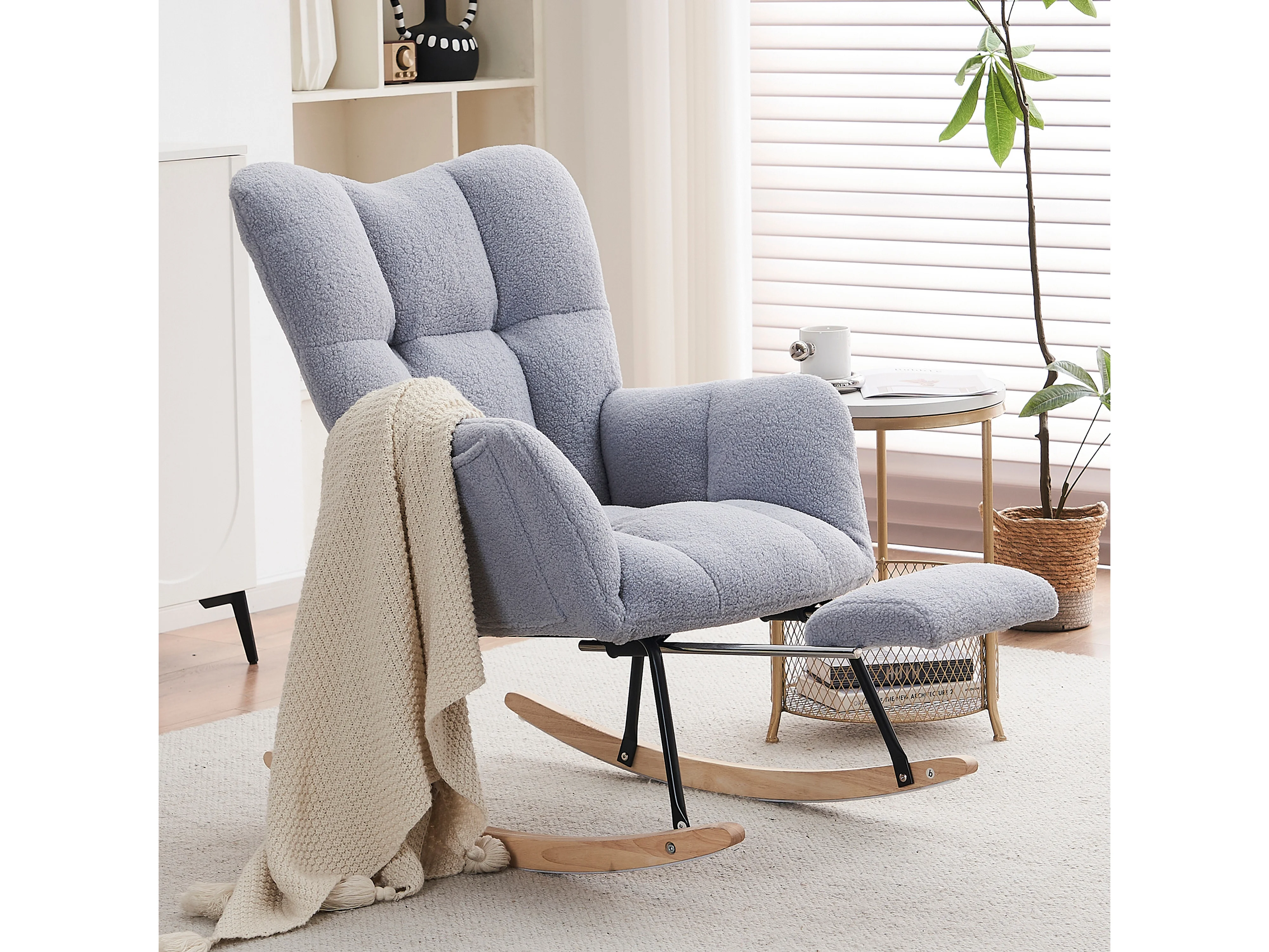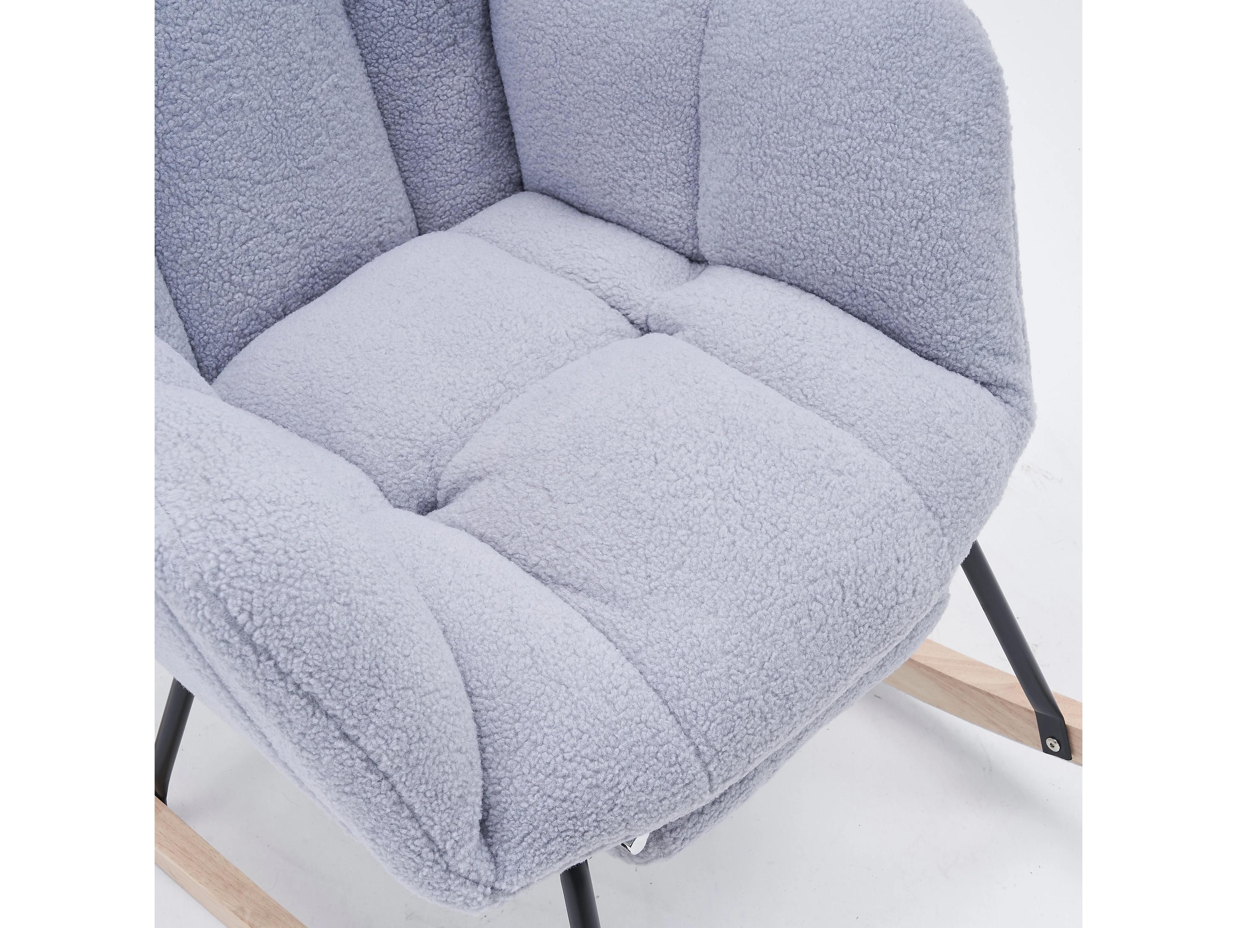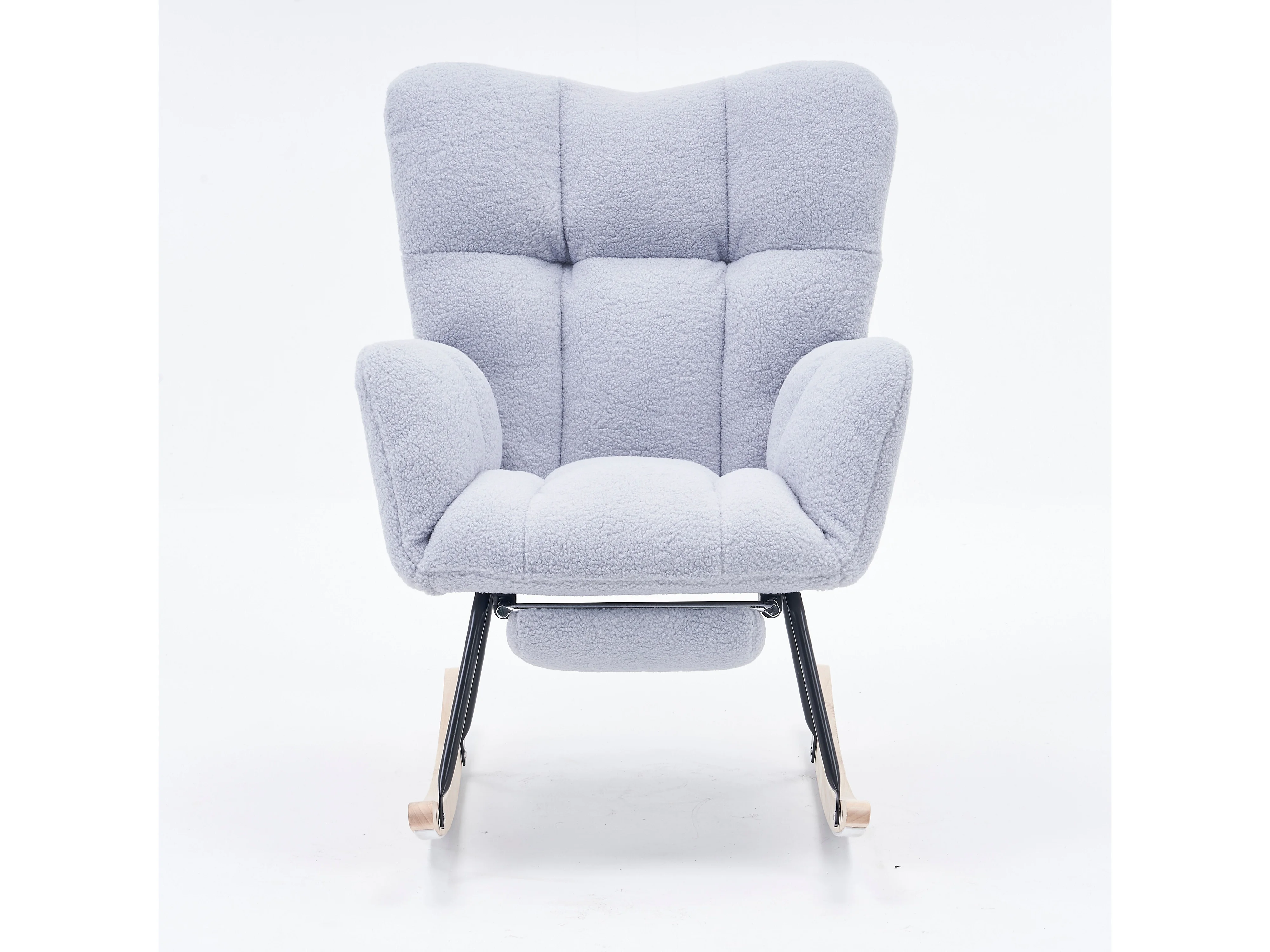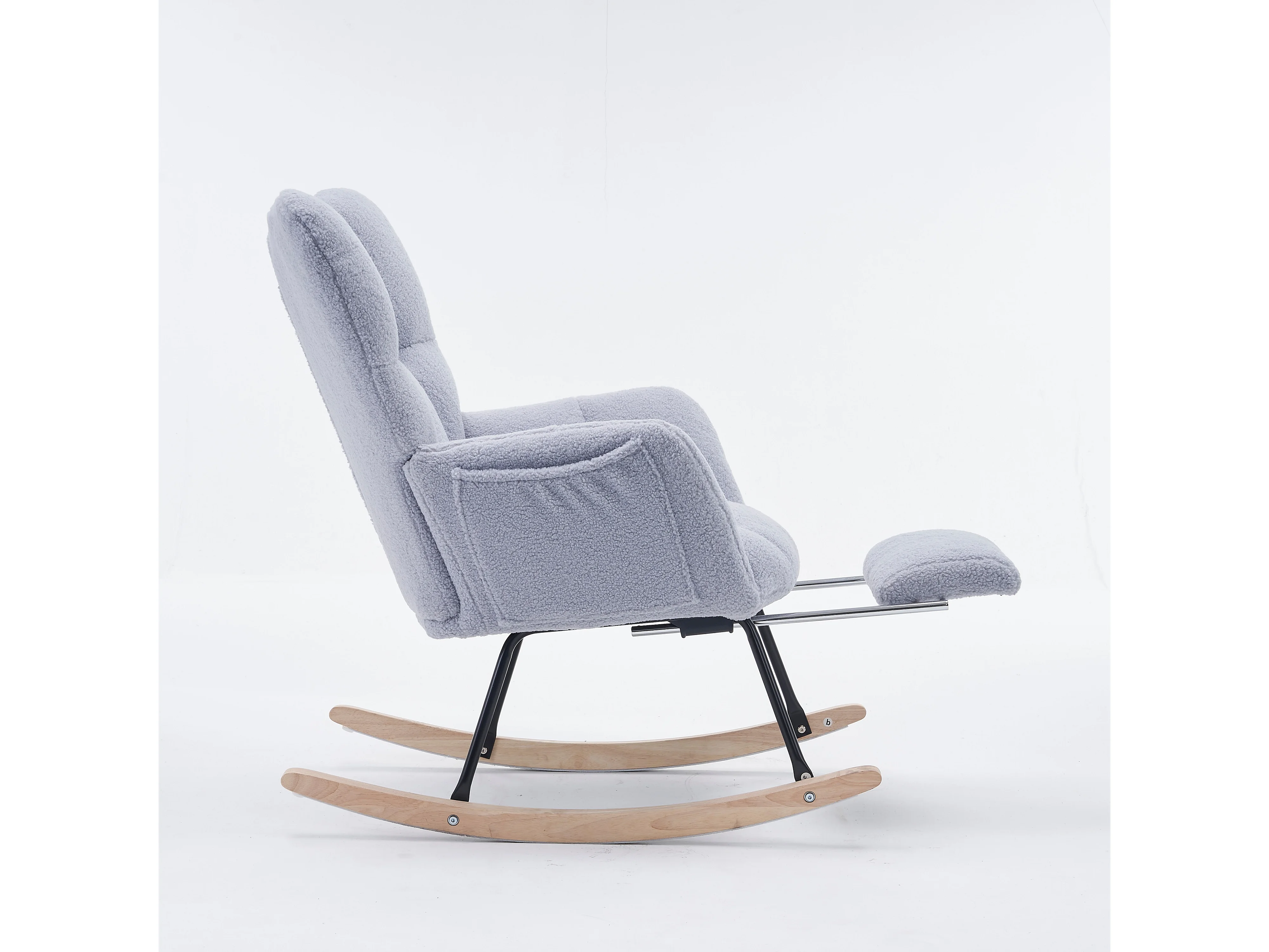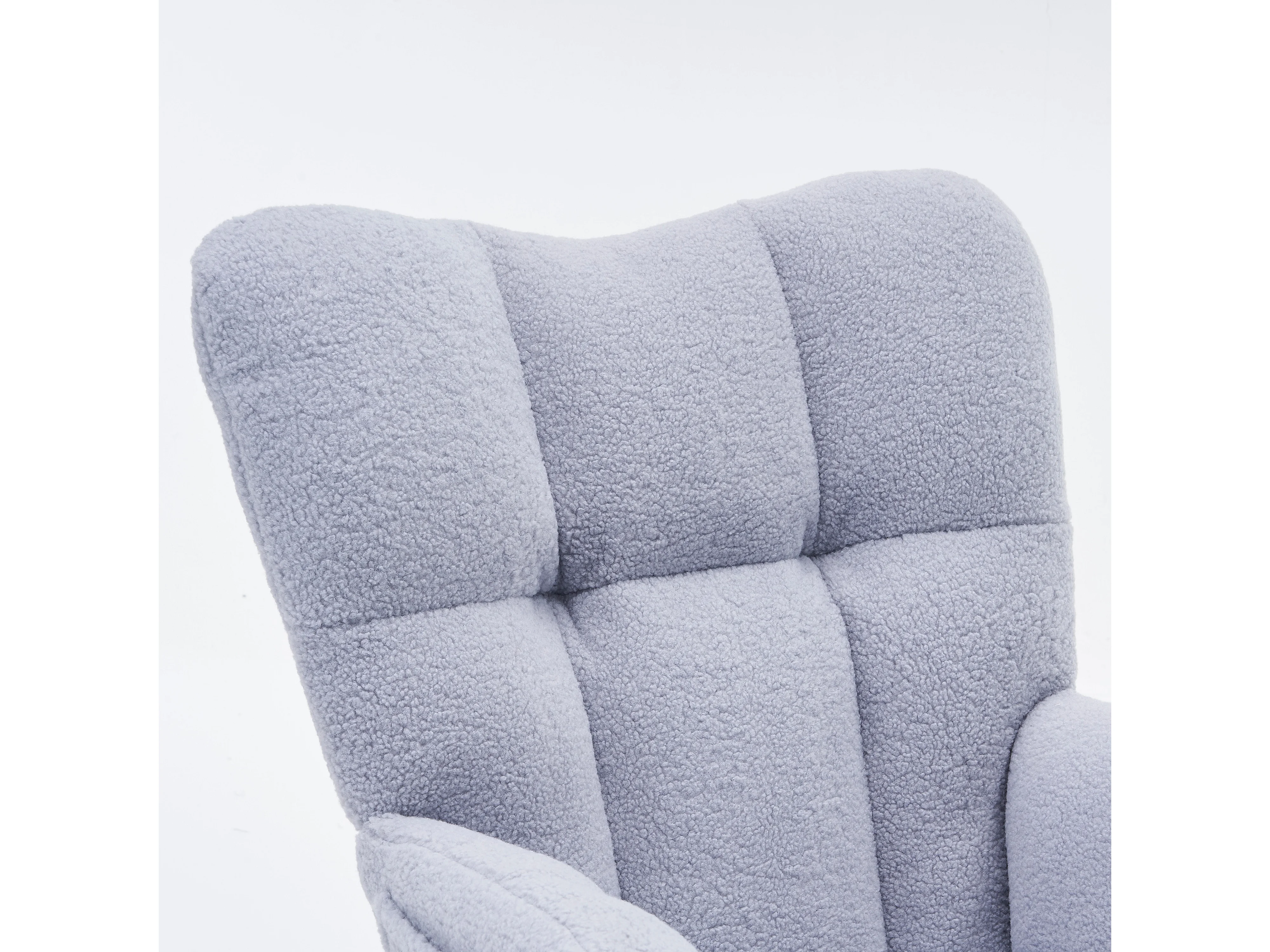 Tapicerowany fotel bujany, plusz, szary fotel bujany z wysuwanym podnóżkiem, metalowa rama