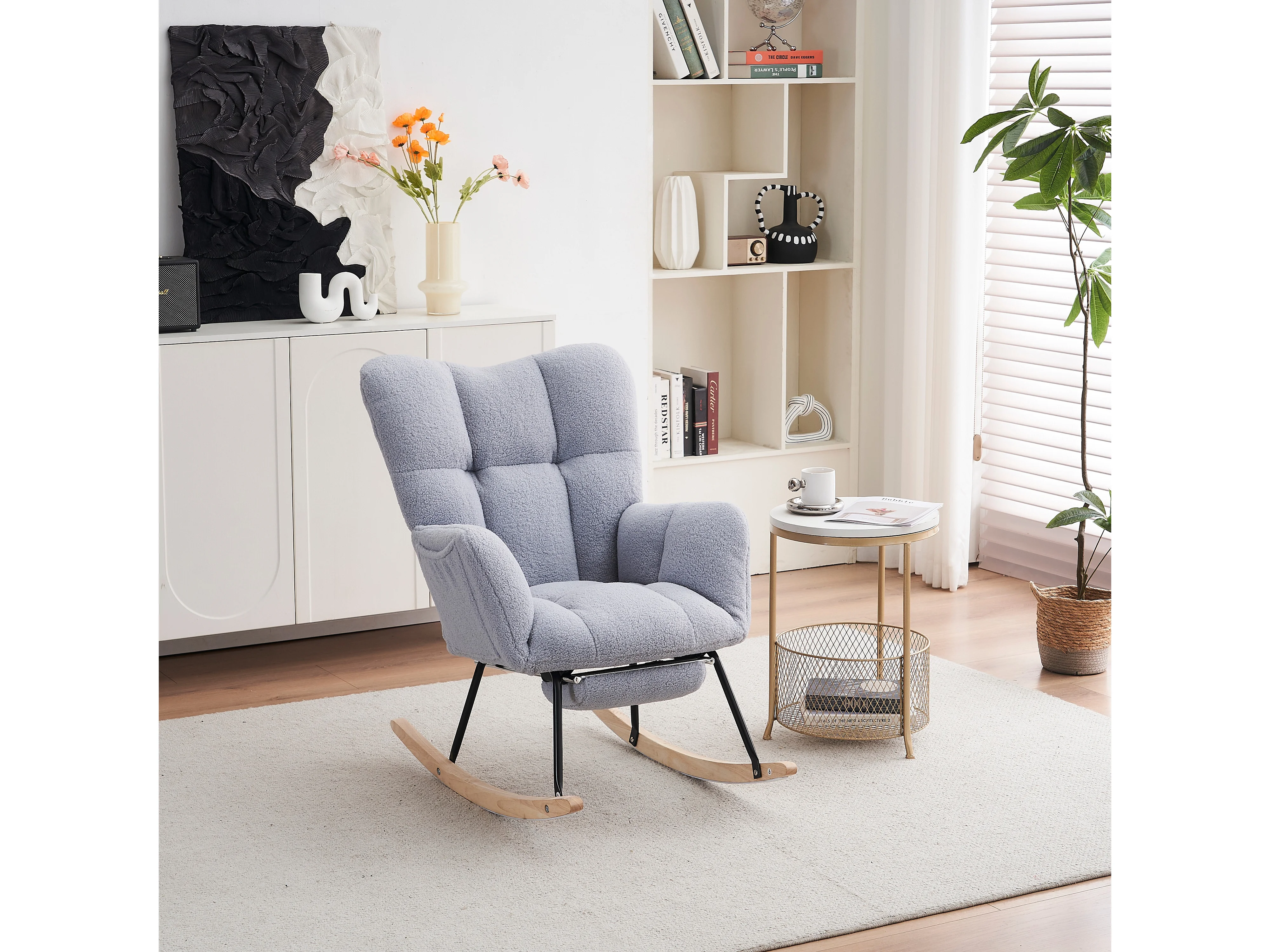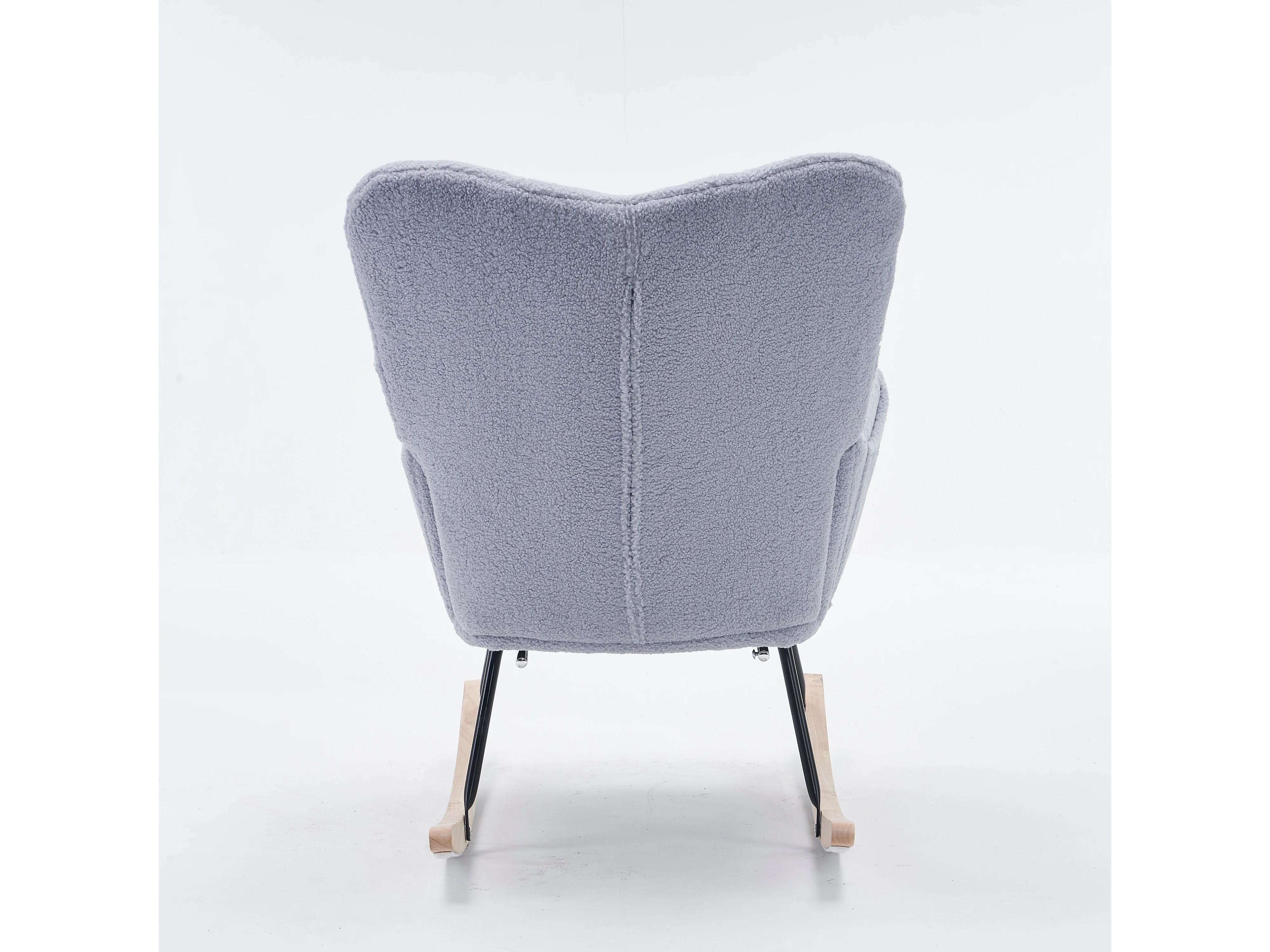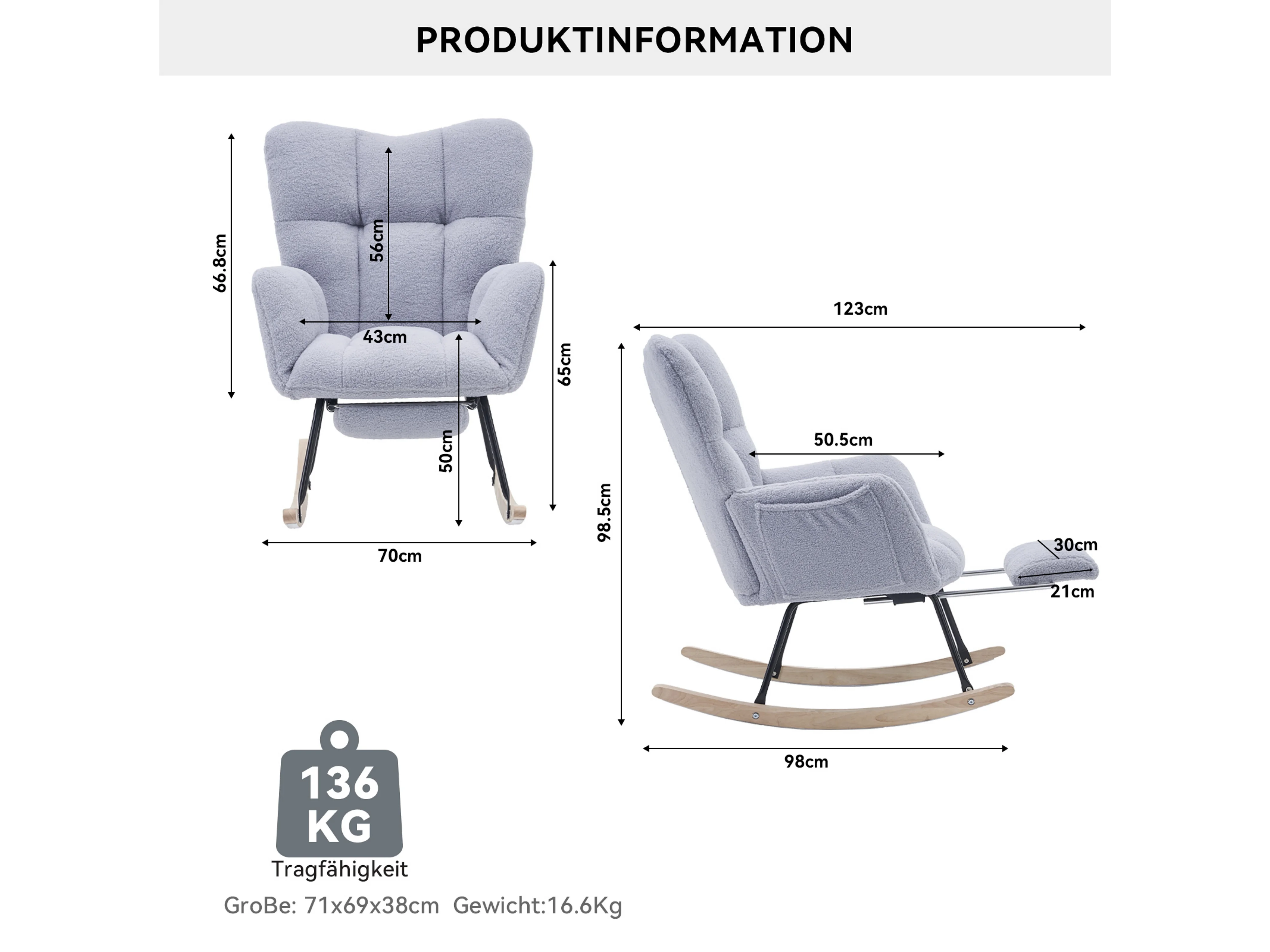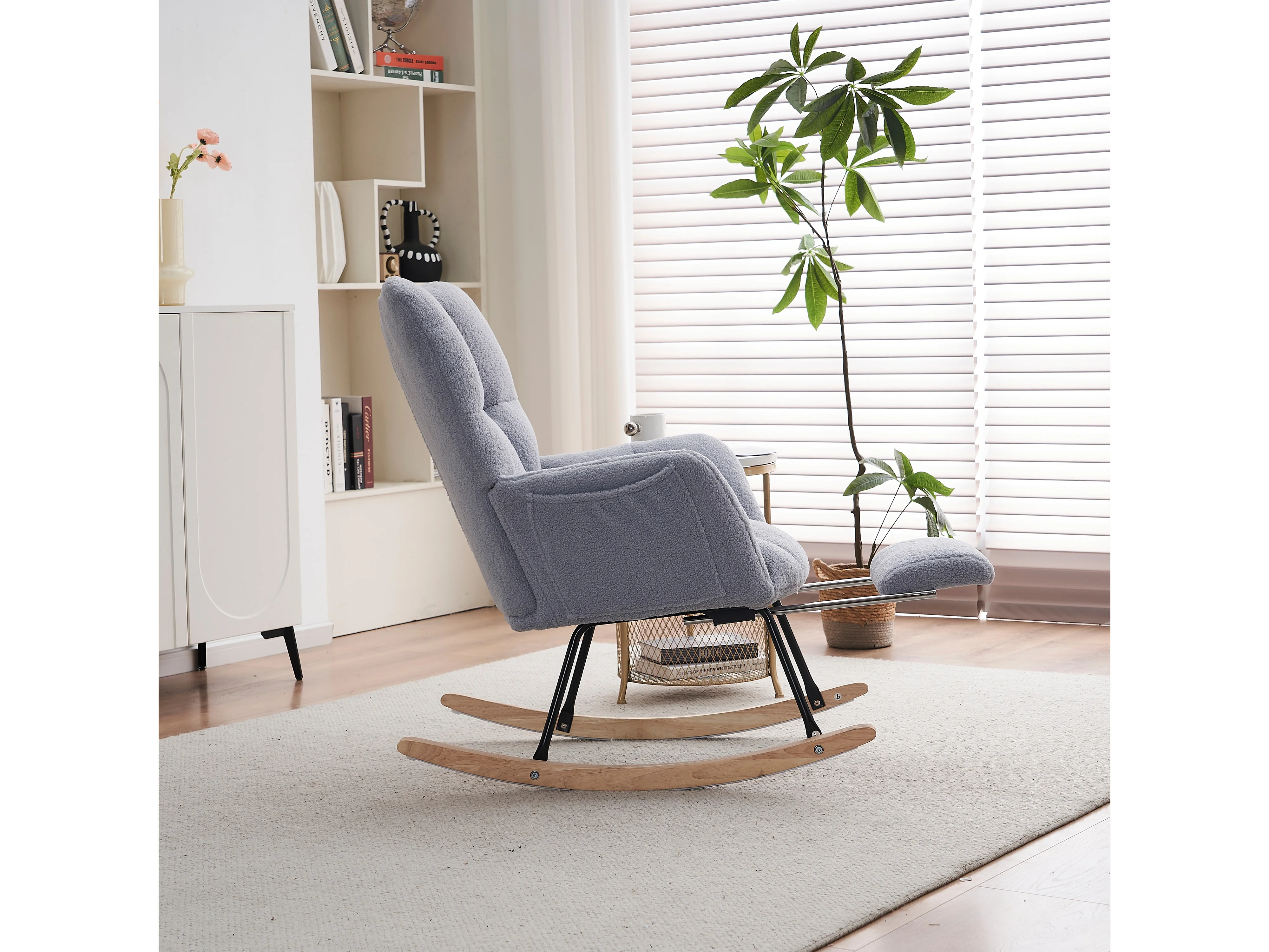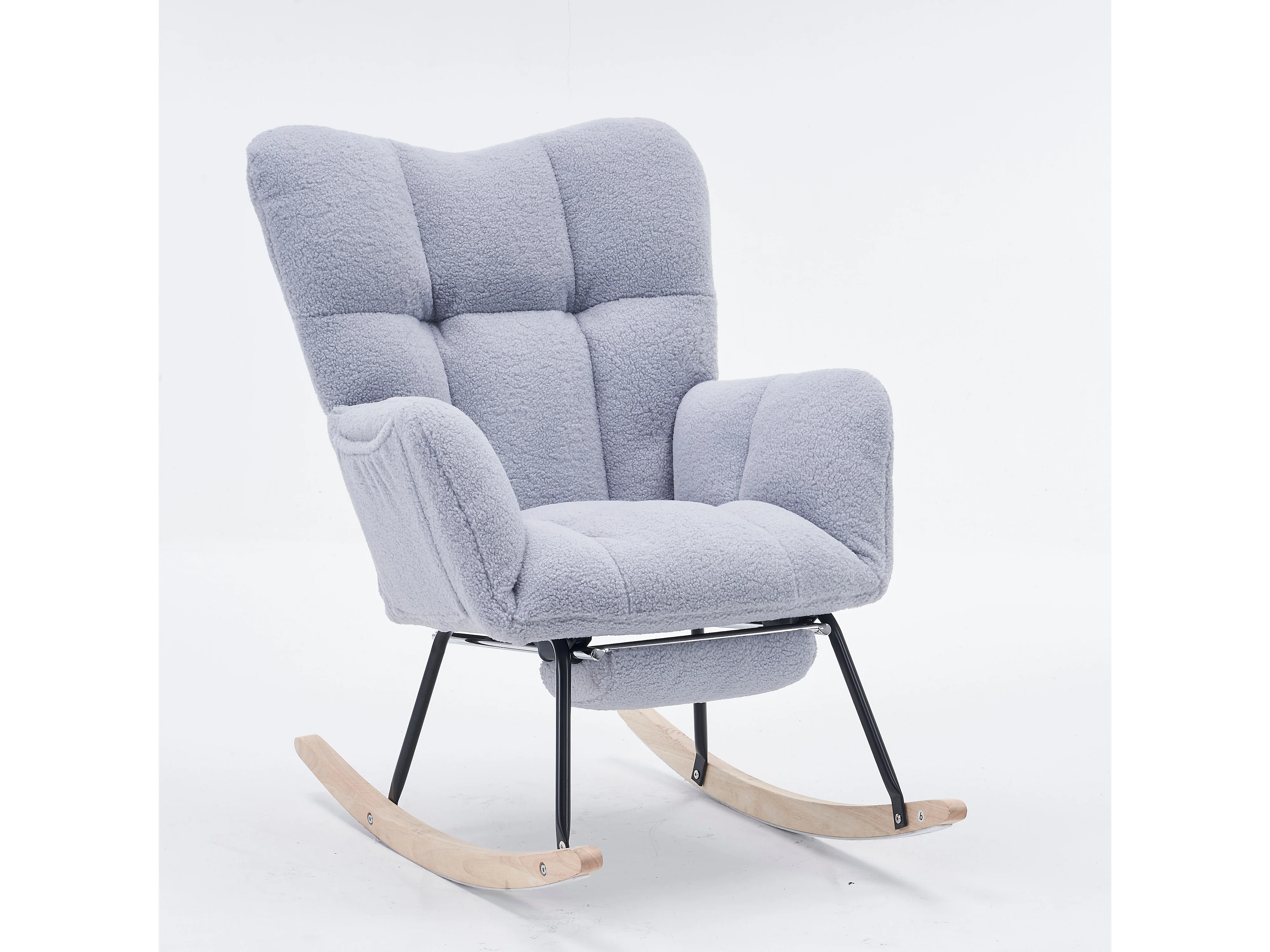 Tapicerowany fotel bujany, plusz, szary fotel bujany z wysuwanym podnóżkiem, metalowa rama