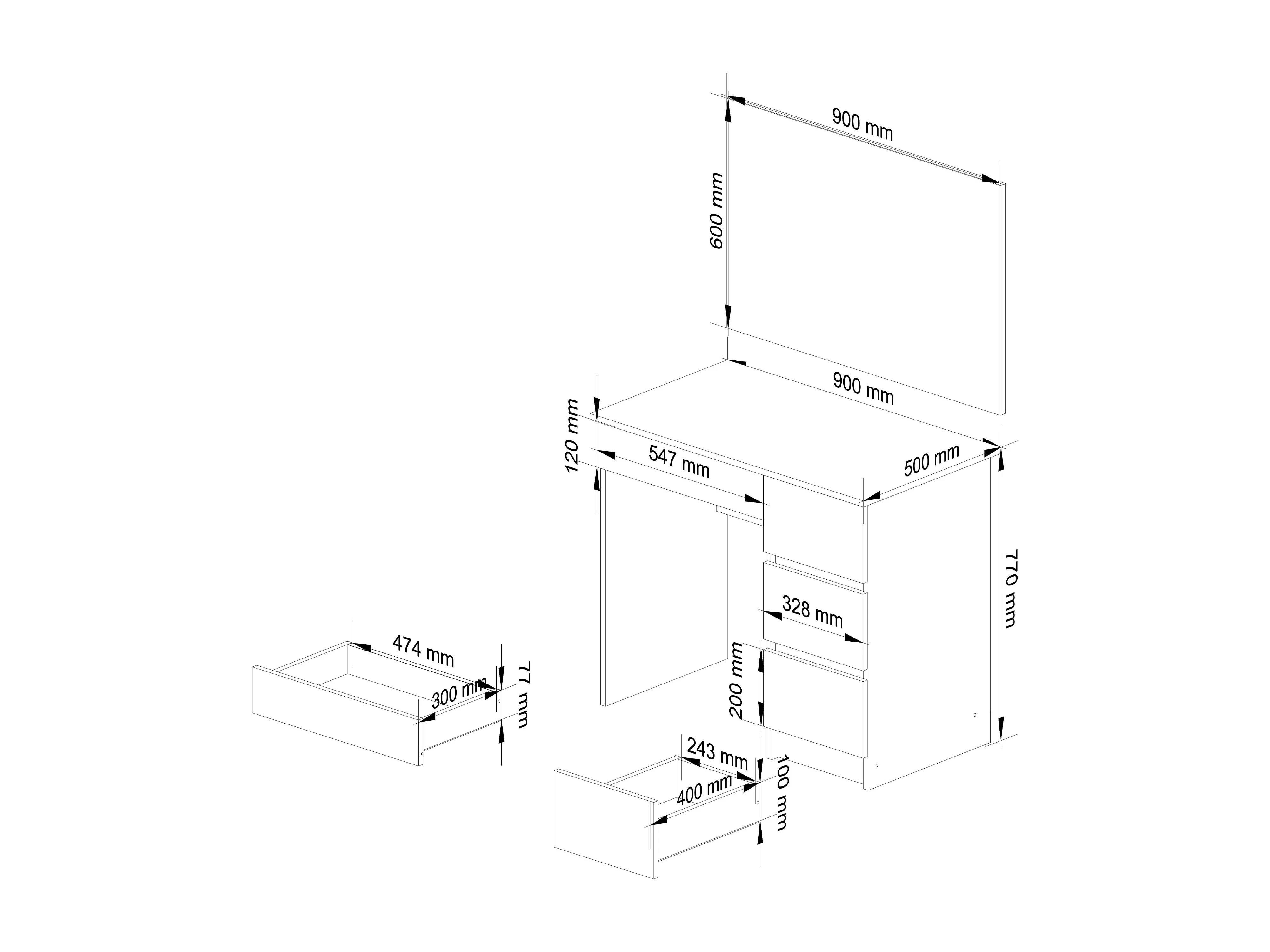 Toaletka AKORD T6 Biała 90 cm z lustrem 900x600 prawa 4 szuflady kolor Biały mat 90x50x142 cm