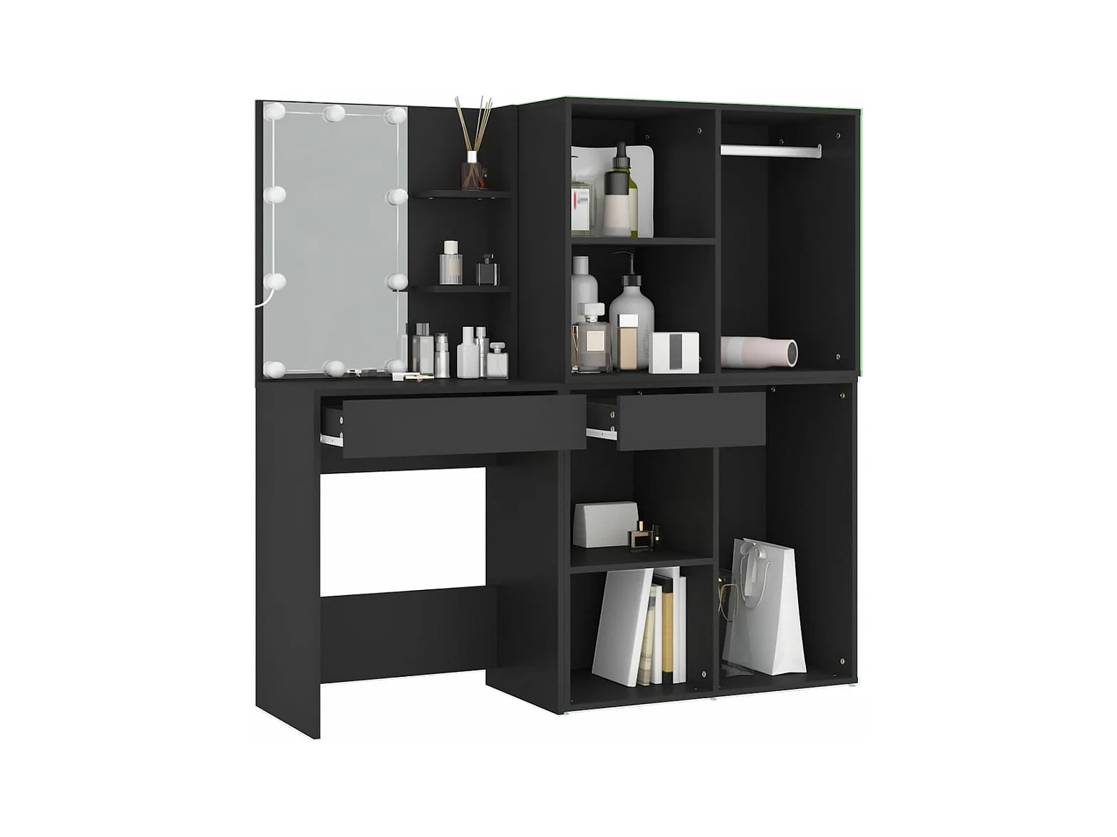 Toaletka z oświetleniem LED i szafą z czarnego drewna inżynieryjnego oraz dużą przestrzenią do przechowywania