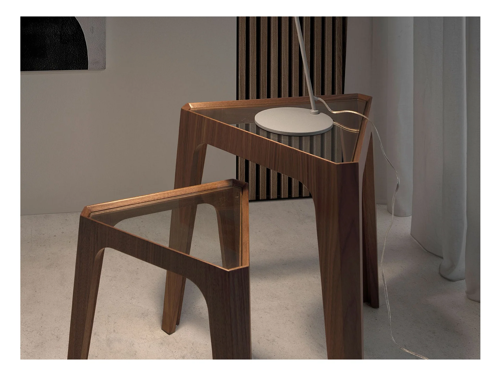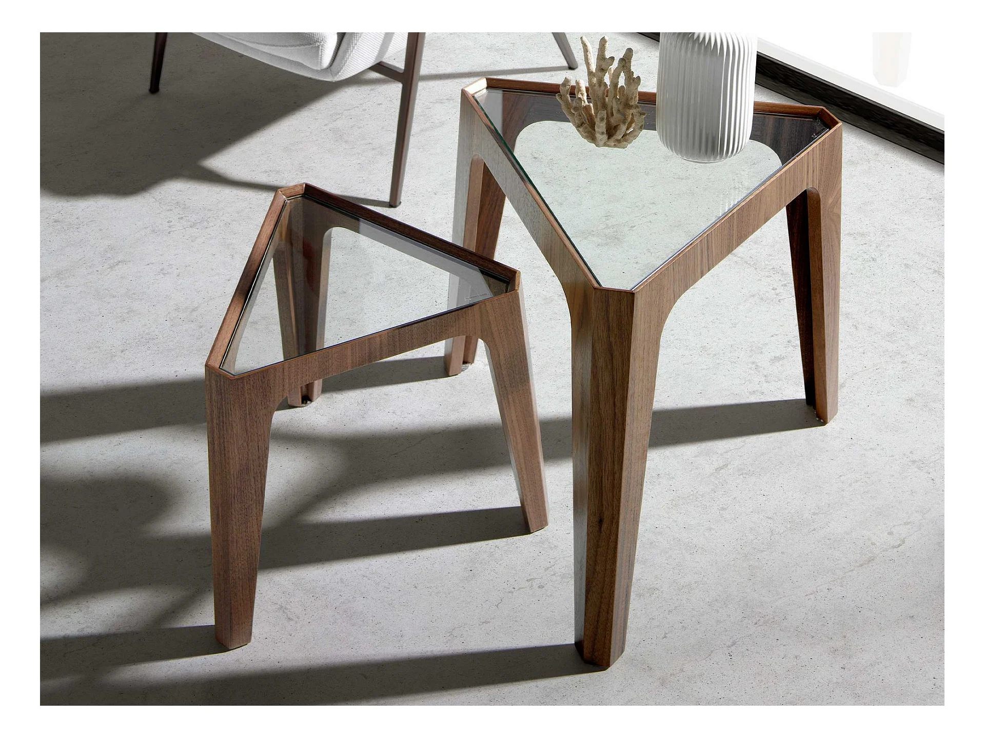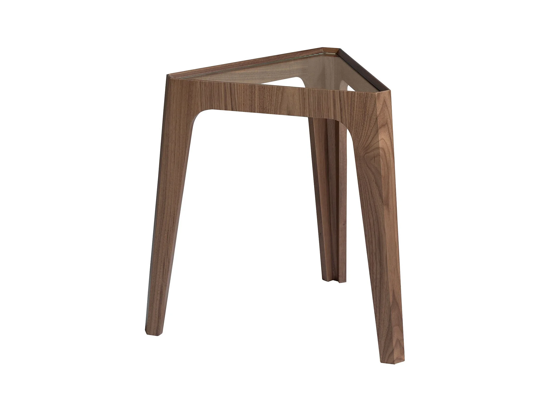 Trójkątny stolik narożny z hartowanego szkła i orzecha włoskiego