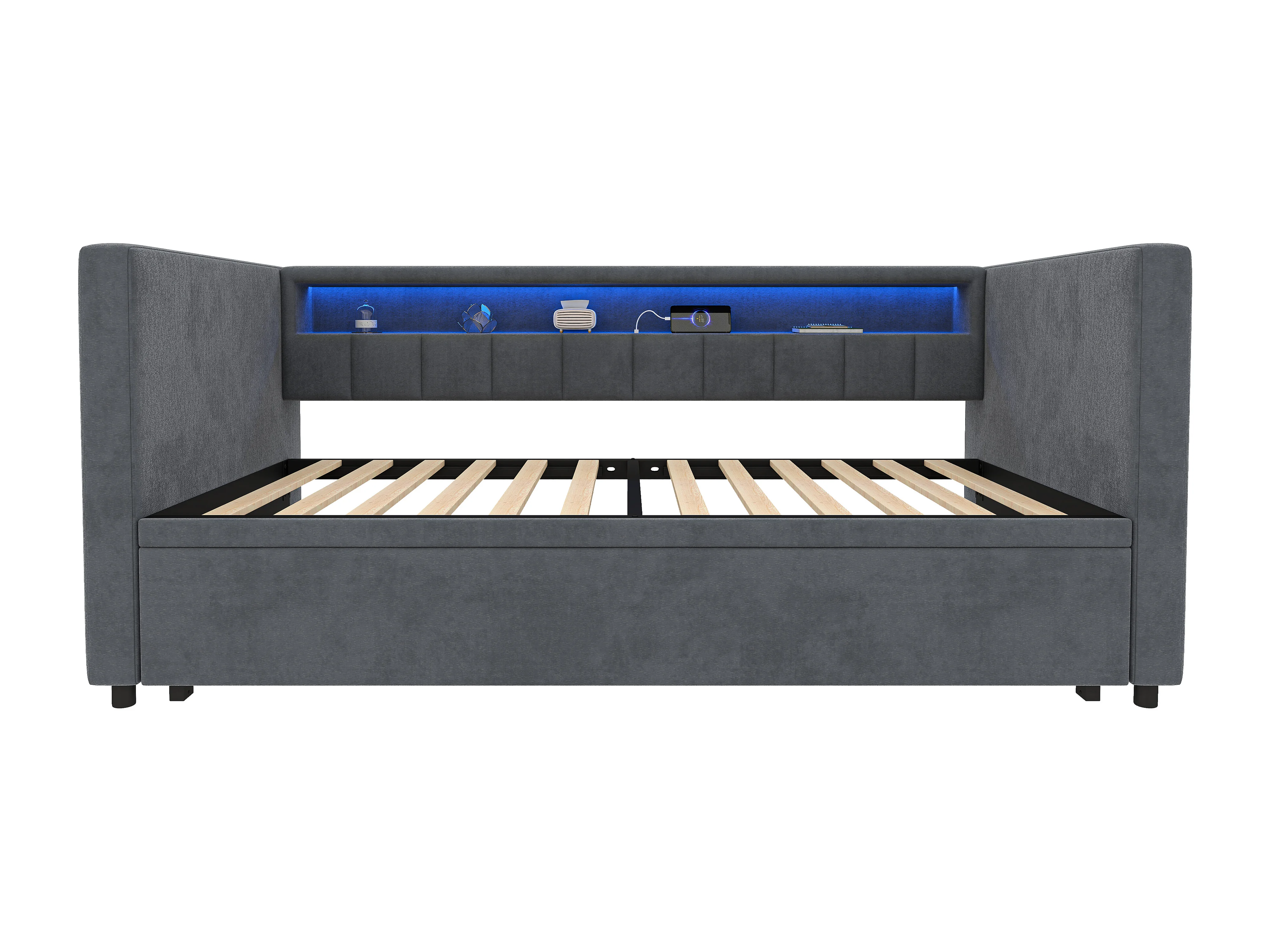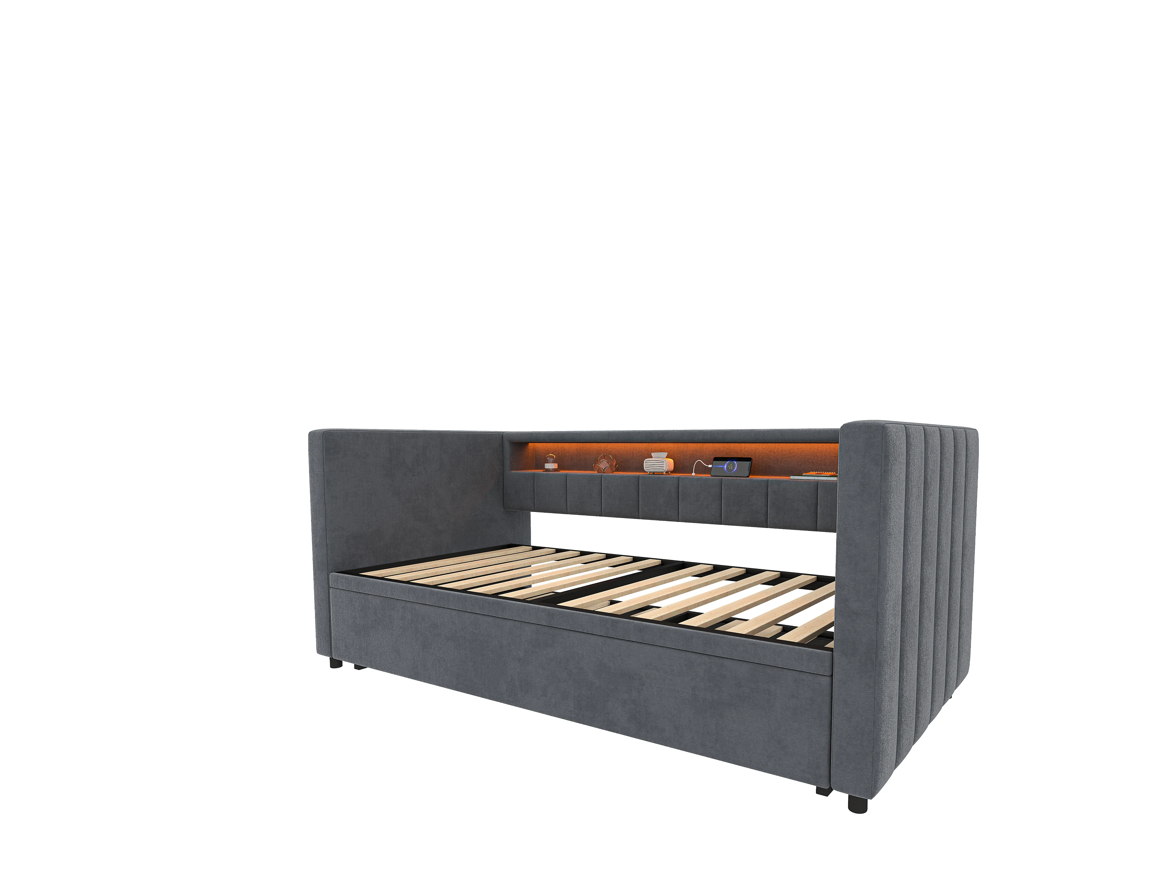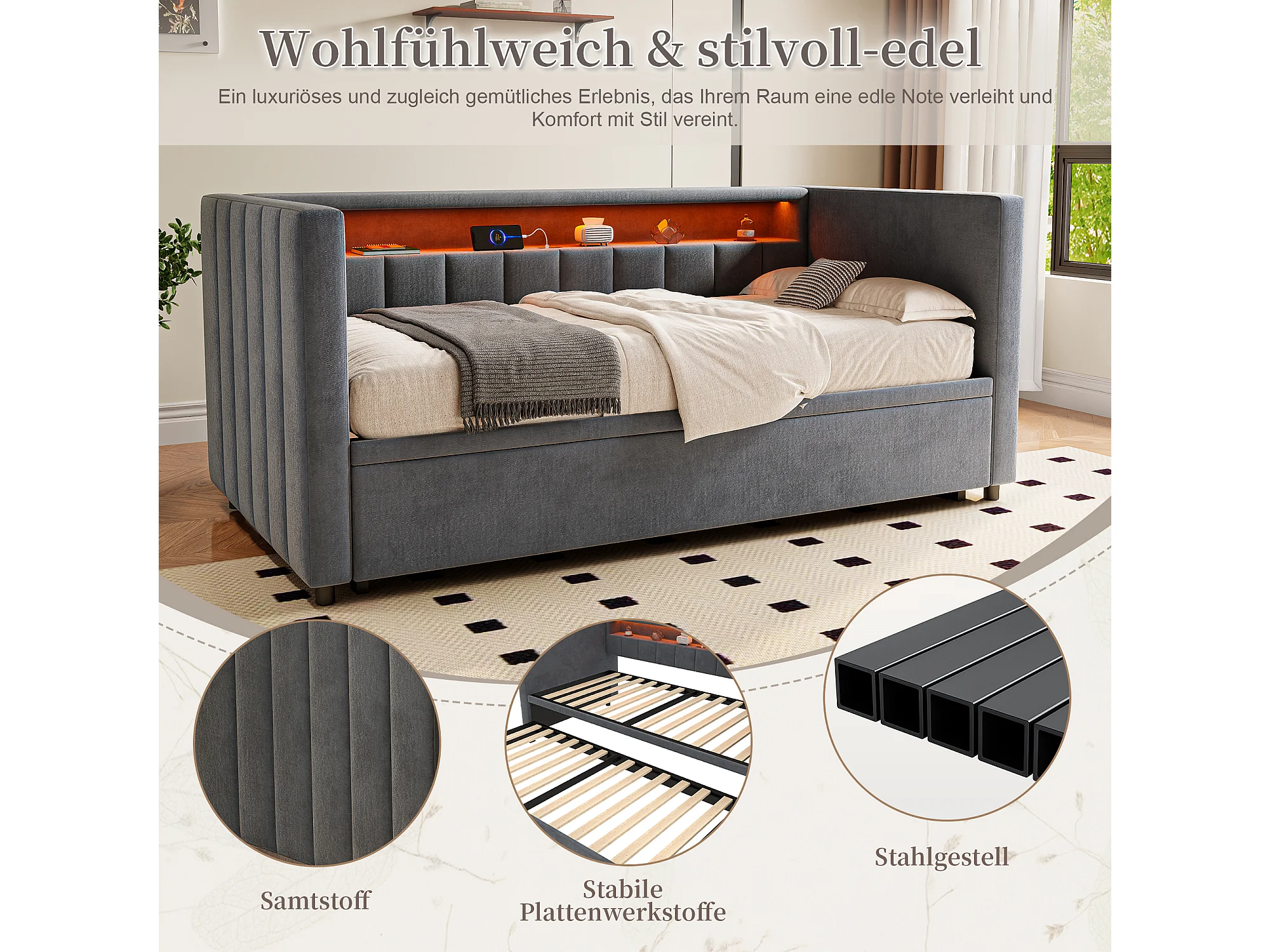 Wielofunkcyjna sofa rozkładana 90x190 cm z wysuwanym łóżkiem, portem USB typu C, oświetleniem LED, tapicerką welurową, schowkiem,szara