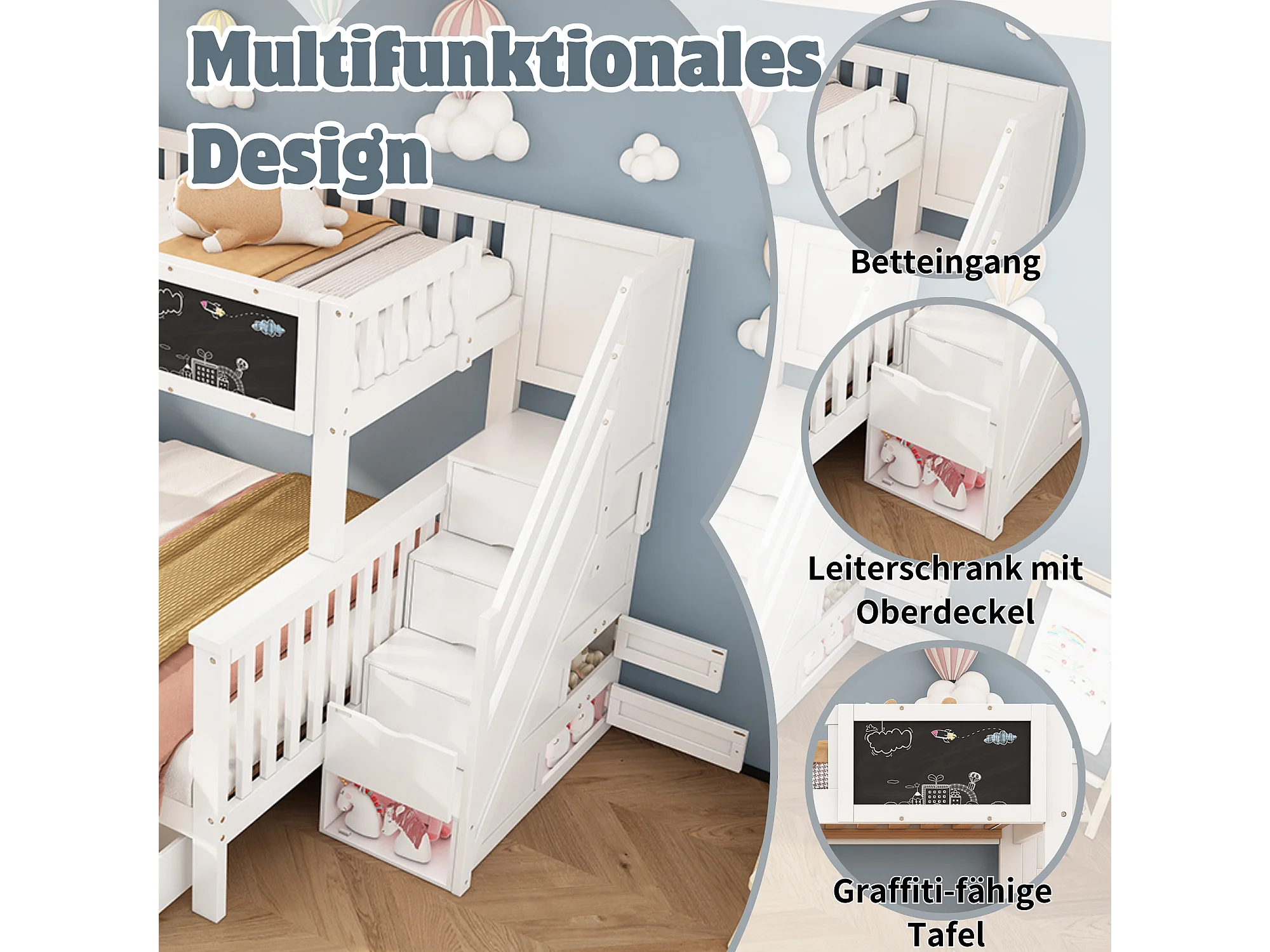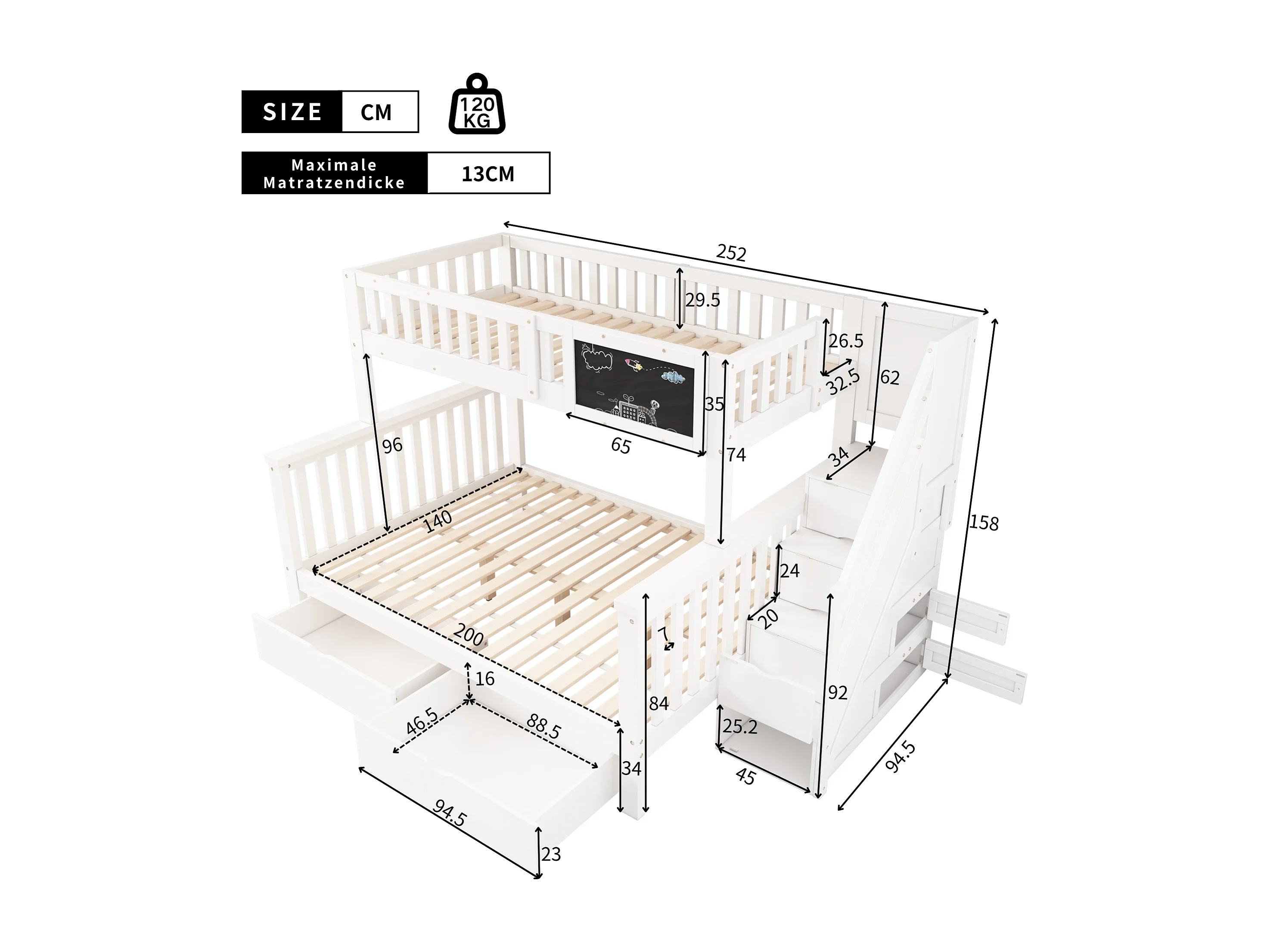 Wielofunkcyjne łóżko piętrowe dla dzieci - 90 x 200 cm + 140 x 200 cm - z blatem i szufladami - Drewno lite - bez materaca - białe