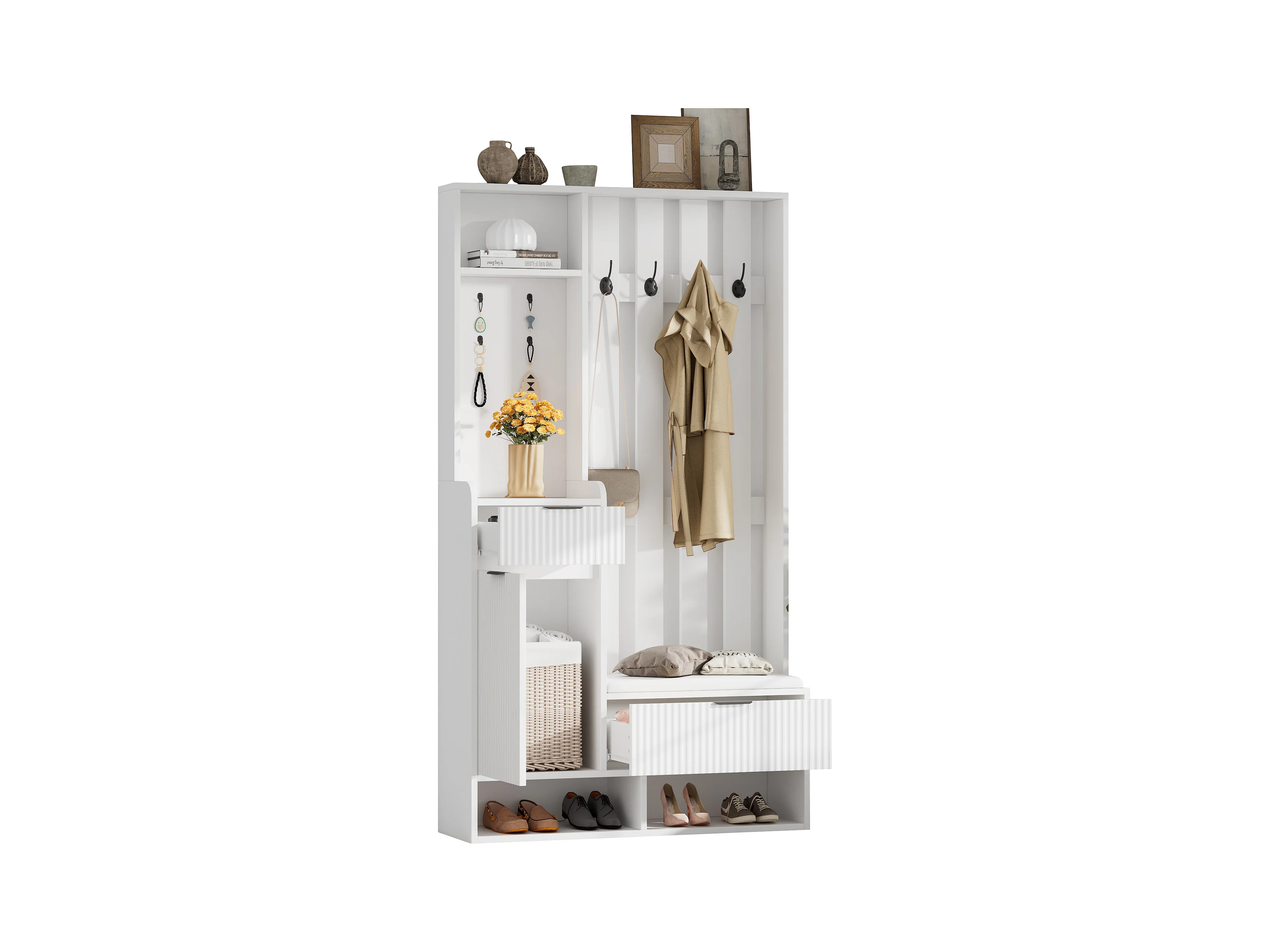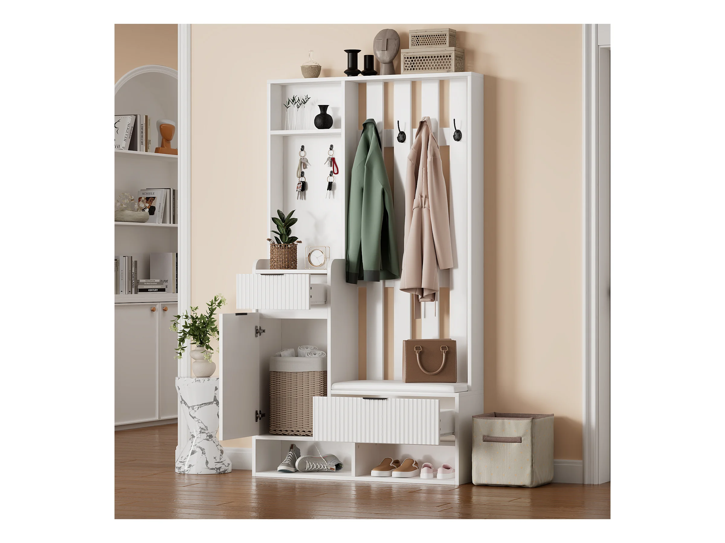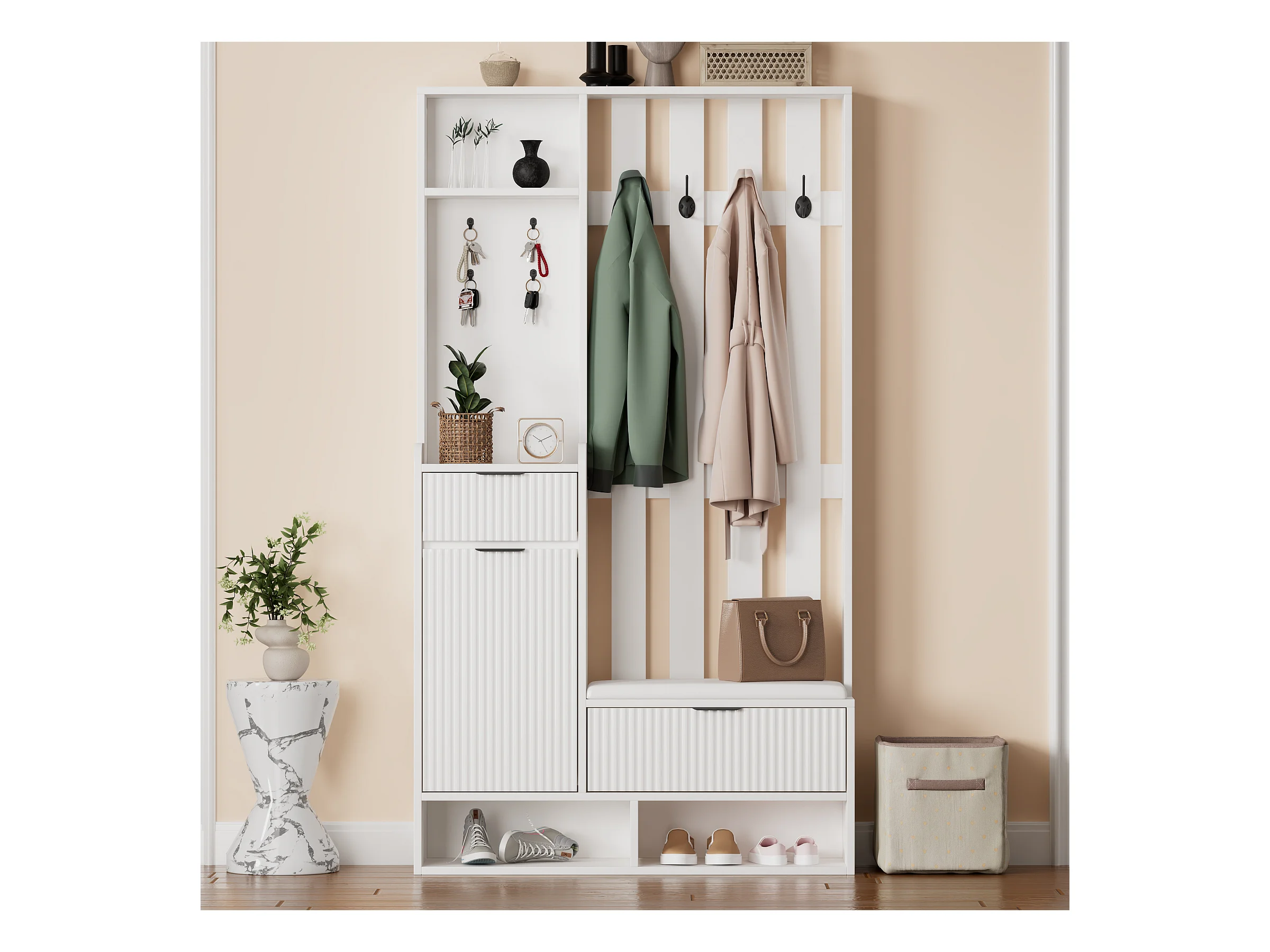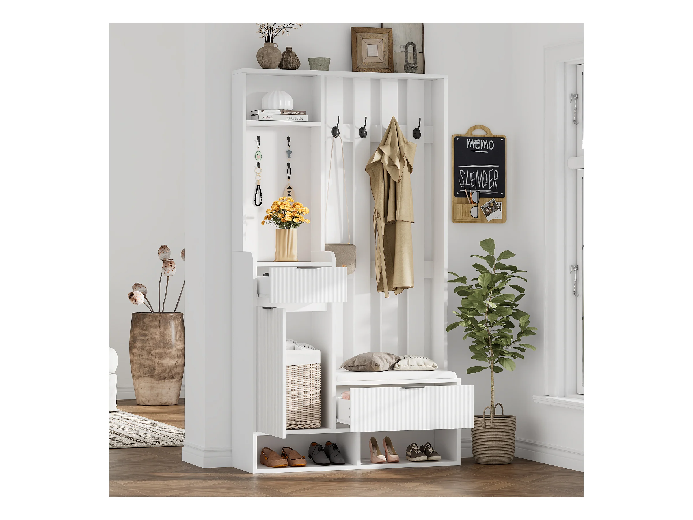 Wieszak 6 w 1 - 100 x 30 x 180 cm - z 8 haczykami + ławka na buty + szuflady - płyta wiórowa - biały